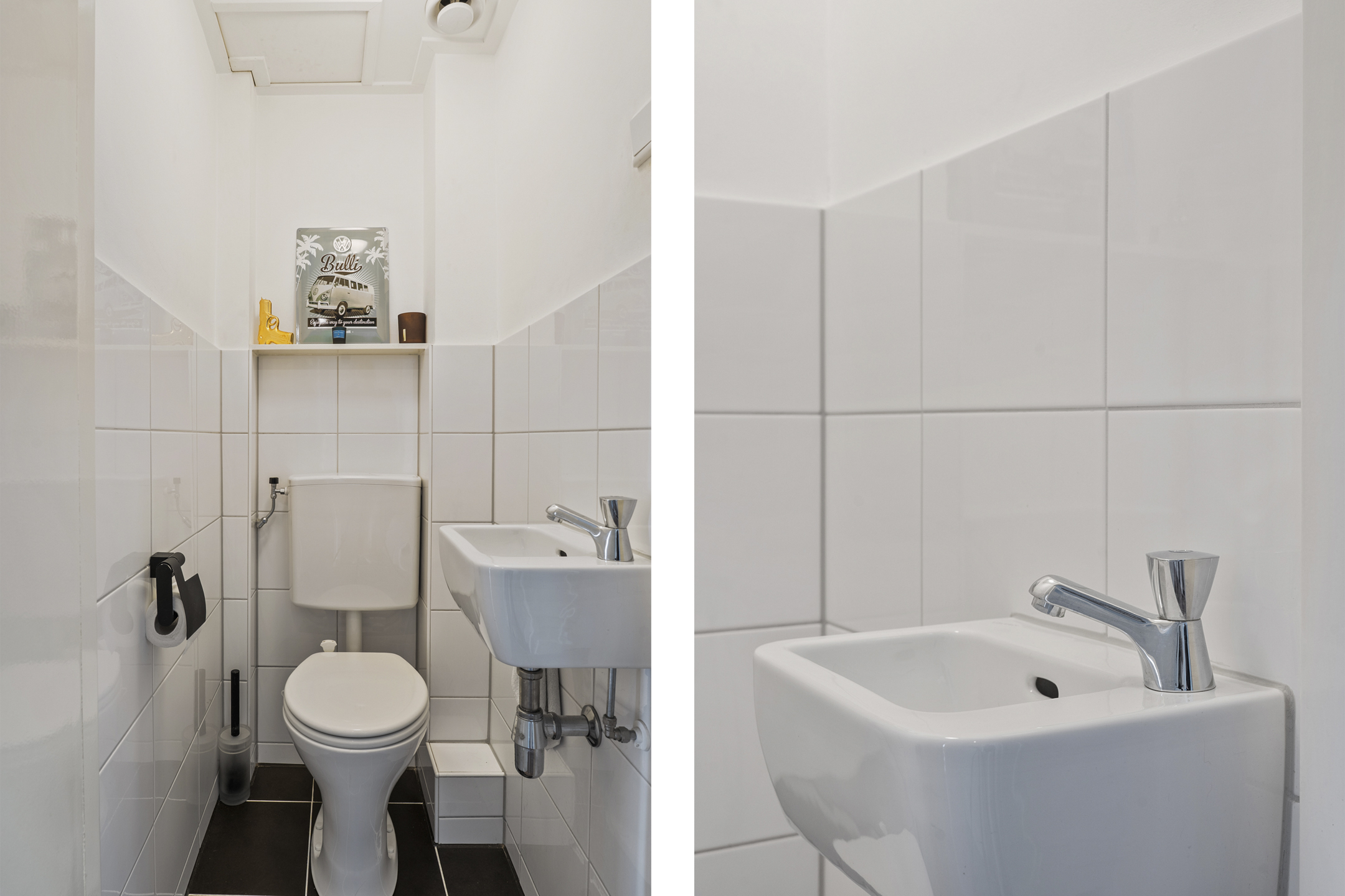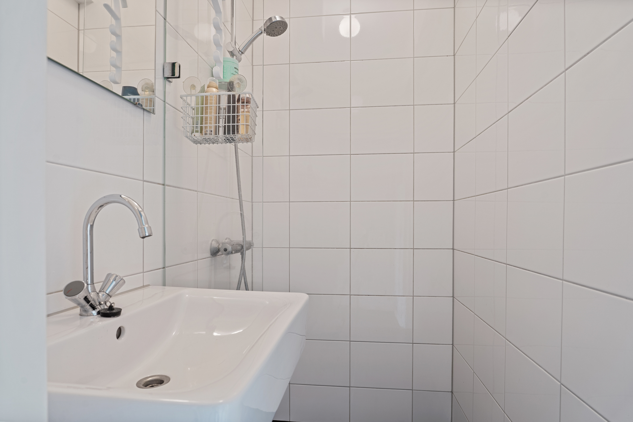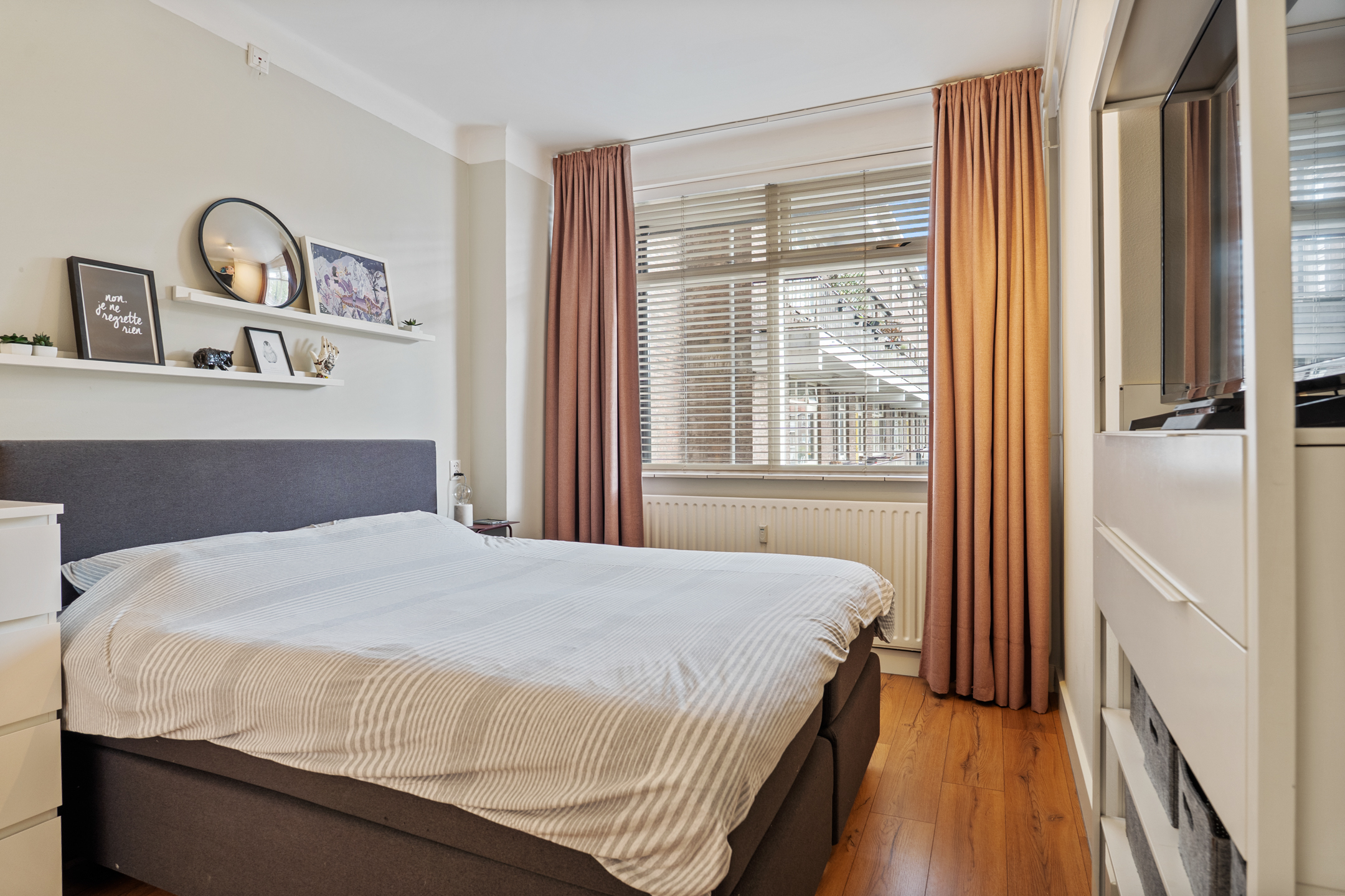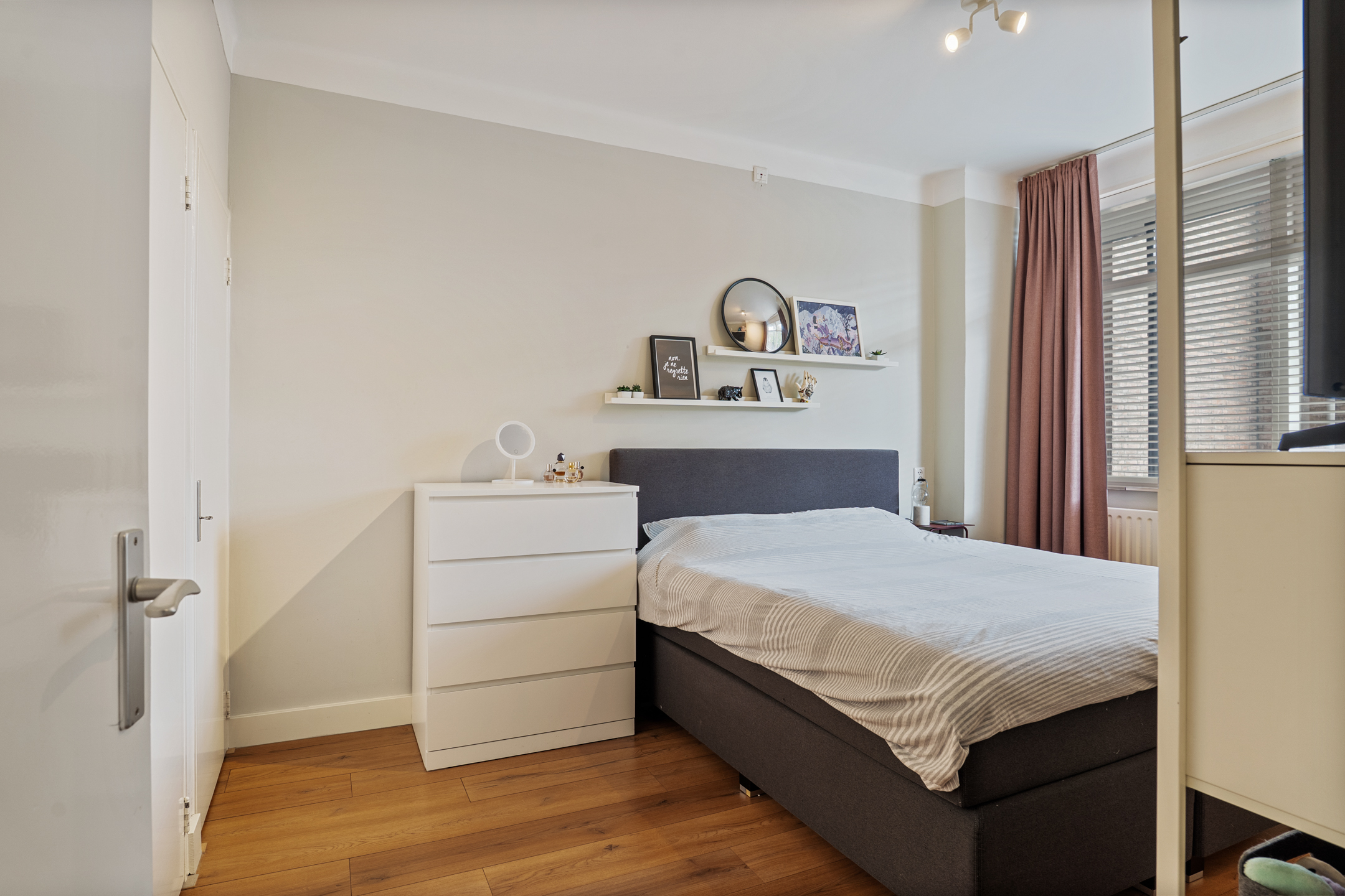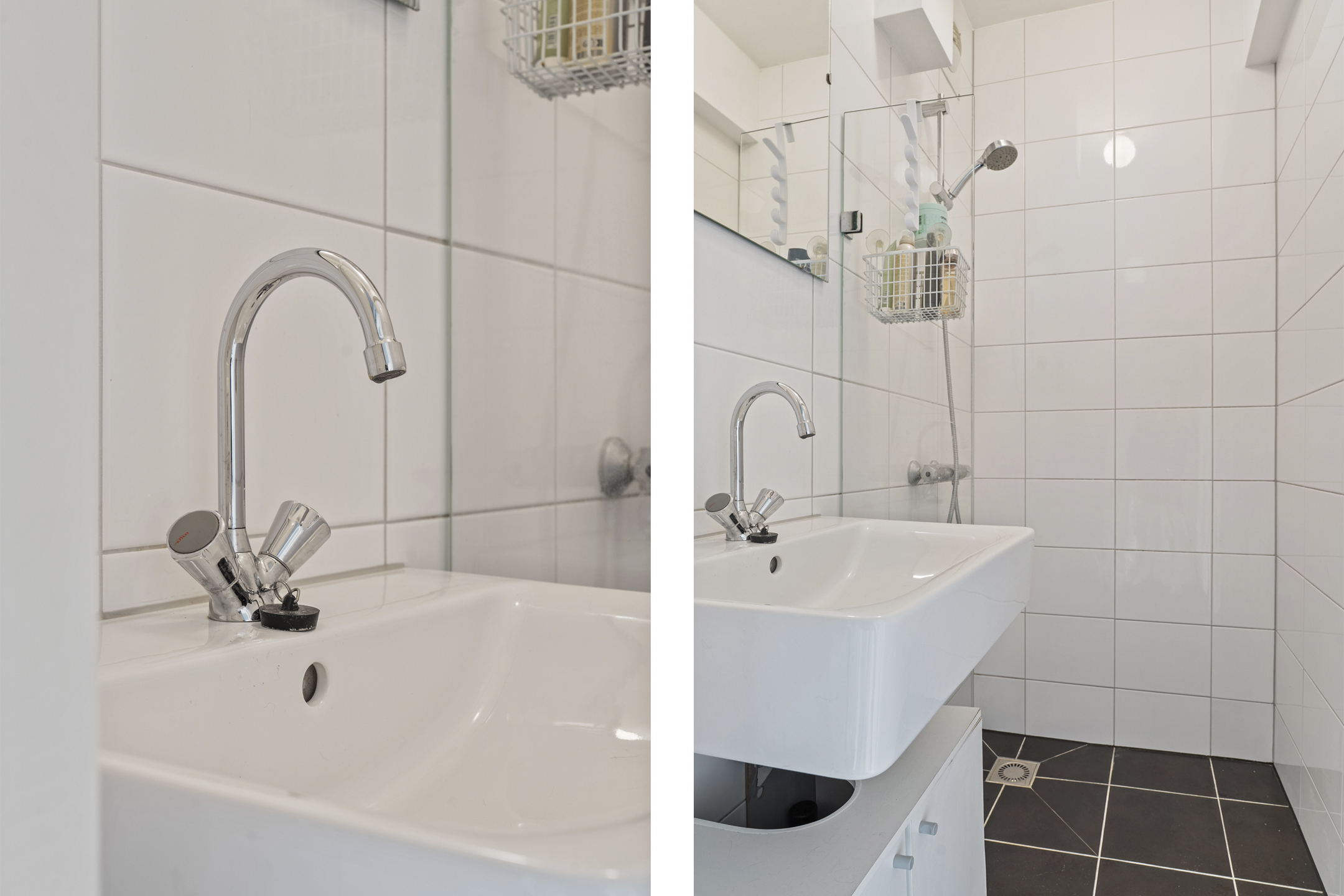 Aan de achterzijde ligt de ruime slaapkamer, rustig gelegen en groot genoeg voor een tweepersoonsbed en een kledingkast. De moderne badkamer is voorzien van witte wandtegels, donkere vloertegels, een inloopdouche met glazen wand en een stijlvol wastafelmeubel. Het toilet is separaat en netjes betegeld met een fonteintje.