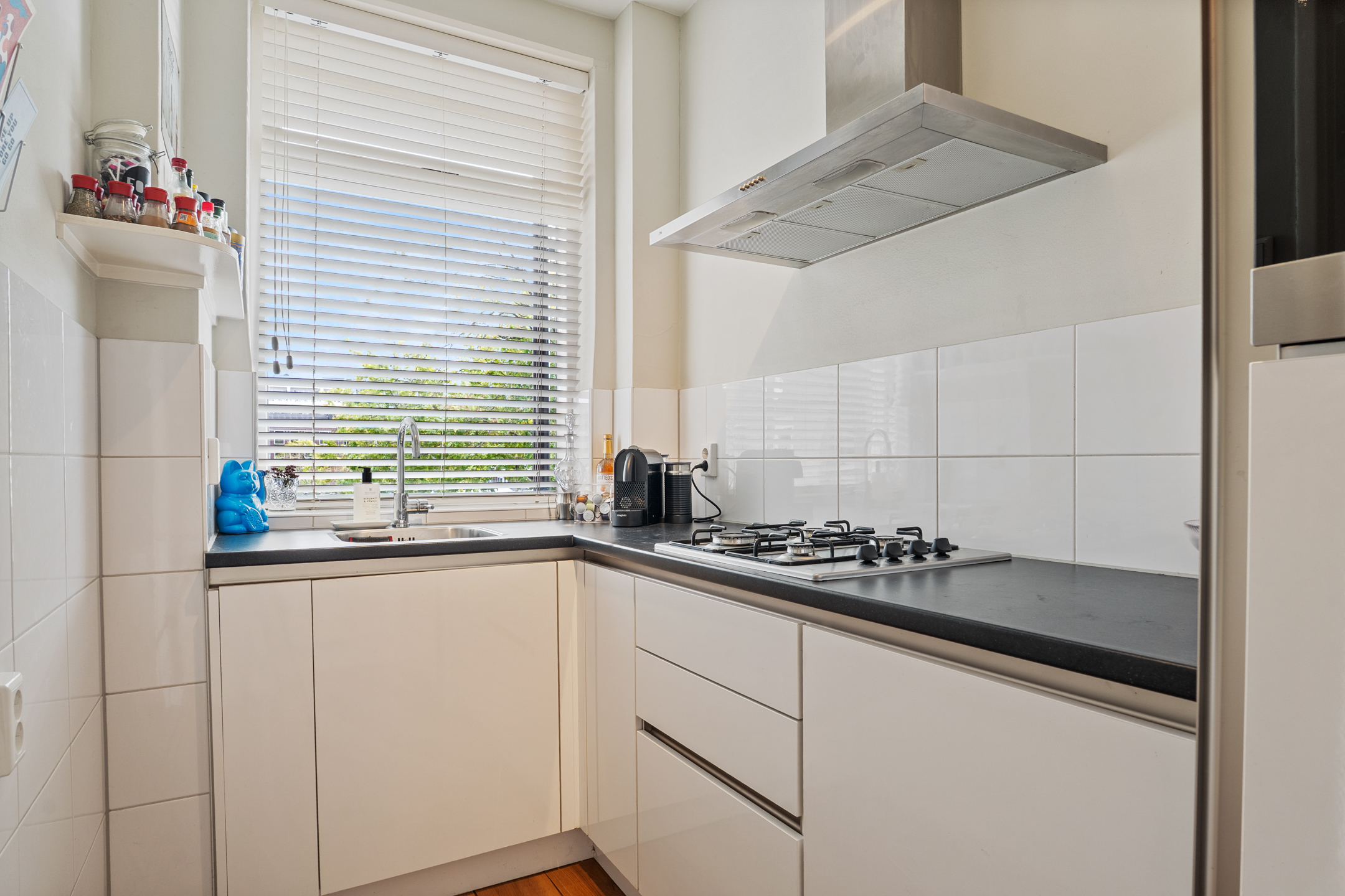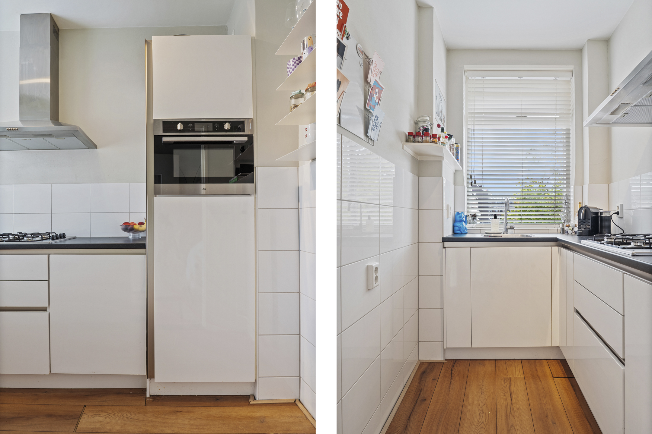 De gesloten keuken is praktisch ingericht en voorzien van een gaskookplaat, afzuigkap, oven en koelkast. Ook hier zorgt het grote raam voor veel natuurlijk licht.
