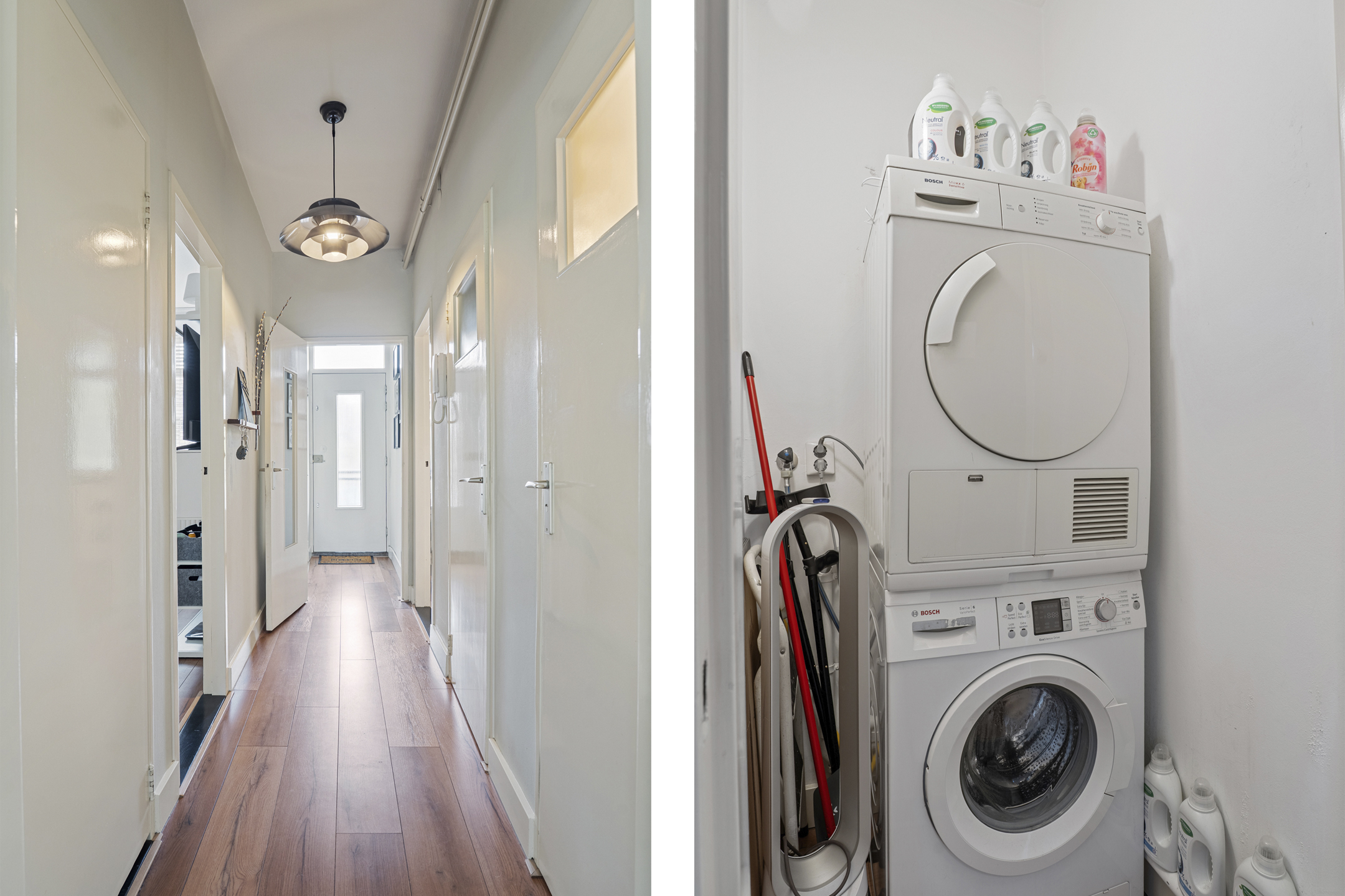 Daarnaast is er in de hal een bergkast met wasmachineaansluiting en extra bergruimte.