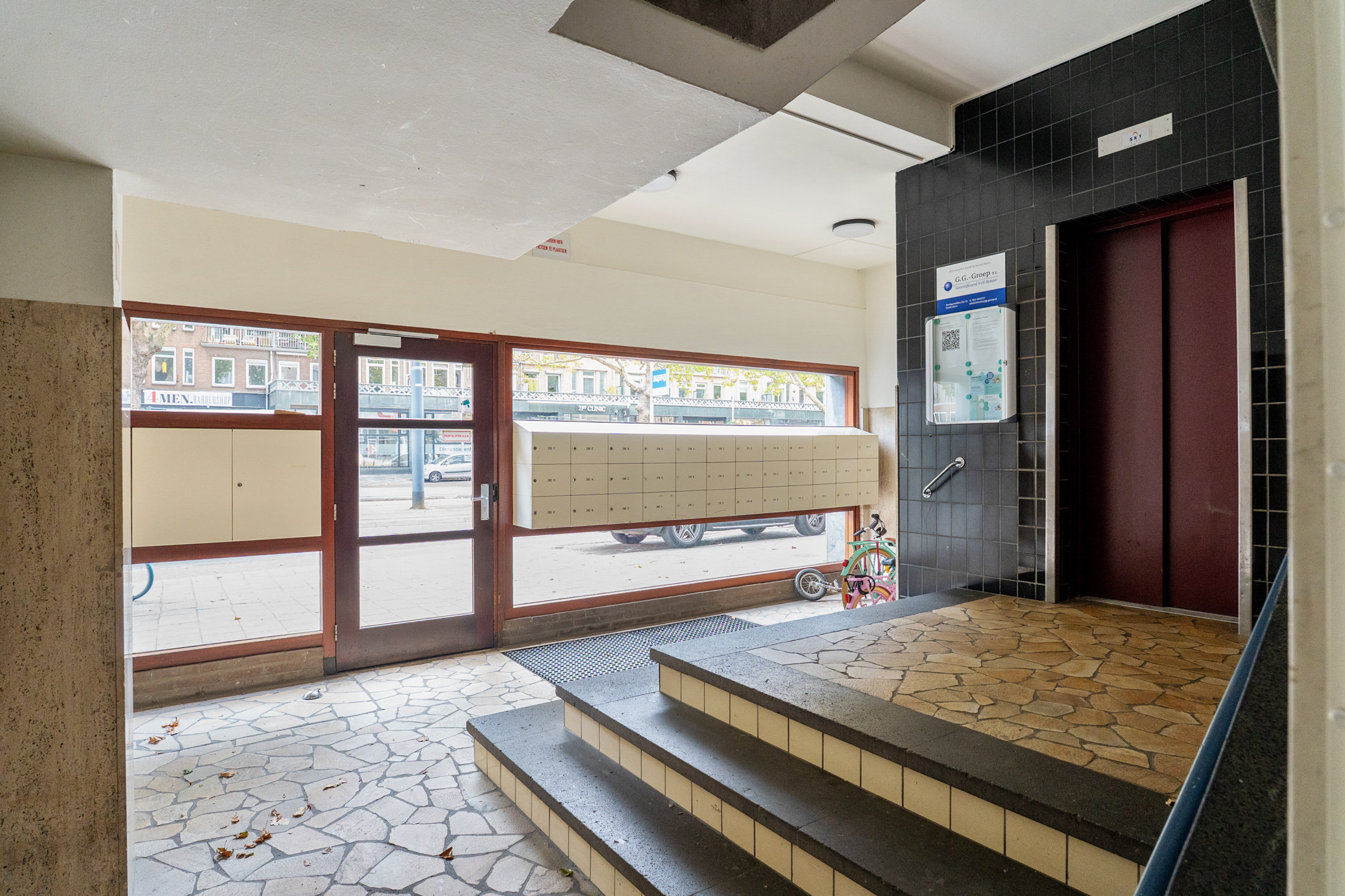 Gesloten portiek met brievenbussen, bellentableau en trappenhuis naar de bovengelegen woonlagen.