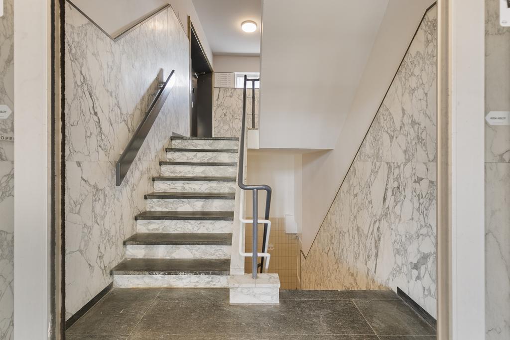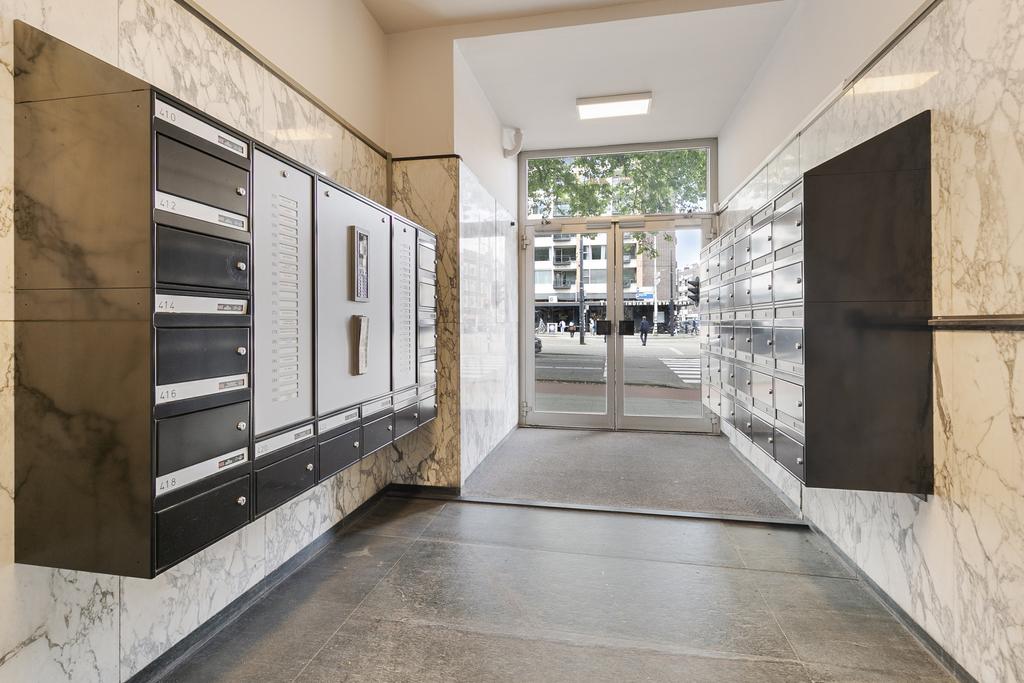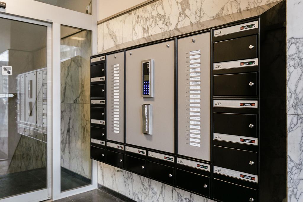 Centrale afgesloten hal met intercom, brievenbussen, bellentableau en bergingen en lift.