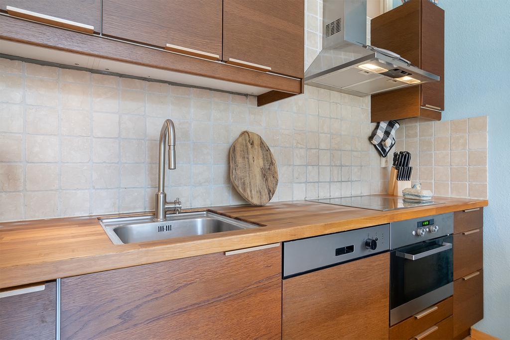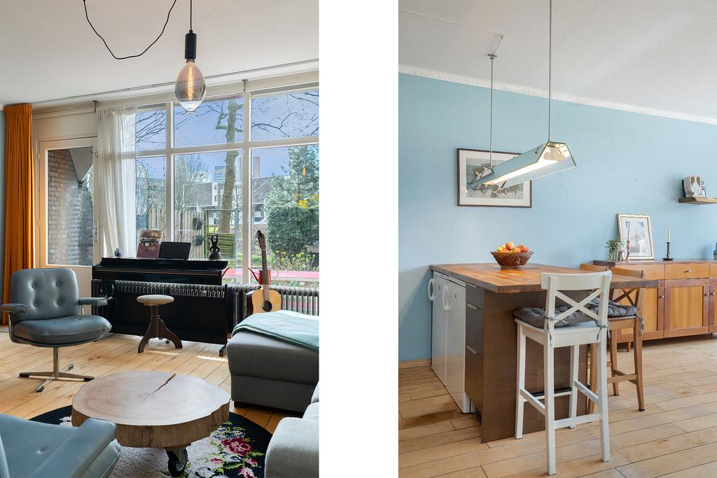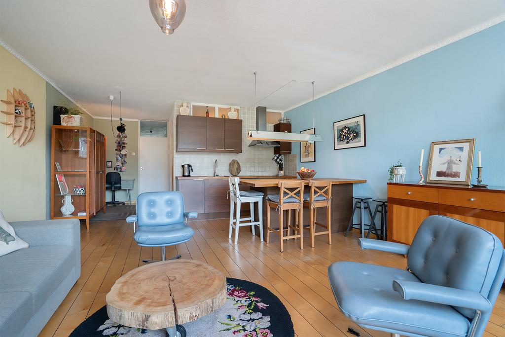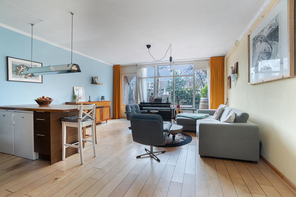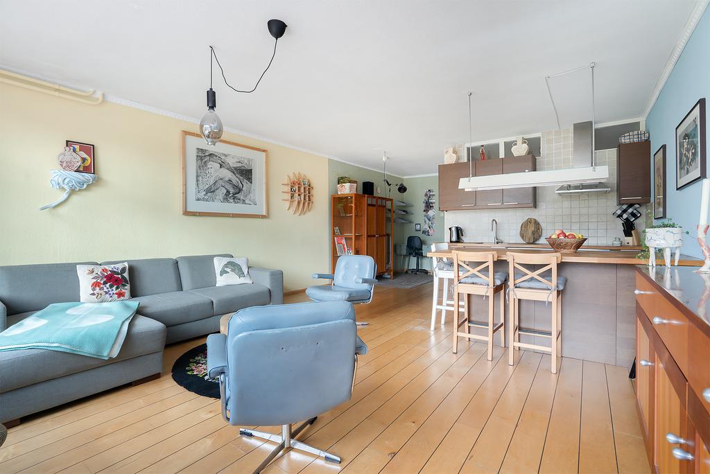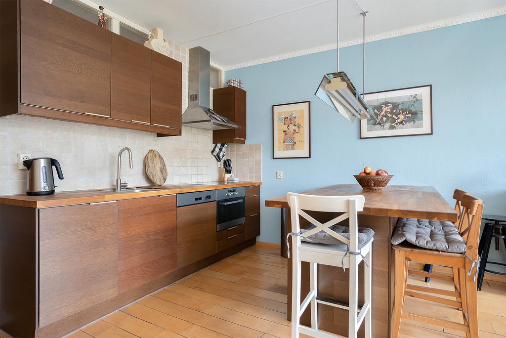 De ruime en lichte woonkamer met open keuken is erg ruim en voorzien van een mooie houten vloer. De open keuken is voorzien van inbouwapparatuur, opbergruimte en een gezellige bar.