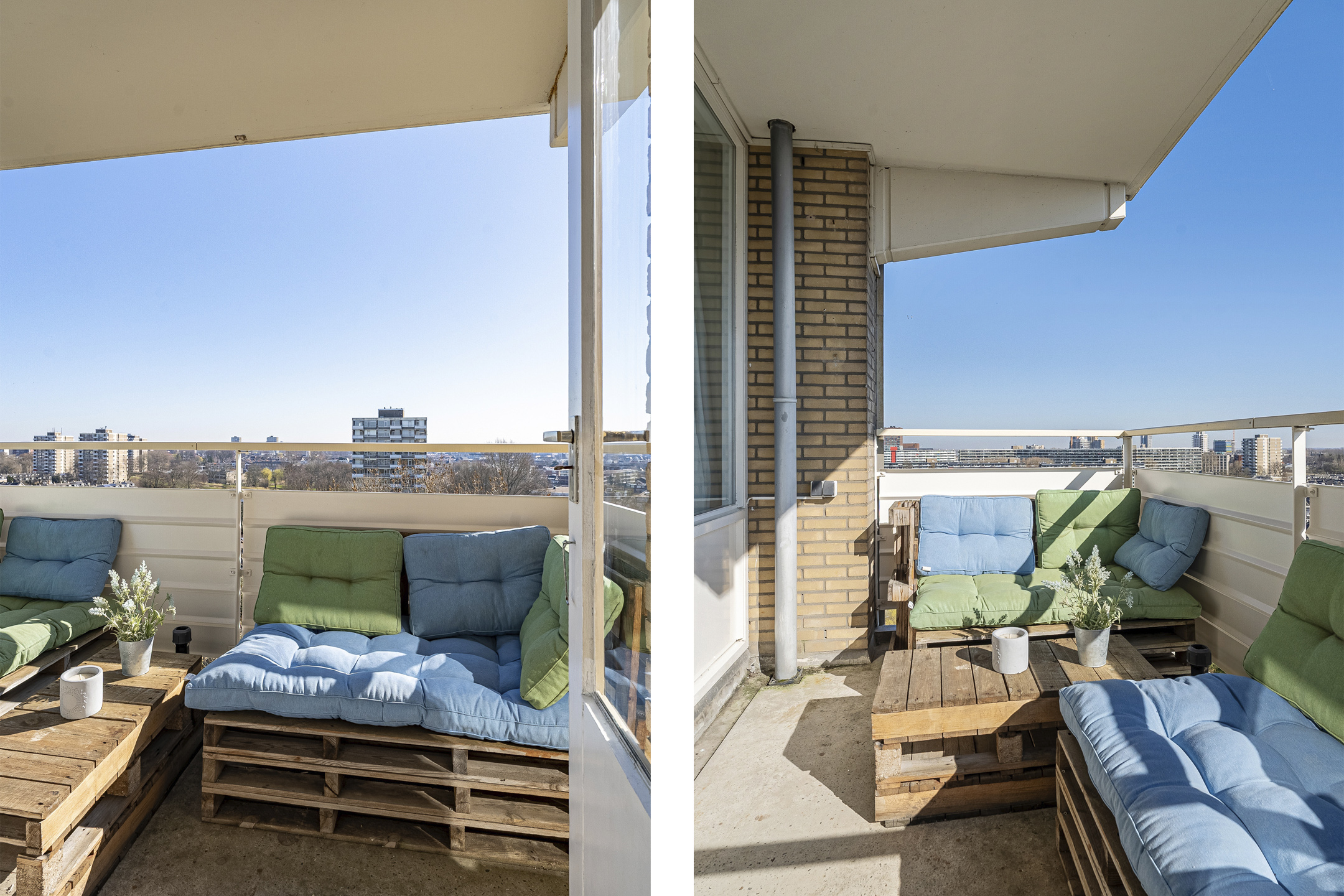 Het woningbrede balkon op het oosten biedt een vrij uitzicht over de stad en is de ideale plek om ’s ochtends te genieten van je koffie in de zon.