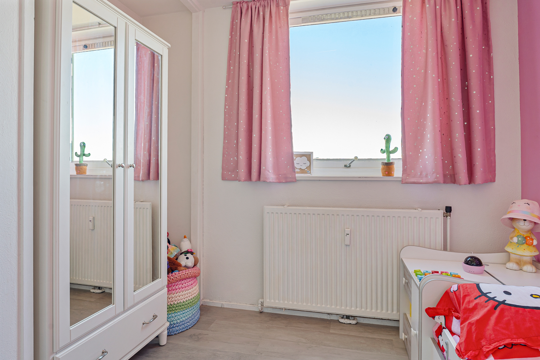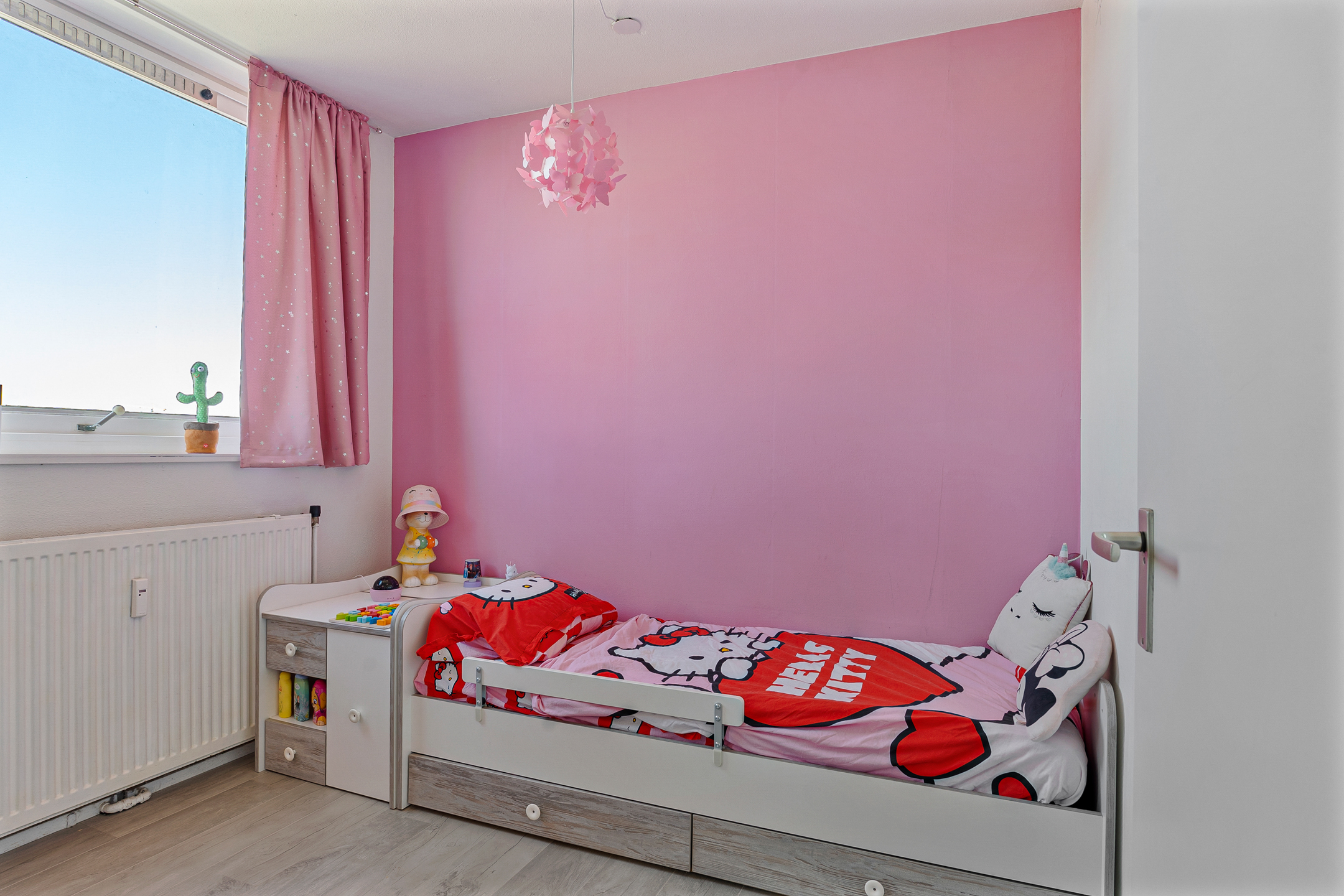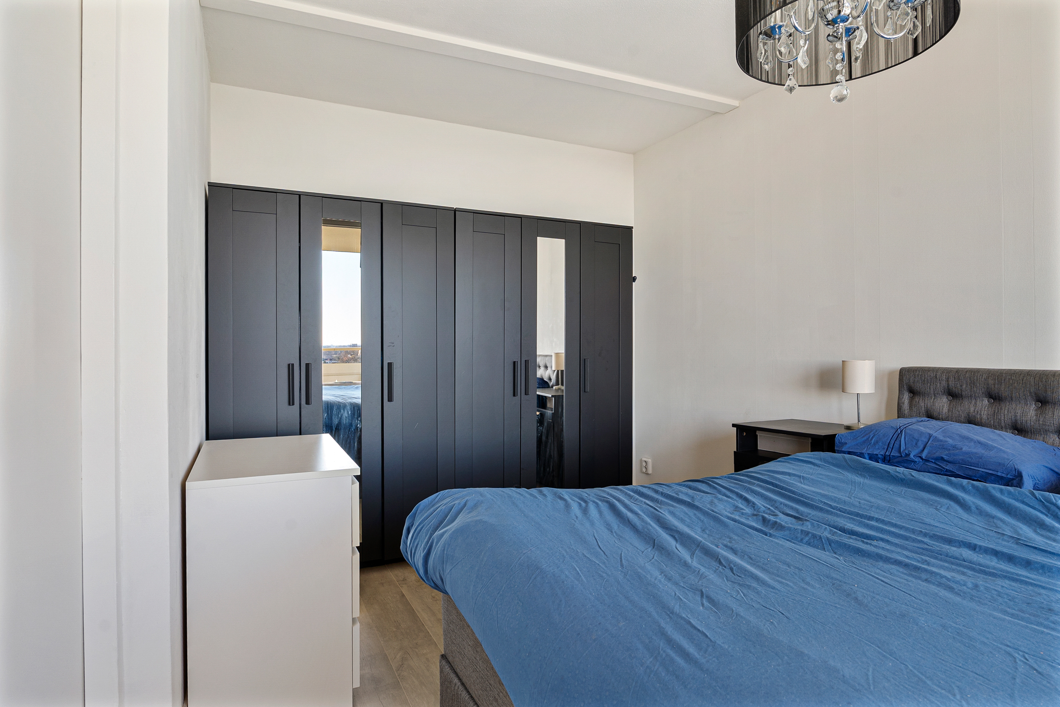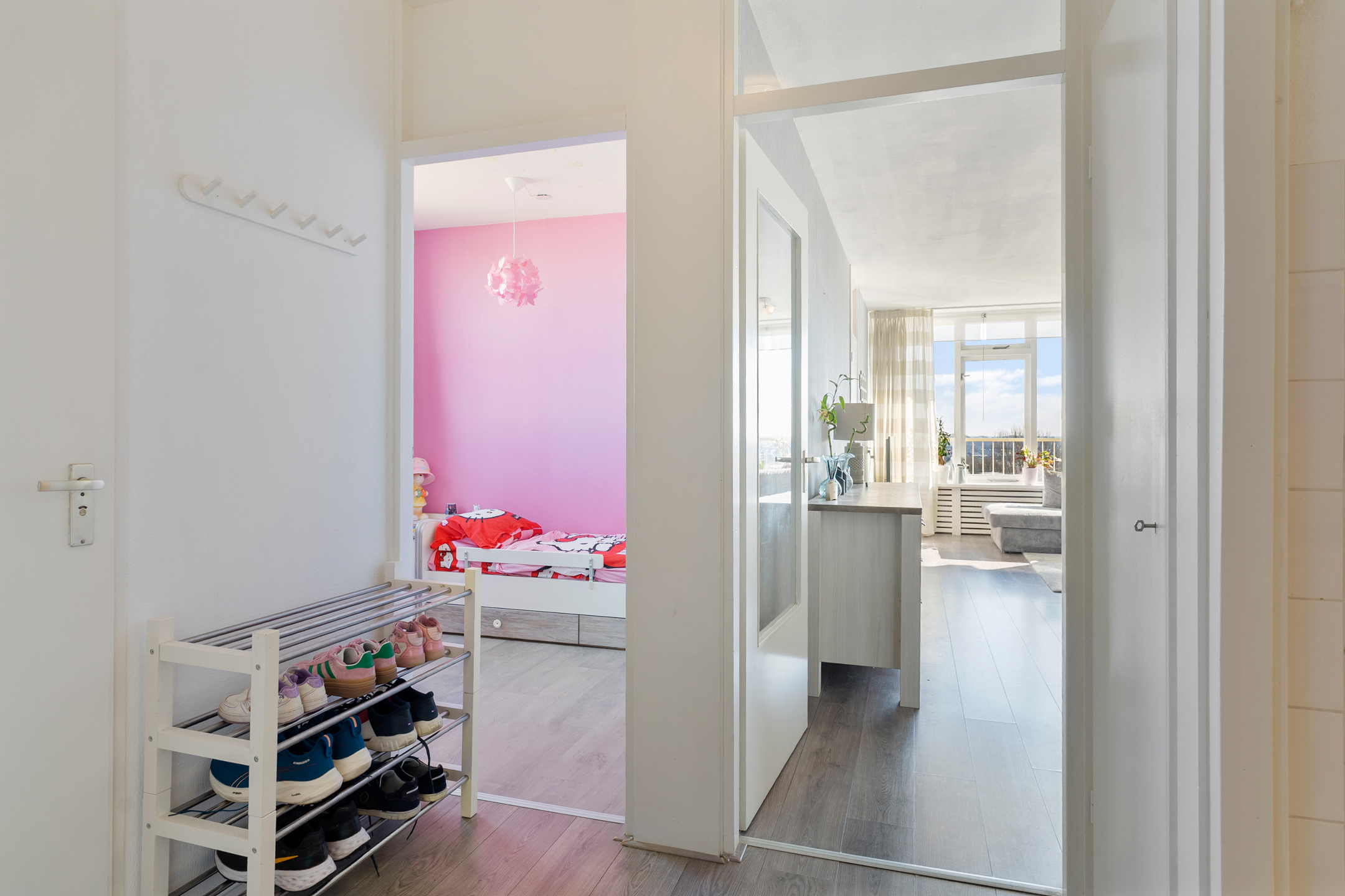 Bij binnenkomst stap je in een ruime hal met toegang tot de meterkast en een handige bergkast. De lichte woonkamer is ruim en biedt een prachtig uitzicht over de omgeving. Vanuit hier loop je door naar de royale hoofdslaapkamer (12 m²), die direct toegang heeft tot het balkon. De tweede slaapkamer (8 m²) aan de zijkant is eveneens licht en beschikt over een extra zijraam.