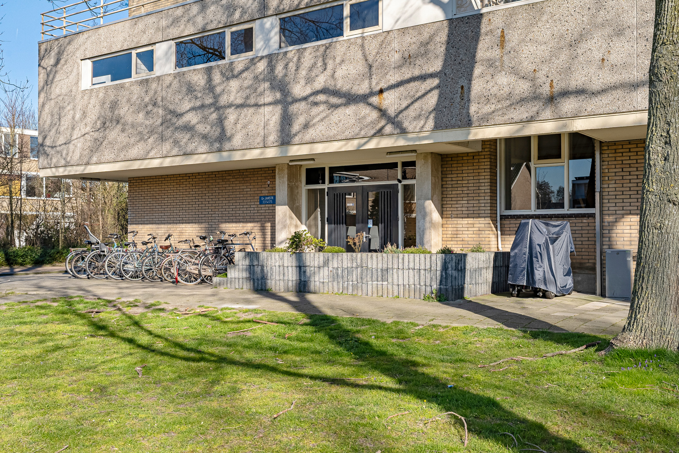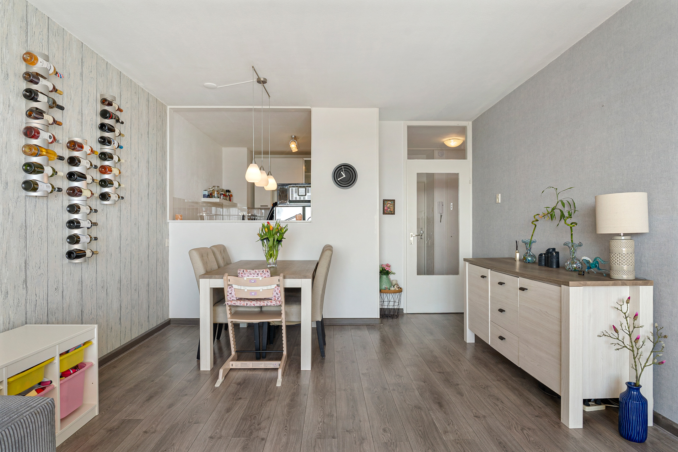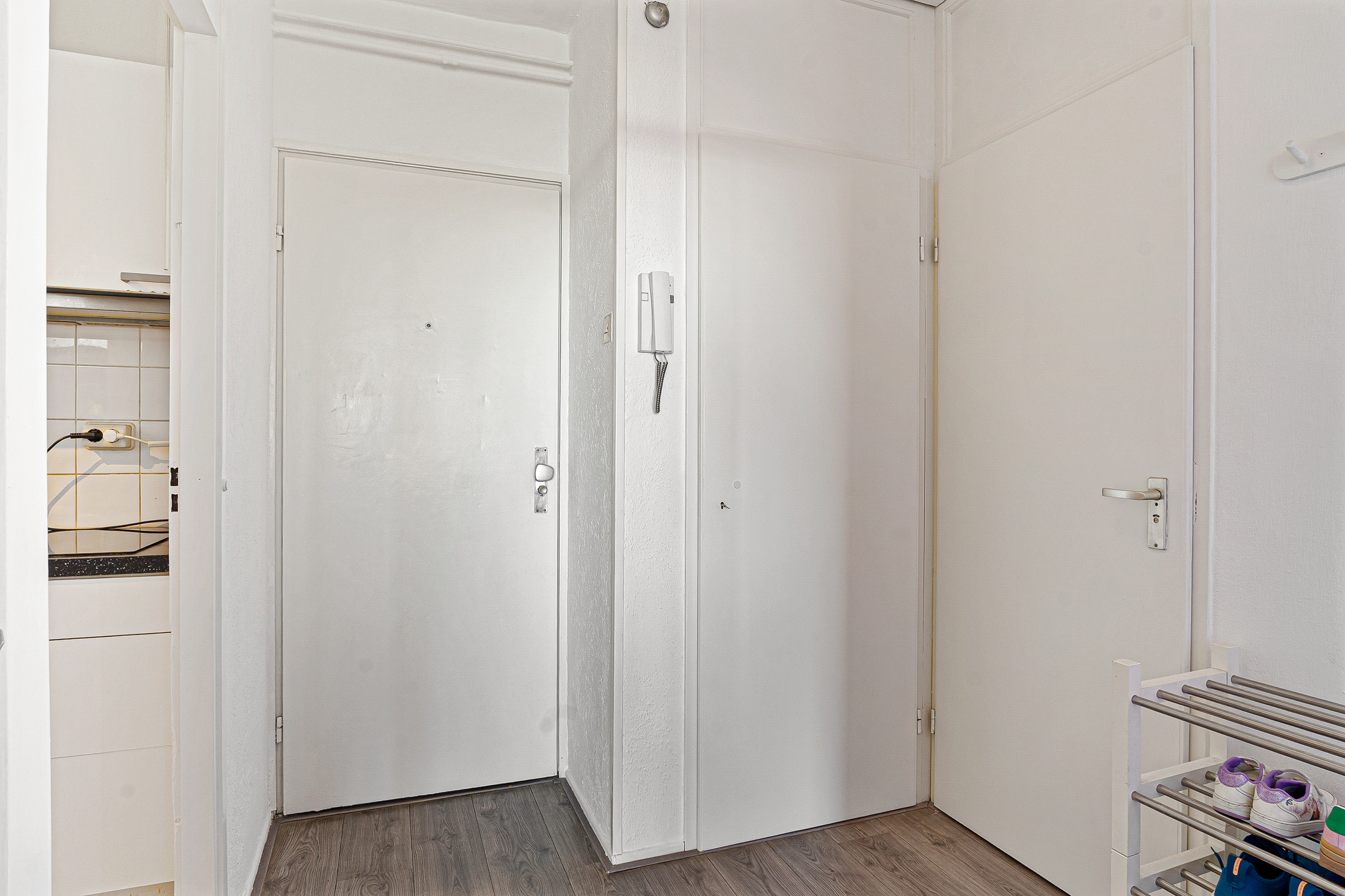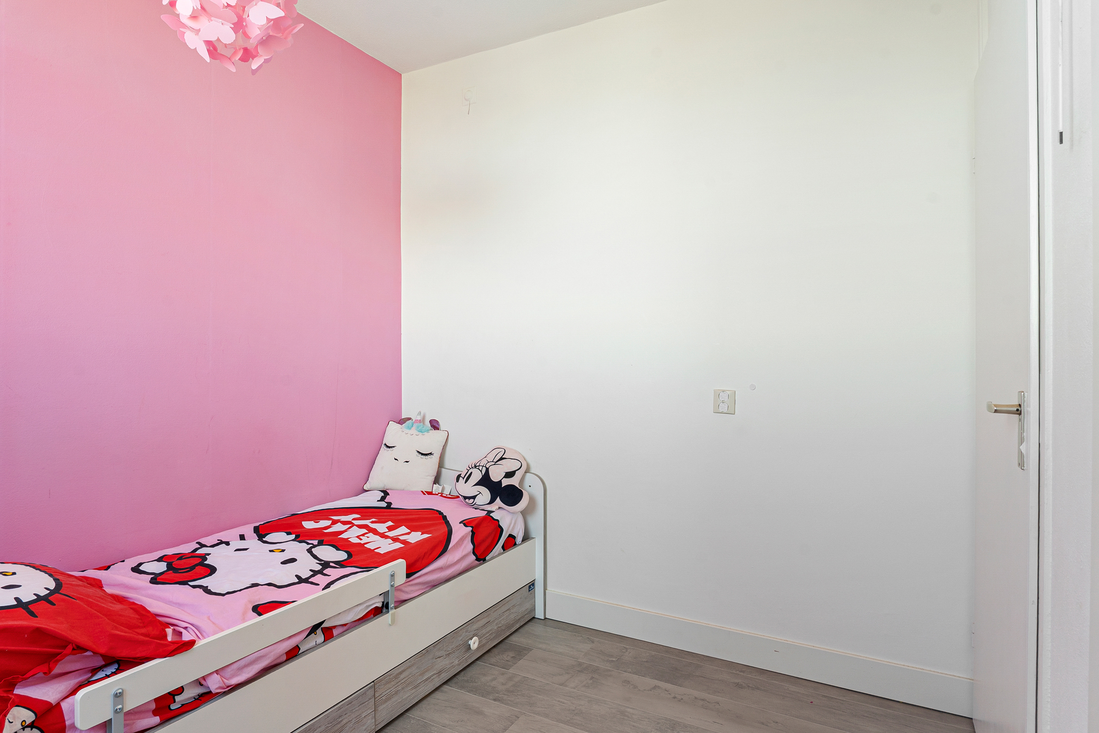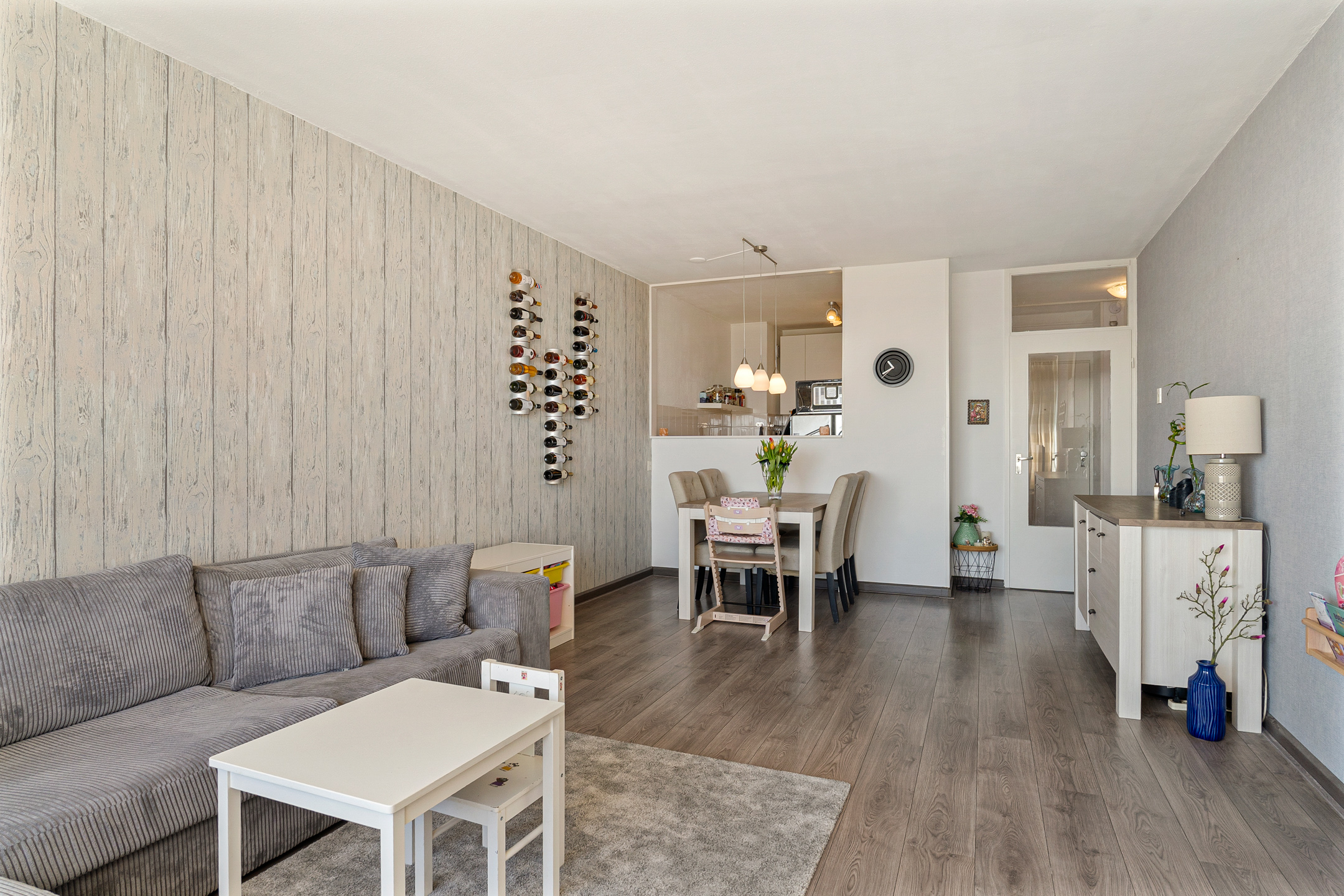 Bij binnenkomst stap je in een ruime hal met toegang tot de meterkast en een handige bergkast. De lichte woonkamer is ruim en biedt een prachtig uitzicht over de omgeving. Vanuit hier loop je door naar de royale hoofdslaapkamer (12 m²), die direct toegang heeft tot het balkon. De tweede slaapkamer (8 m²) aan de zijkant is eveneens licht en beschikt over een extra zijraam.