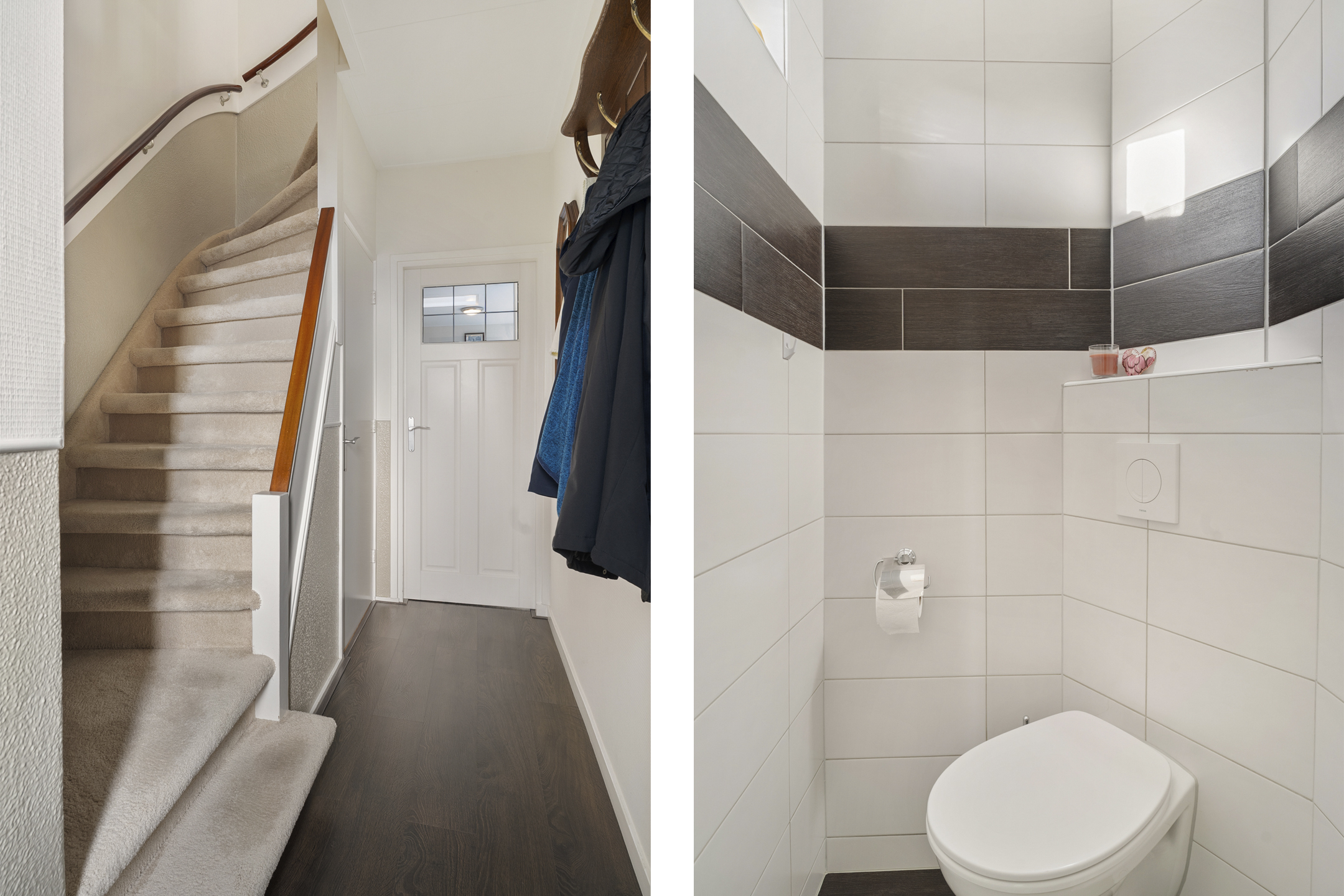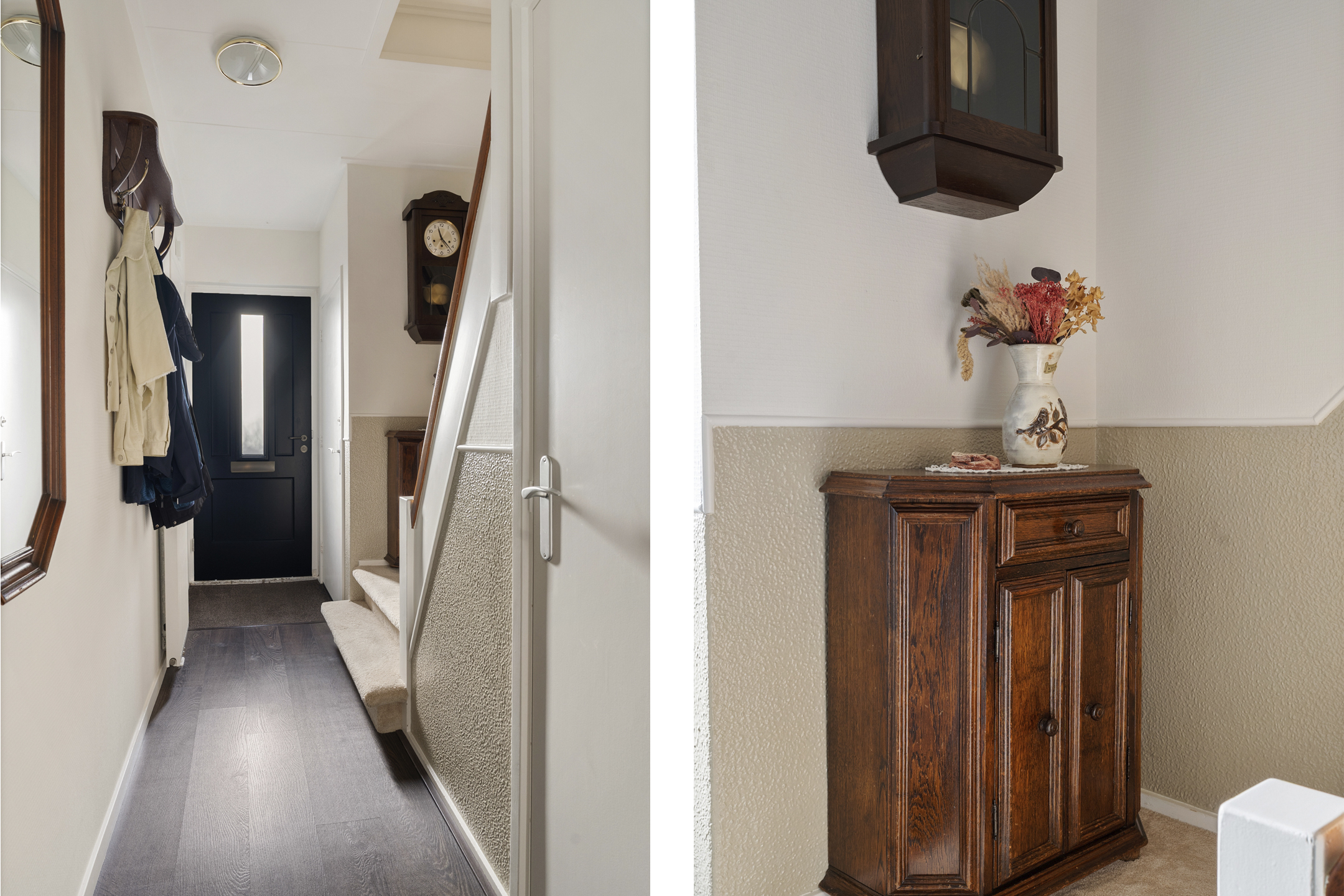 Entree via de hal met gemoderniseerde meterkast, toilet en trapopgang naar de eerste verdieping. Vanuit de hal is tevens de praktische trapkast bereikbaar, uitgevoerd als koele bergruimte in het souterrain.
