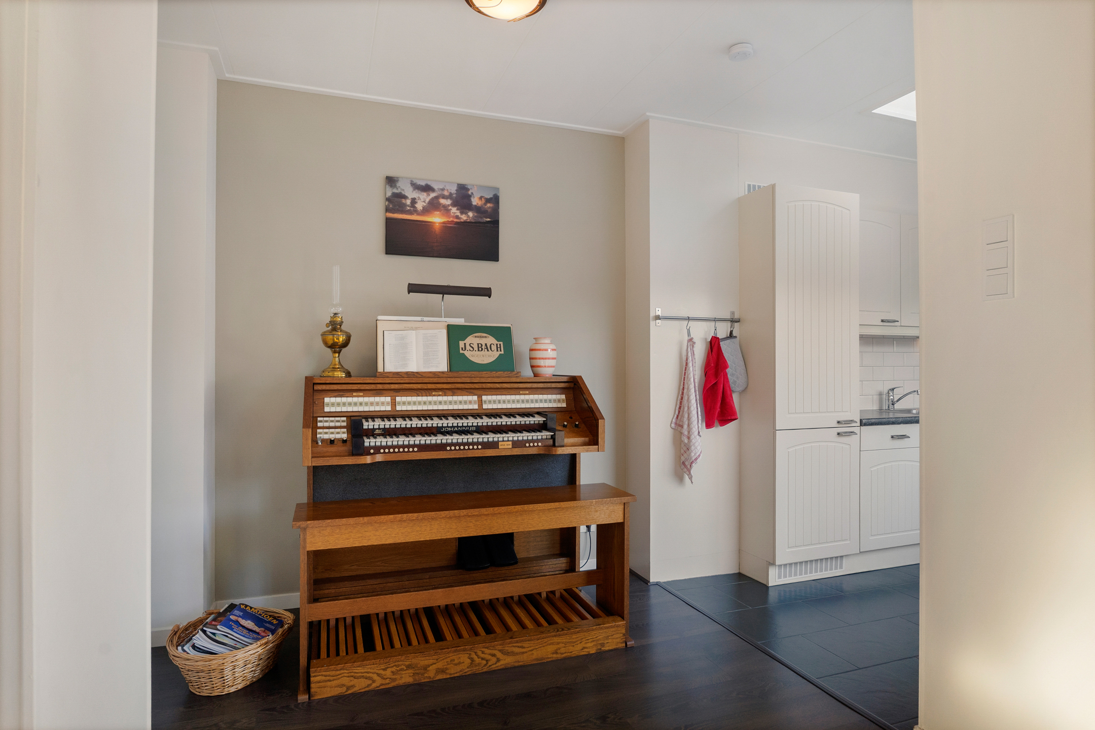 De lichte doorzonwoonkamer heeft een prettige lichtinval en is voorzien van een stijlvol glas-in-loodraam aan de zijkant. Aan de achterzijde bevindt zich de open keuken, uitgevoerd in een lichte landelijke stijl met donker werkblad en uitgerust met onder andere een koel-/vriescombinatie, vaatwasser, oven, gaskookplaat en afzuigkap.