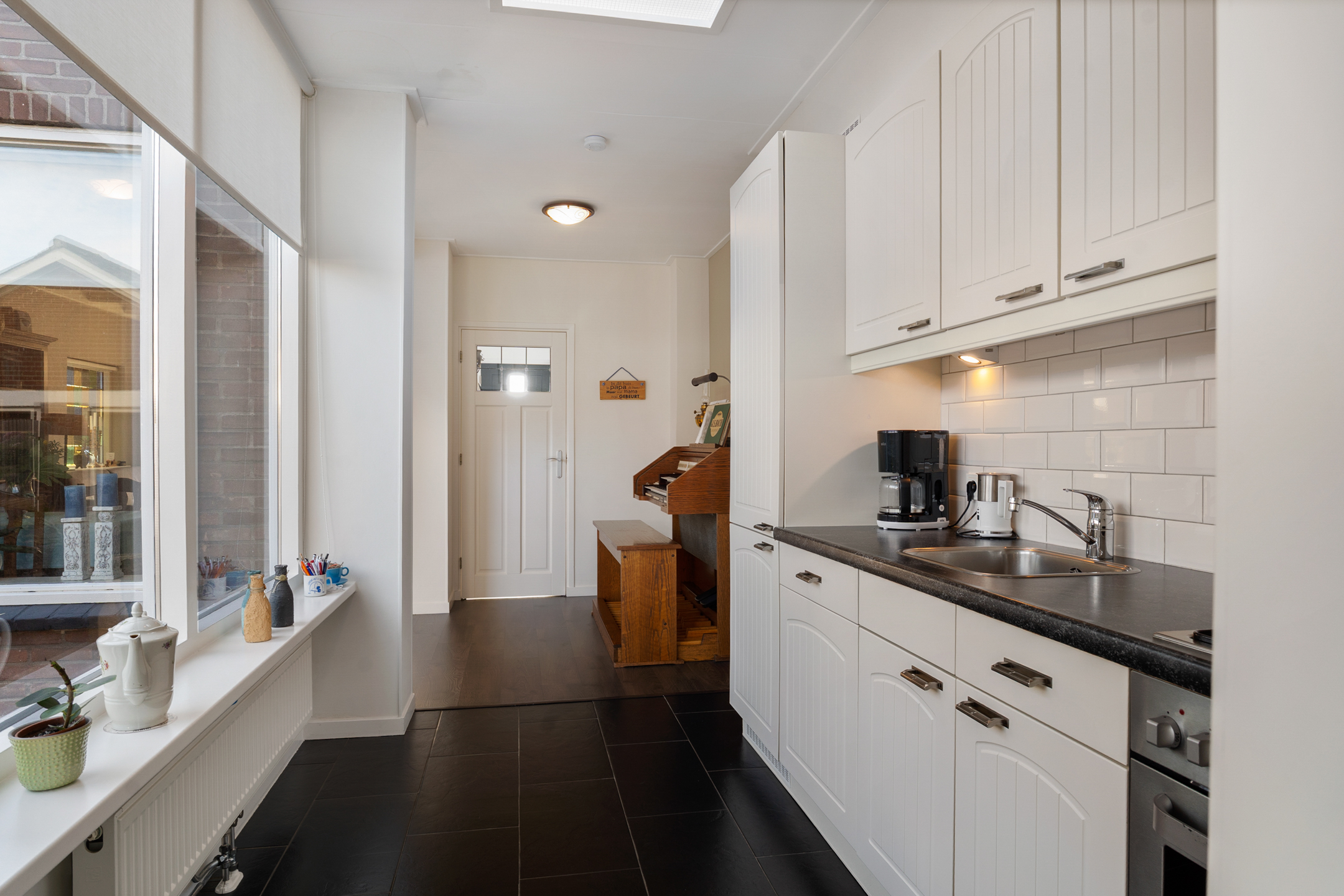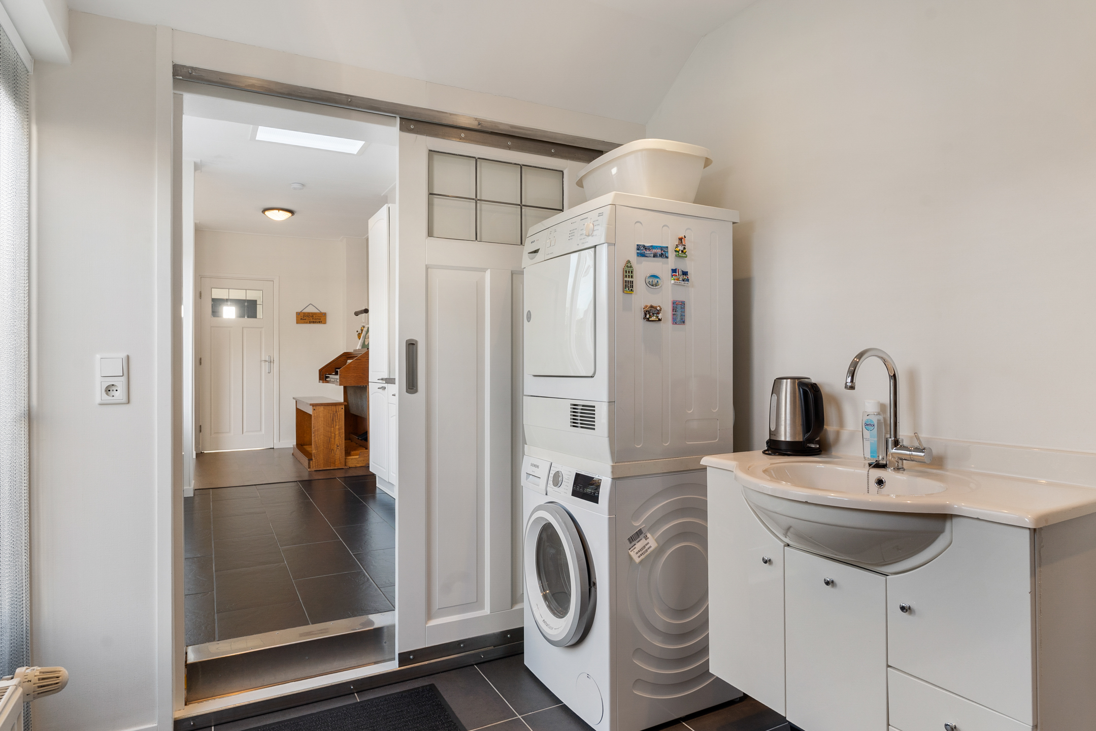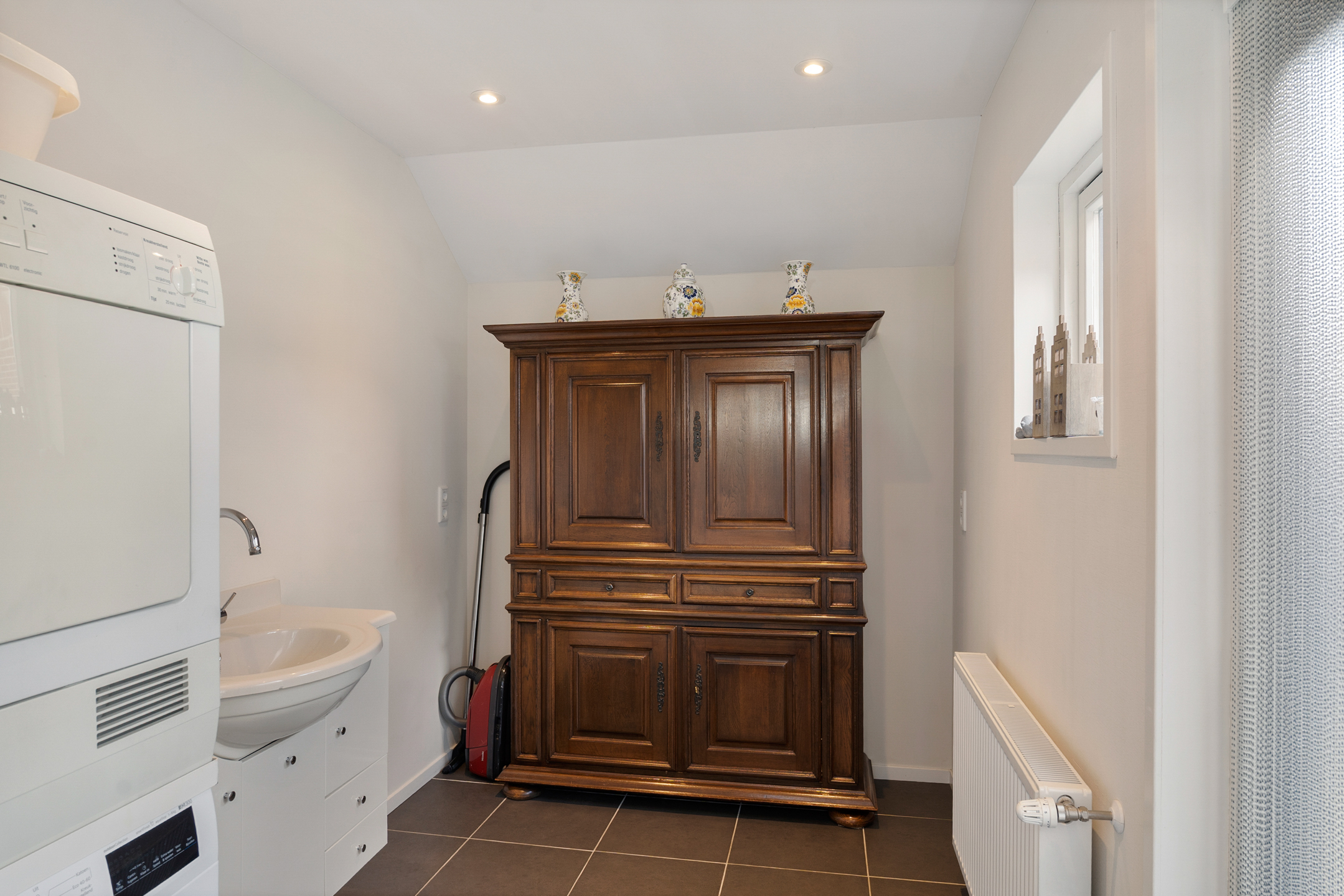 In het verlengde van de keuken ligt de volledig geïsoleerde bijkeuken, met opstelplaats voor wasapparatuur, een wastafel met meubel en extra bergruimte. Vanuit hier is er toegang tot de achtertuin.