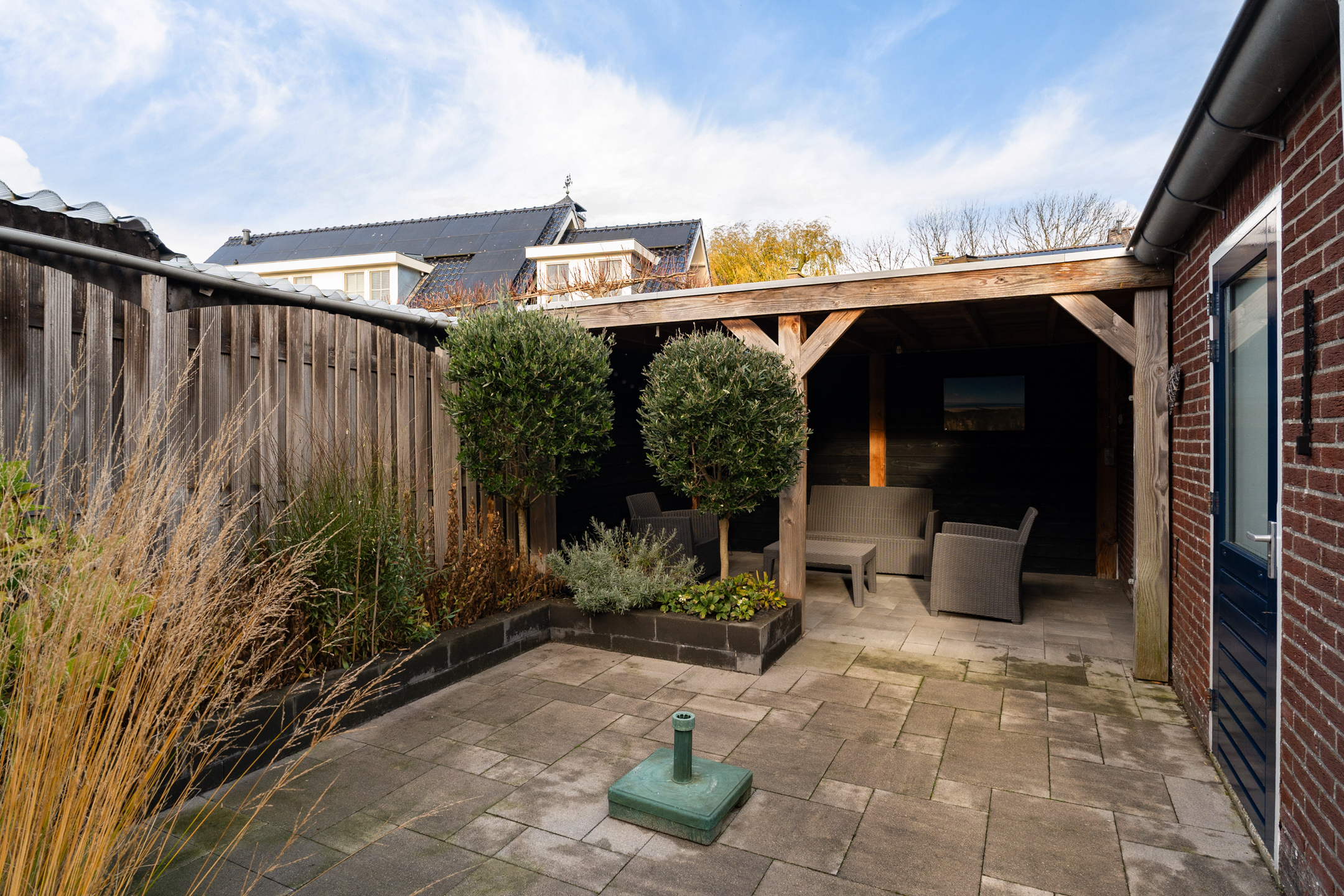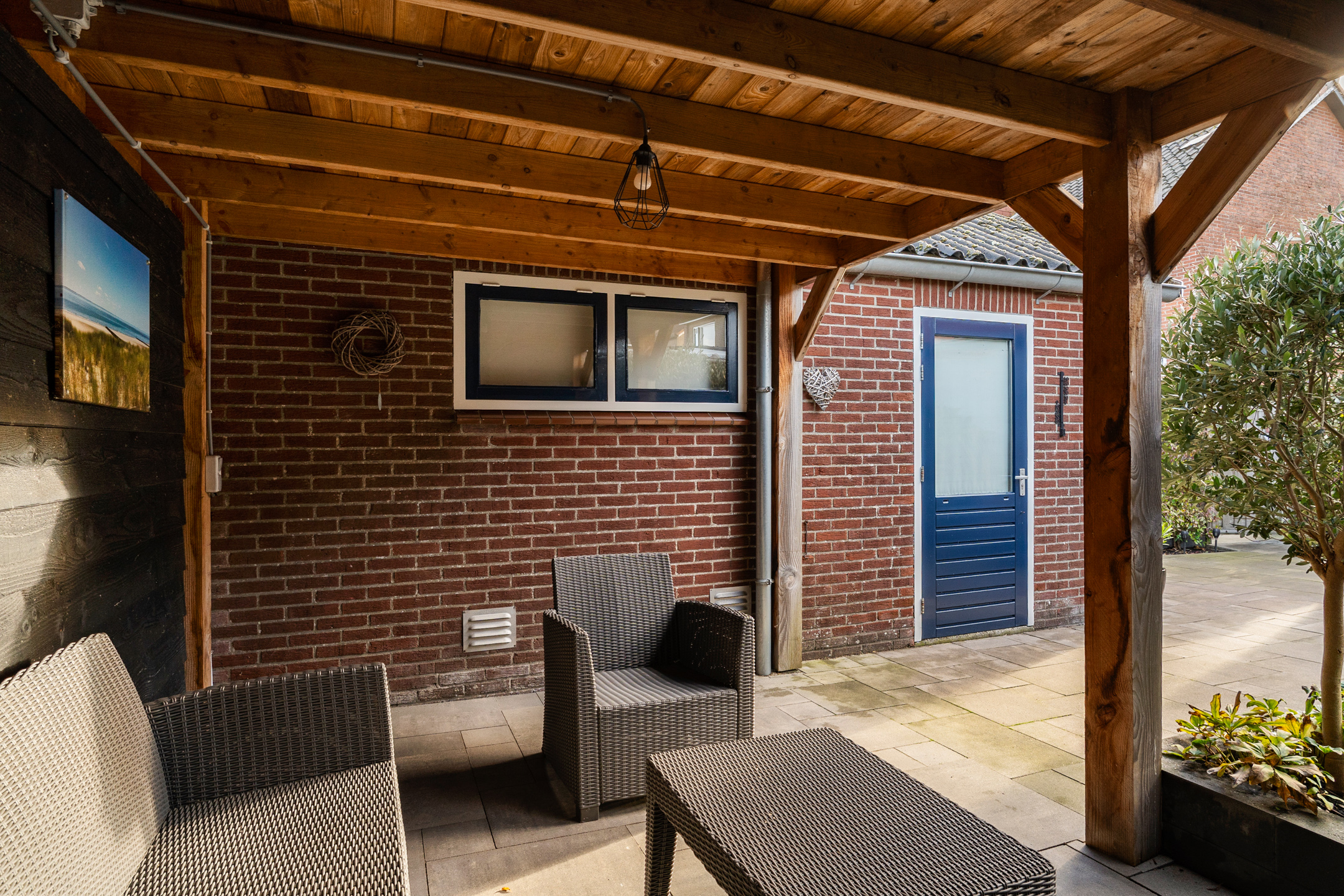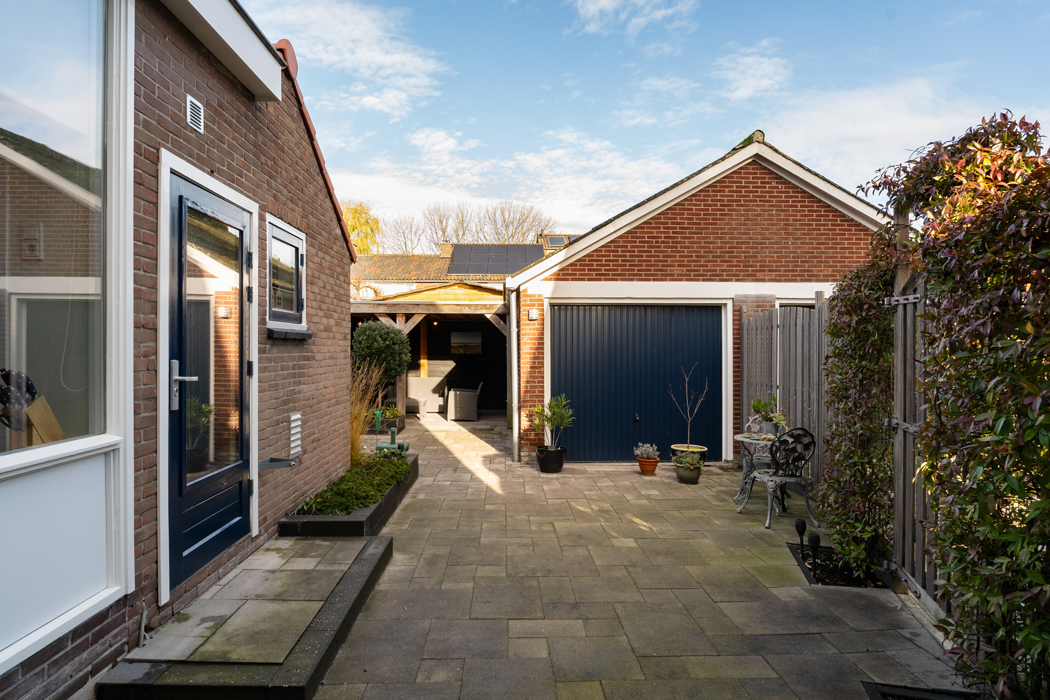 De gezellige achtertuin is een fijne plek om te ontspannen en beschikt over een achterom, groene plantenborders en een royale houten veranda met elektra – perfect om te genieten van zowel de ochtend- als avondzon. Achterin de tuin staat de vrijstaande stenen garage met overheaddeur, elektra en extra opslagruimte bovenin.