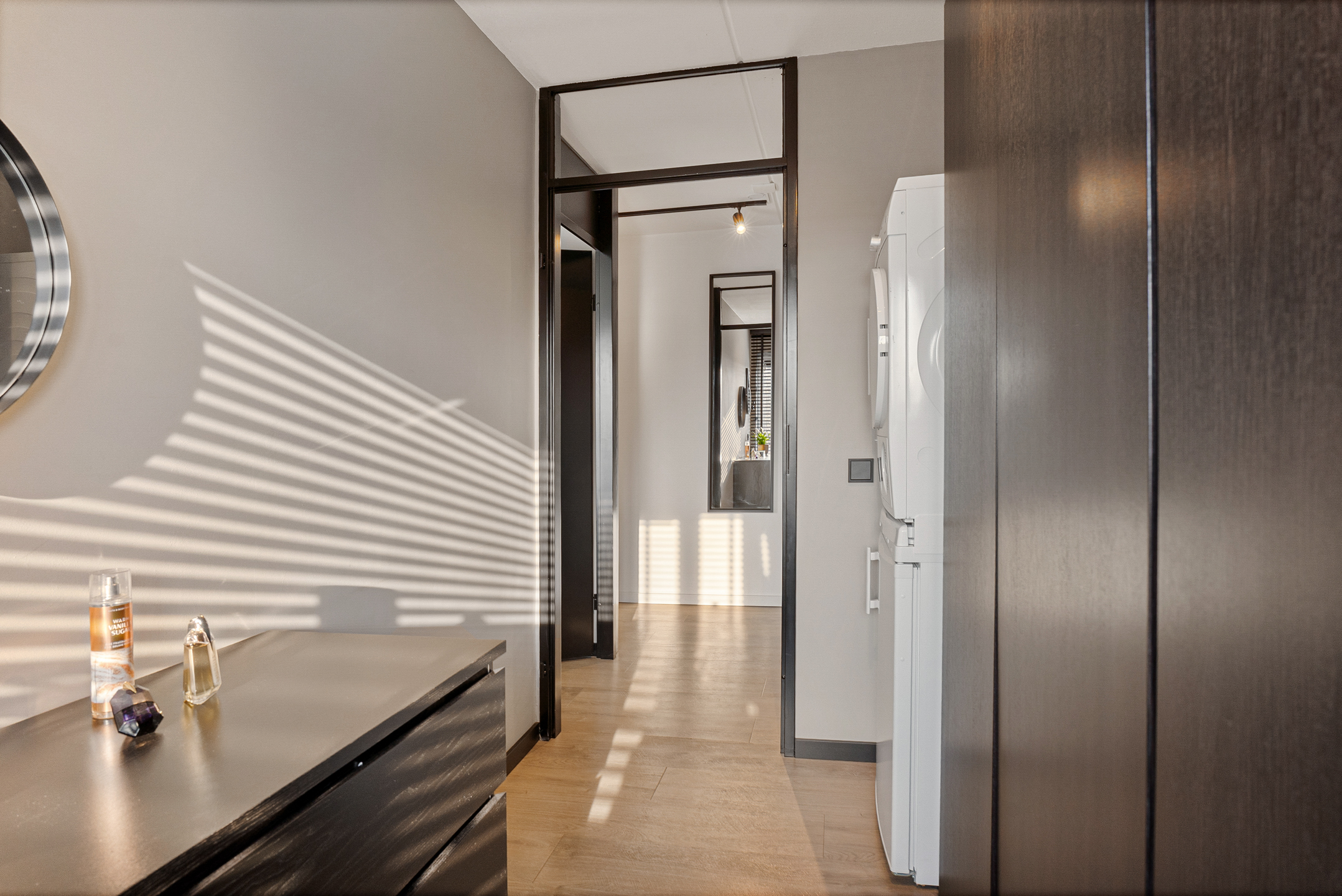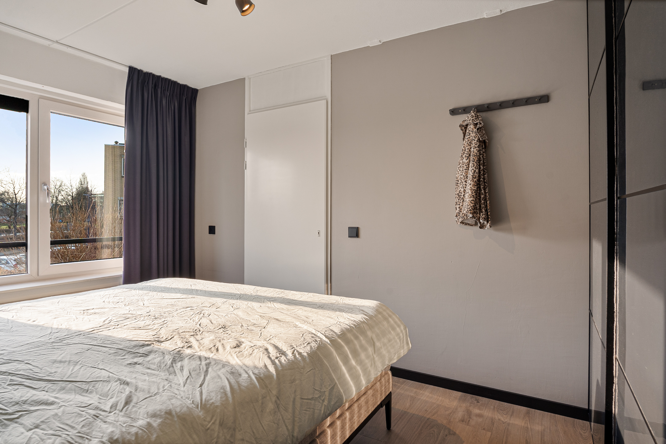 De woning beschikt over twee slaapkamers. Eén kamer is ideaal als hoofdslaapkamer, terwijl de tweede kamer uitstekend geschikt is als werk- of kantoorruimte.