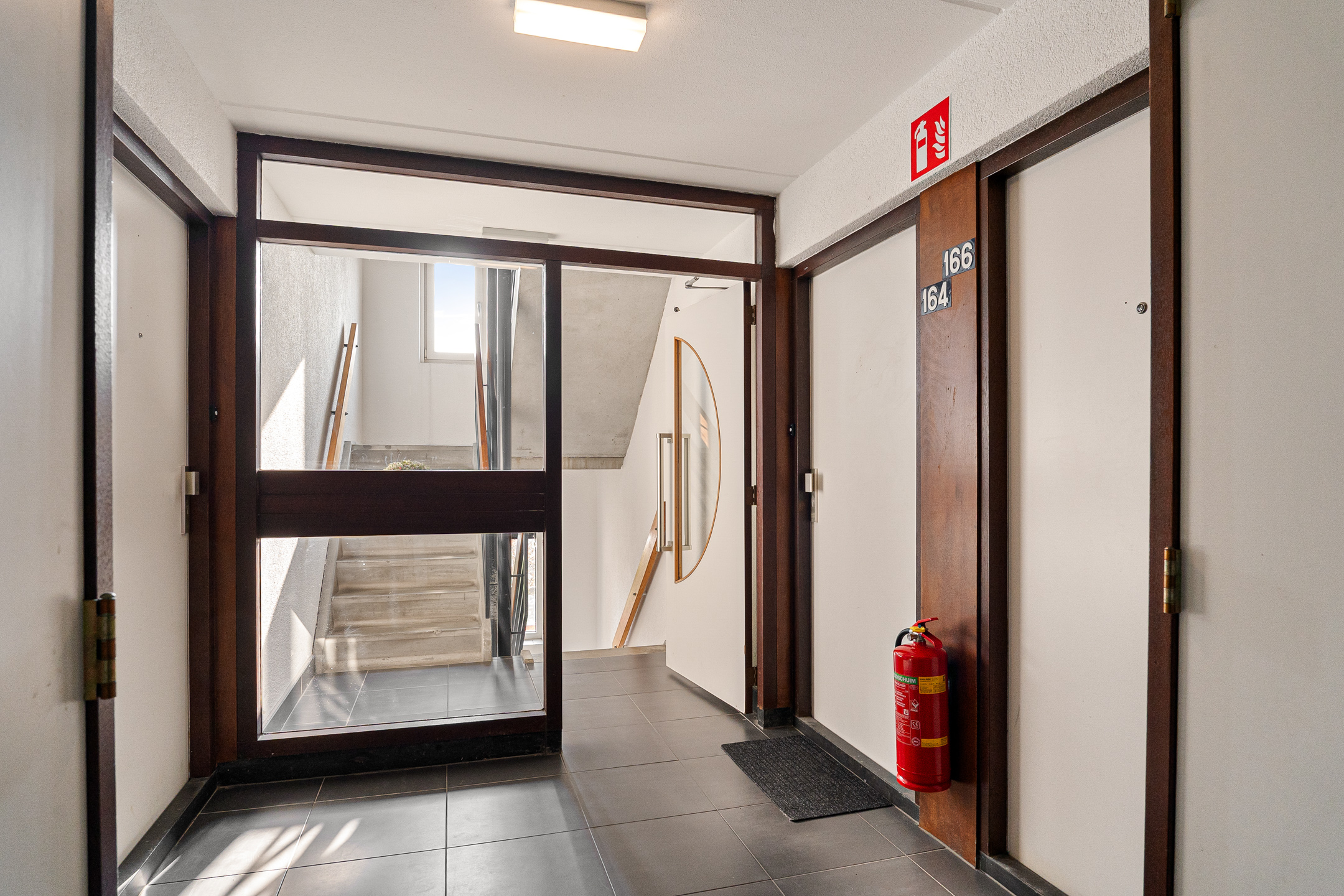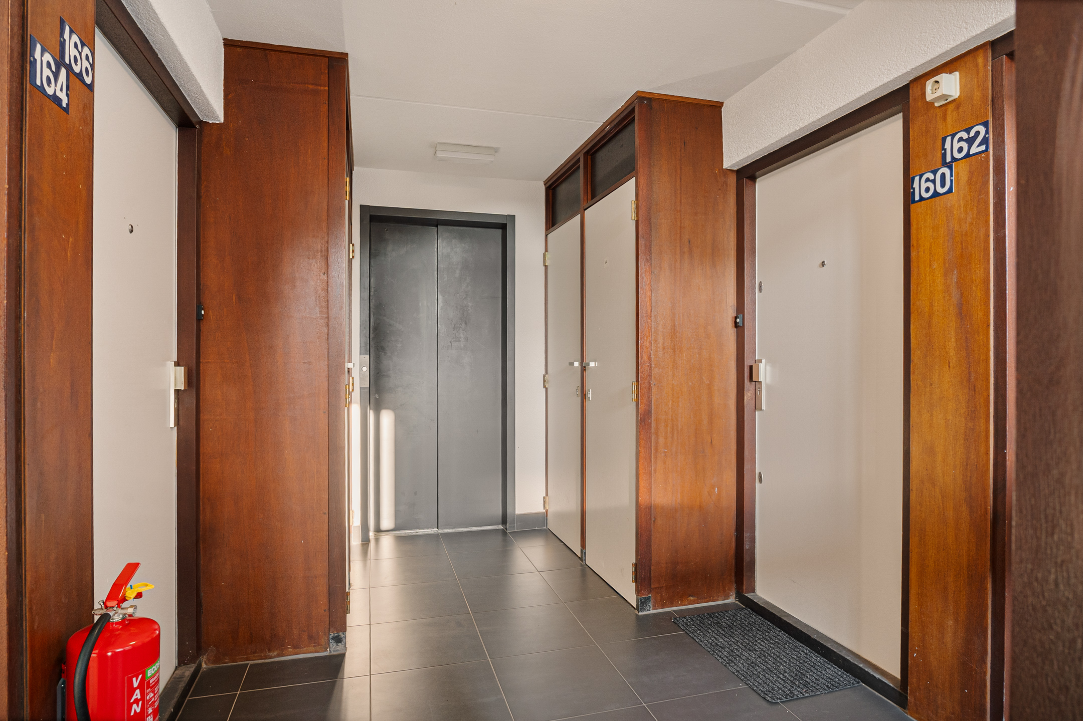 Centrale entree van het appartementencomplex met bellentableau, postbussen, lift en trappenhuis. Op de begane grond bevindt zich ook de eigen berging, voorzien van elektra.