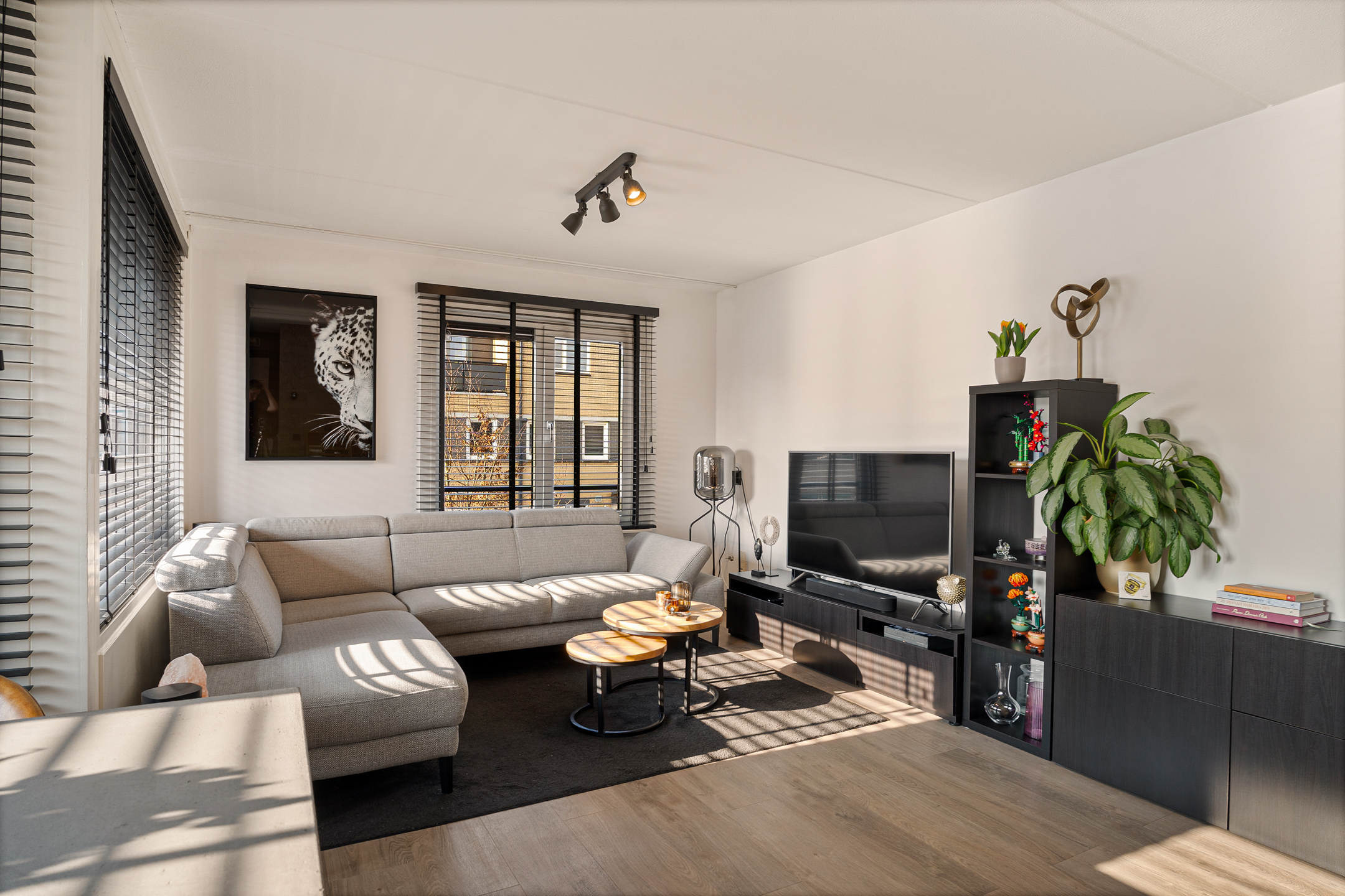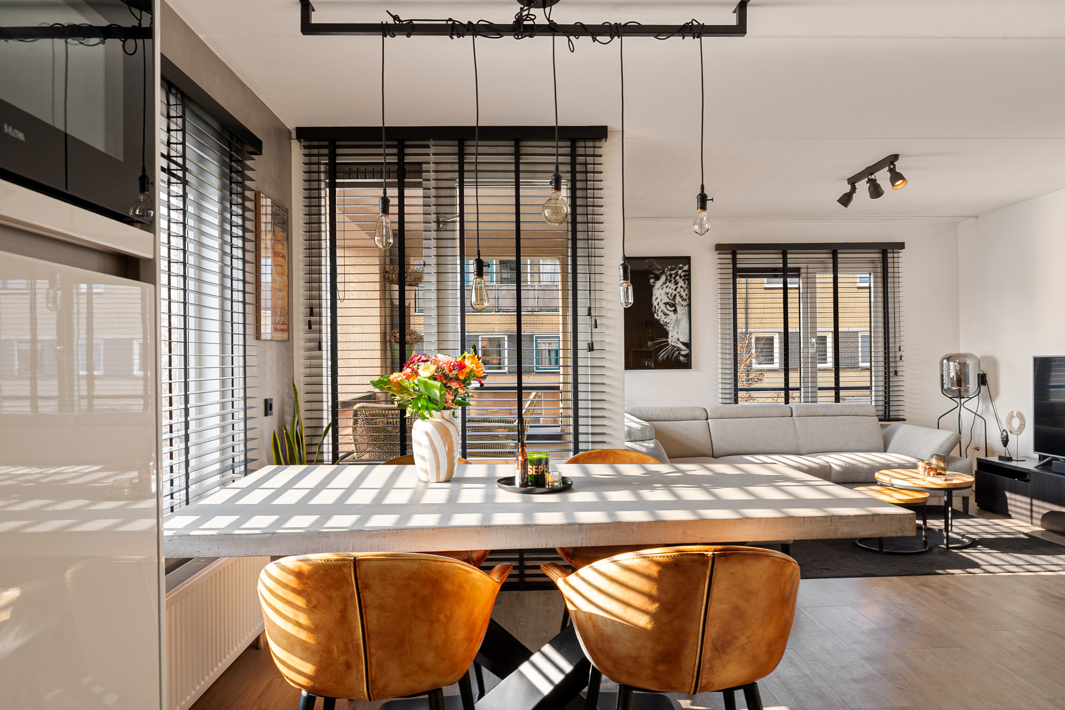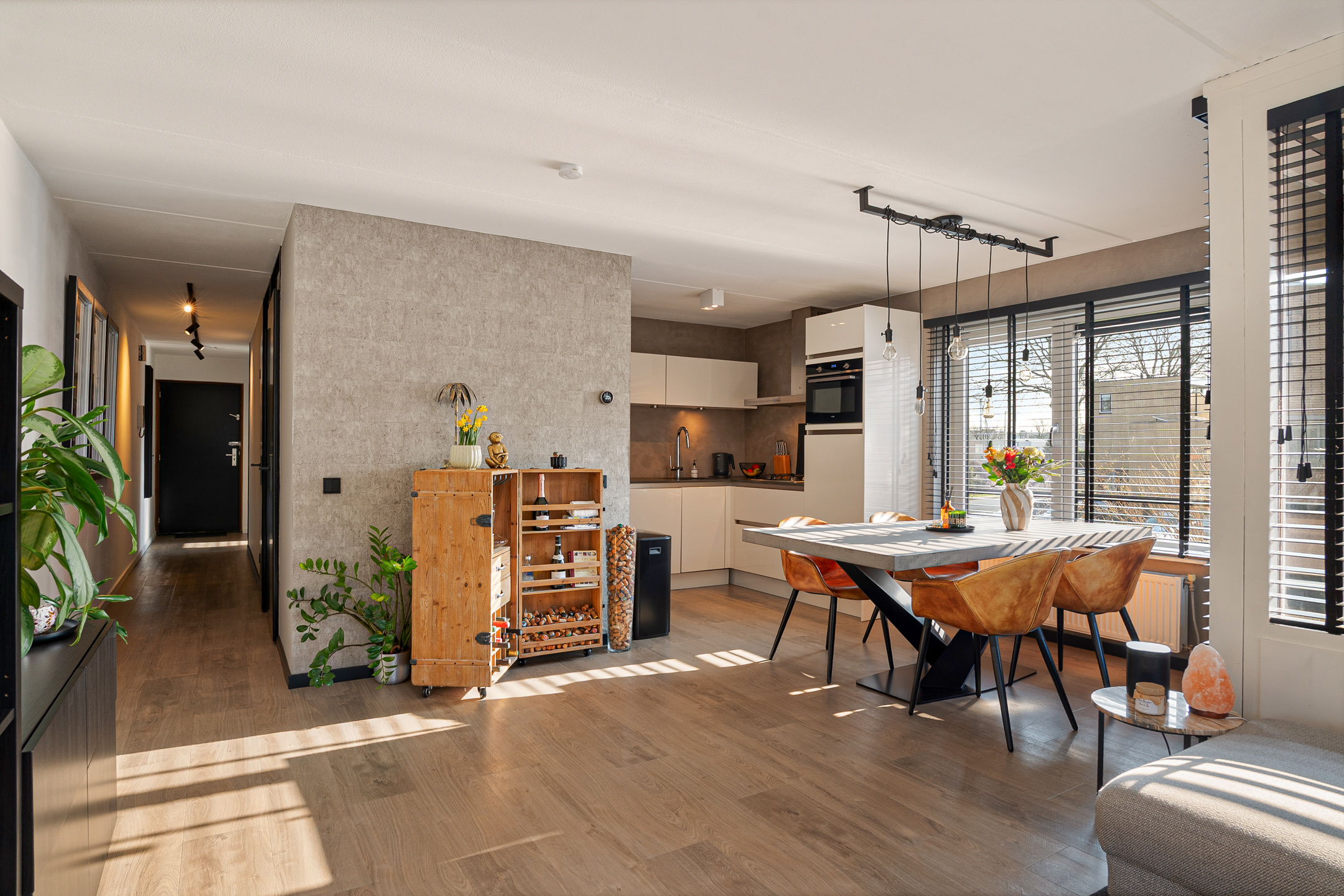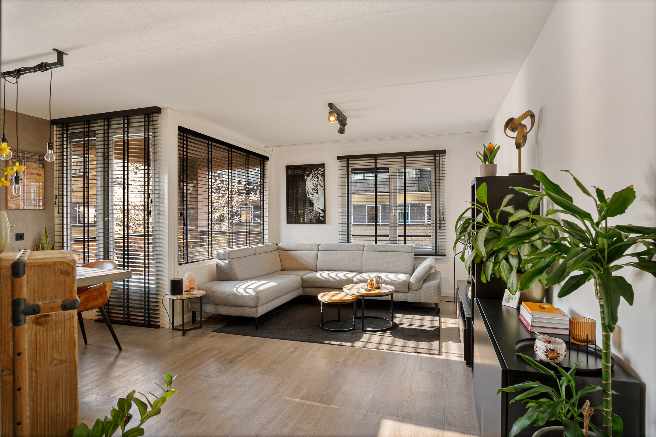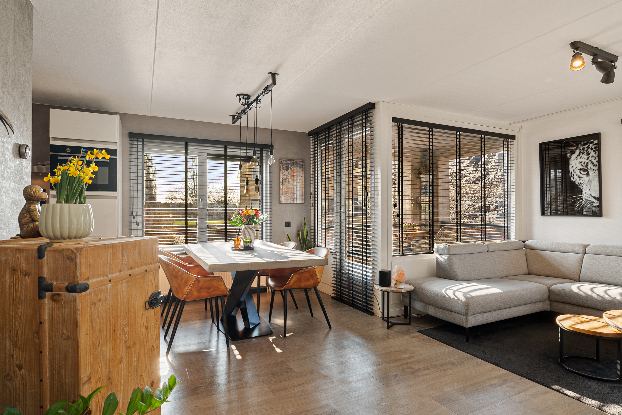 Vanuit de woonkamer bereik je het balkon op het zuidoosten. De PVC-vloer, gelegd in 2017, loopt netjes door in de woonruimtes en zorgt voor een moderne uitstraling.