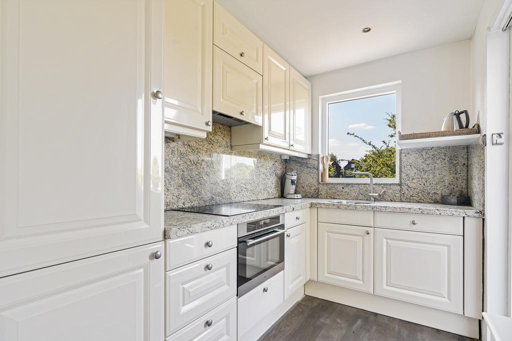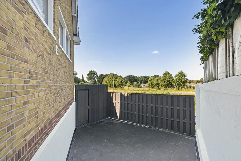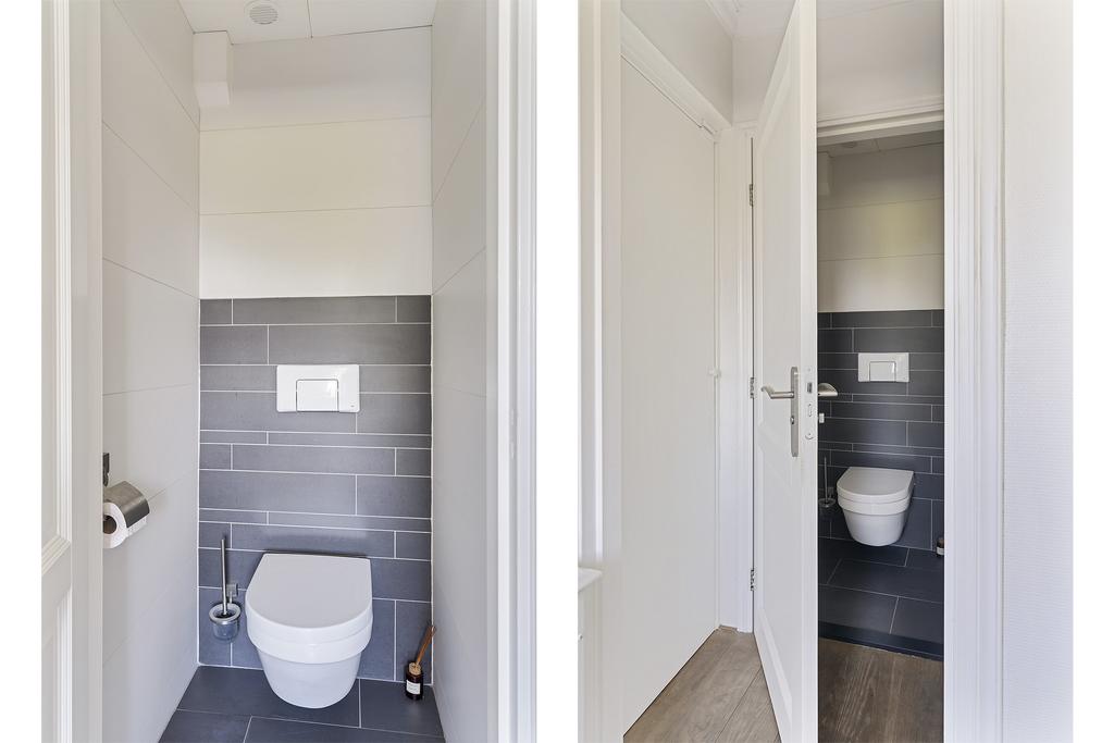 De keuken is aan de achterzijde van de woning te vinden en beschikt over een inductie kookplaat, koelkast, vriezer, vaatwasser, combi-oven en geeft toegang tot het terras. Op het terras is het goed vertoeven tussen al het groen. In de hal is het moderne separate toilet te vinden. Dit moderne toilet is volledig betegeld en is voorzien van een wandcloset.