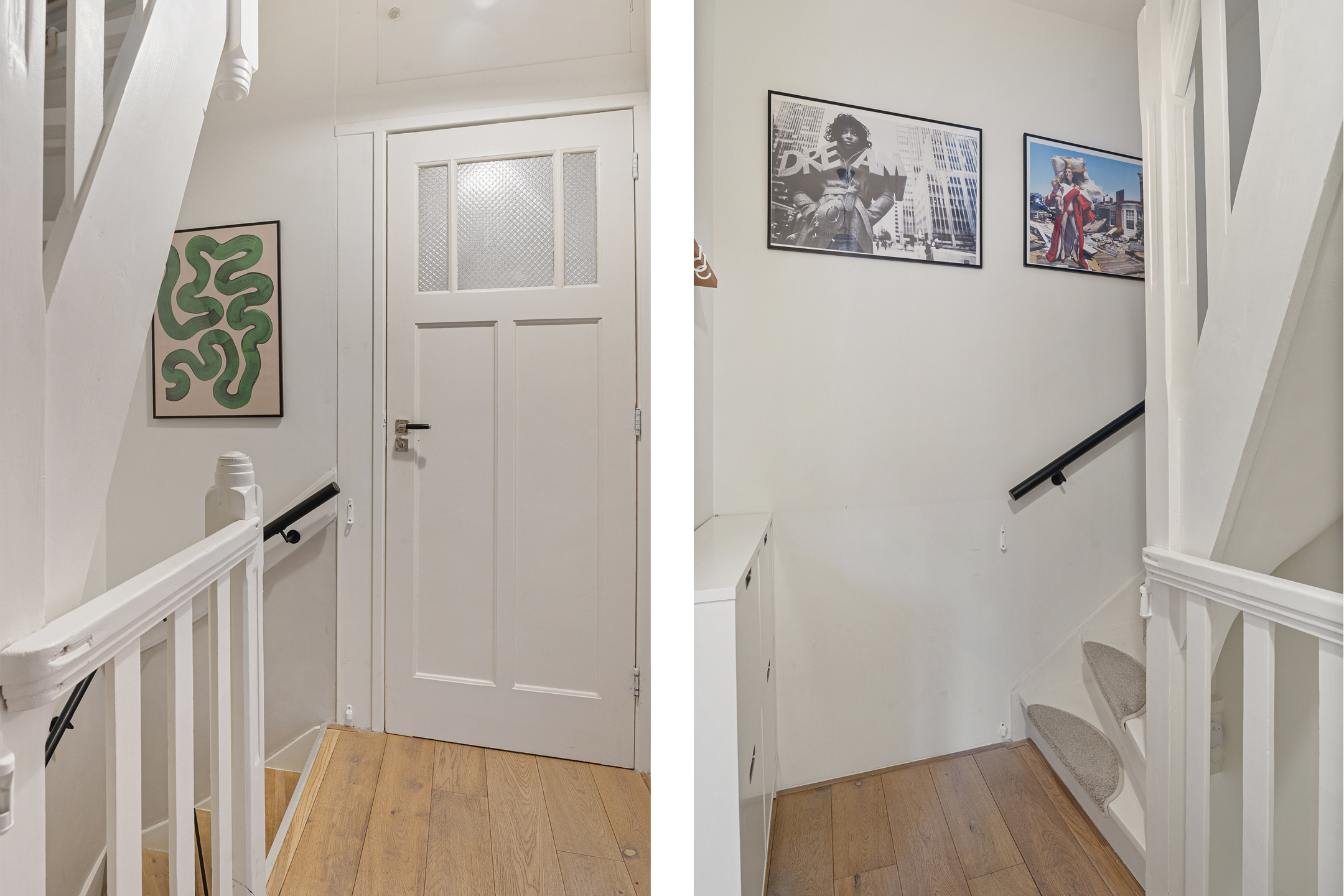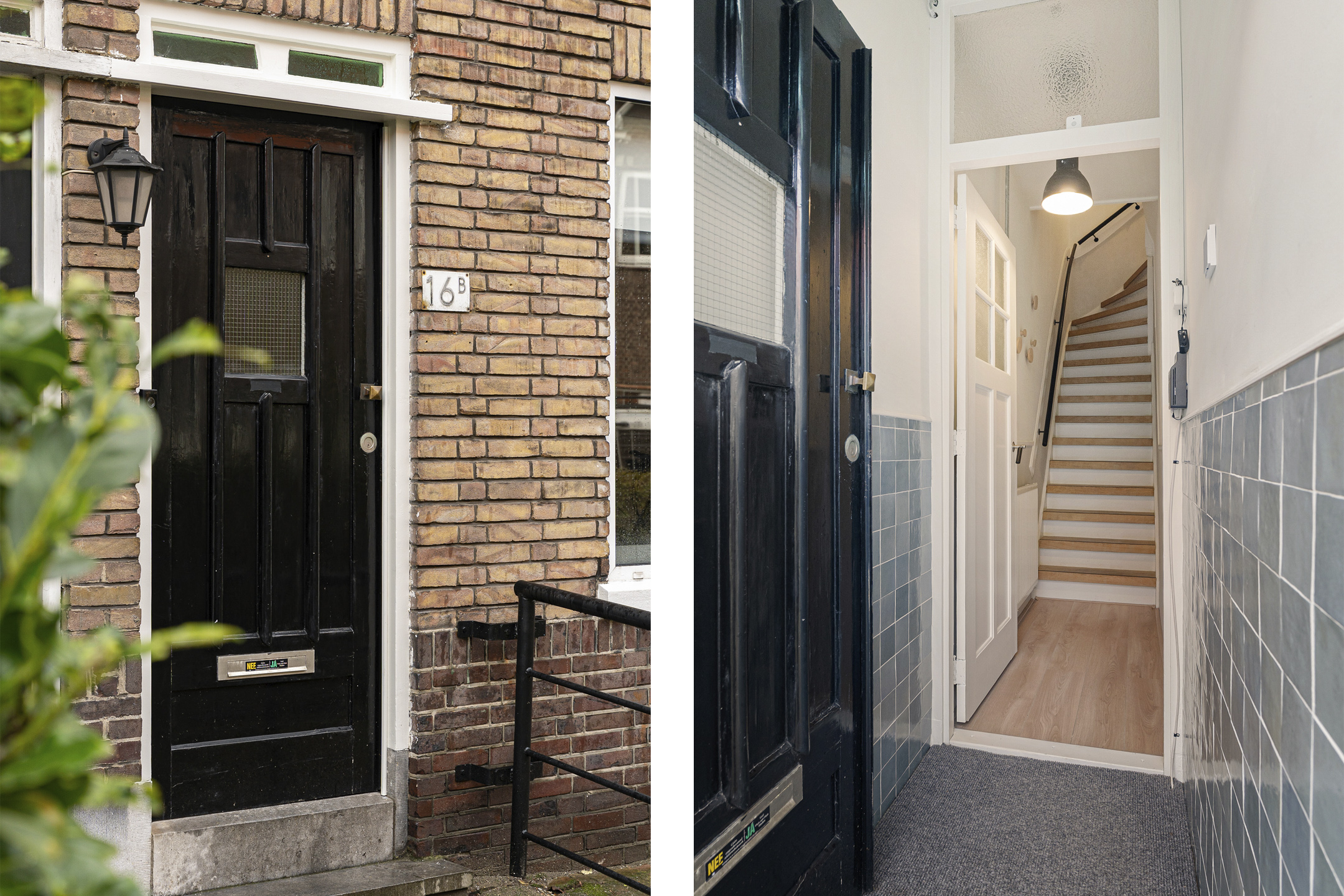 Eigen entree met hal en trapopgang naar de eerste verdieping. De trap is in 2021 vernieuwd en voorzien van een houtstructuur trapbekleding, wat direct een warme uitstraling geeft.