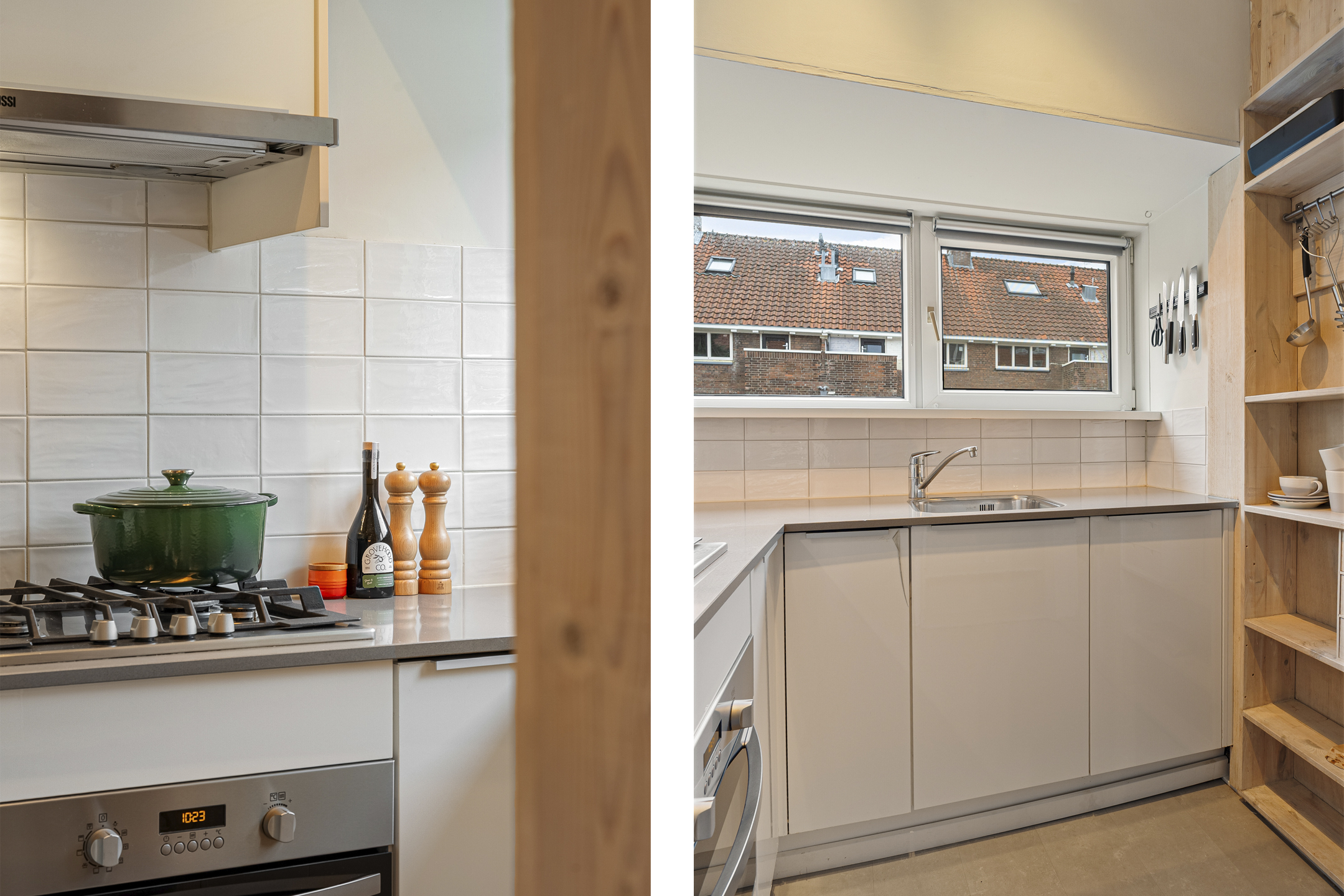 De moderne keuken (2017) sluit mooi aan op de woonkamer. De indeling is praktisch en stijlvol, uitgerust met inbouwkasten en diverse apparatuur zoals koelkast, vriezer, gascomfort, combi-oven en vaatwasser. De gehele verdieping heeft een mooie houten vloer.