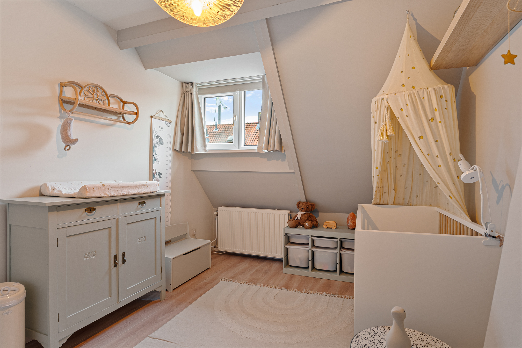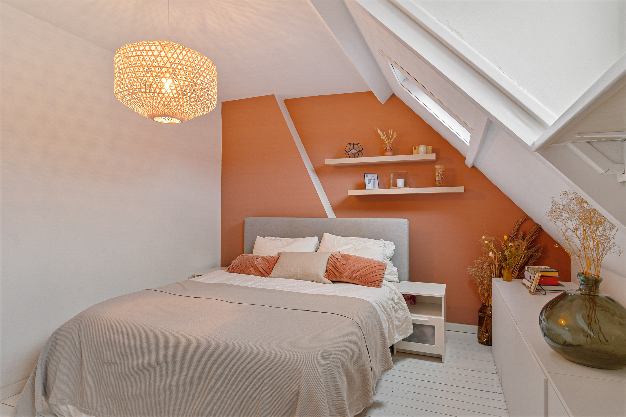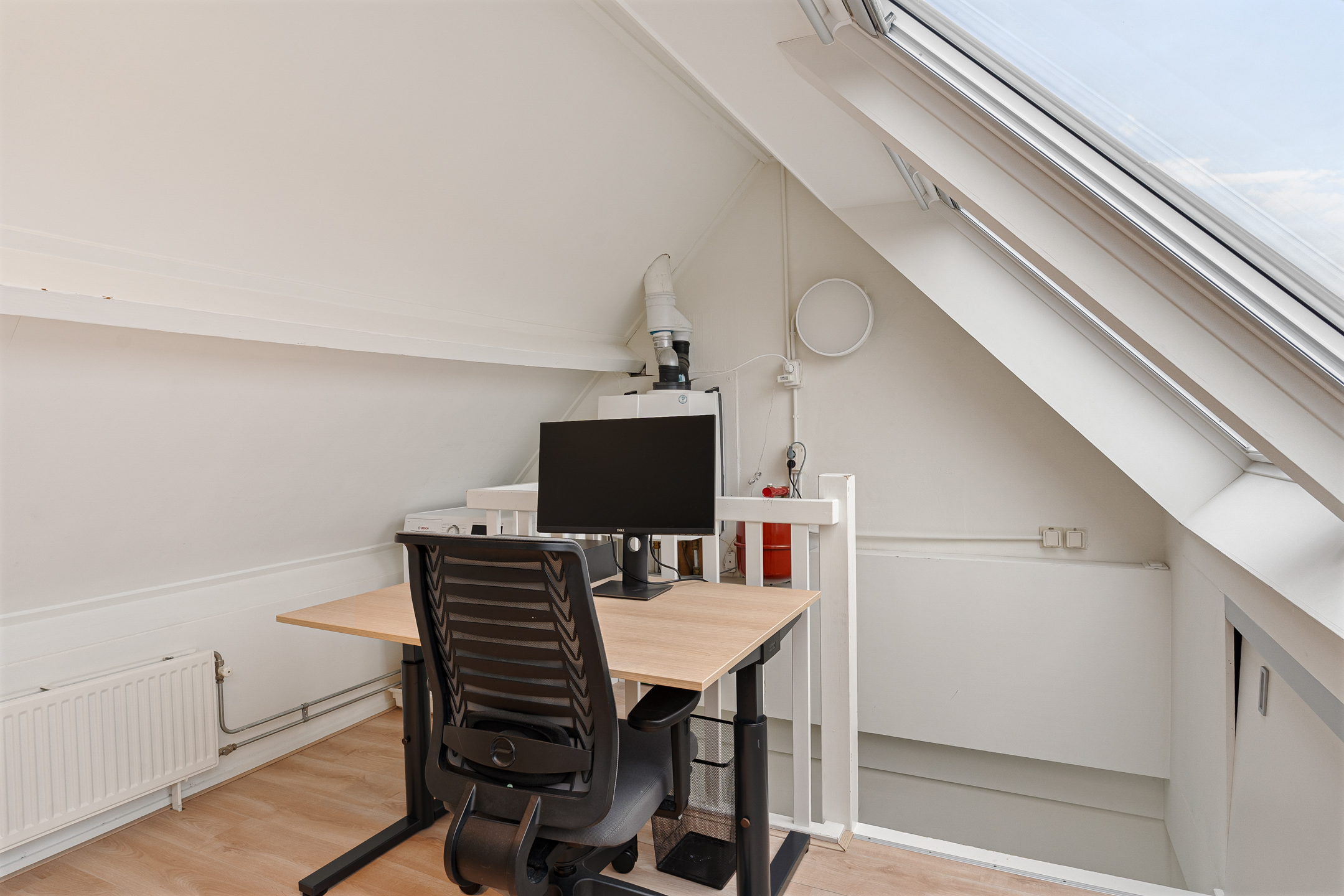 De bovenste verdieping is een verrassend lichte en sfeervolle ruimte. Drie grote Velux-dakramen met screens zorgen voor volop daglicht en ventilatie. Deze kamer is ideaal als extra slaapkamer, werkkamer of hobbyruimte. Achter de knieschotten is handige bergruimte aanwezig. Hier bevinden zich ook de cv-ketel (ATAG) en de wasmachineaansluiting.