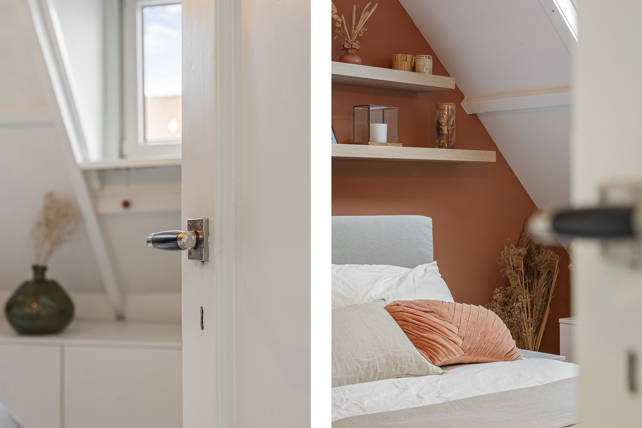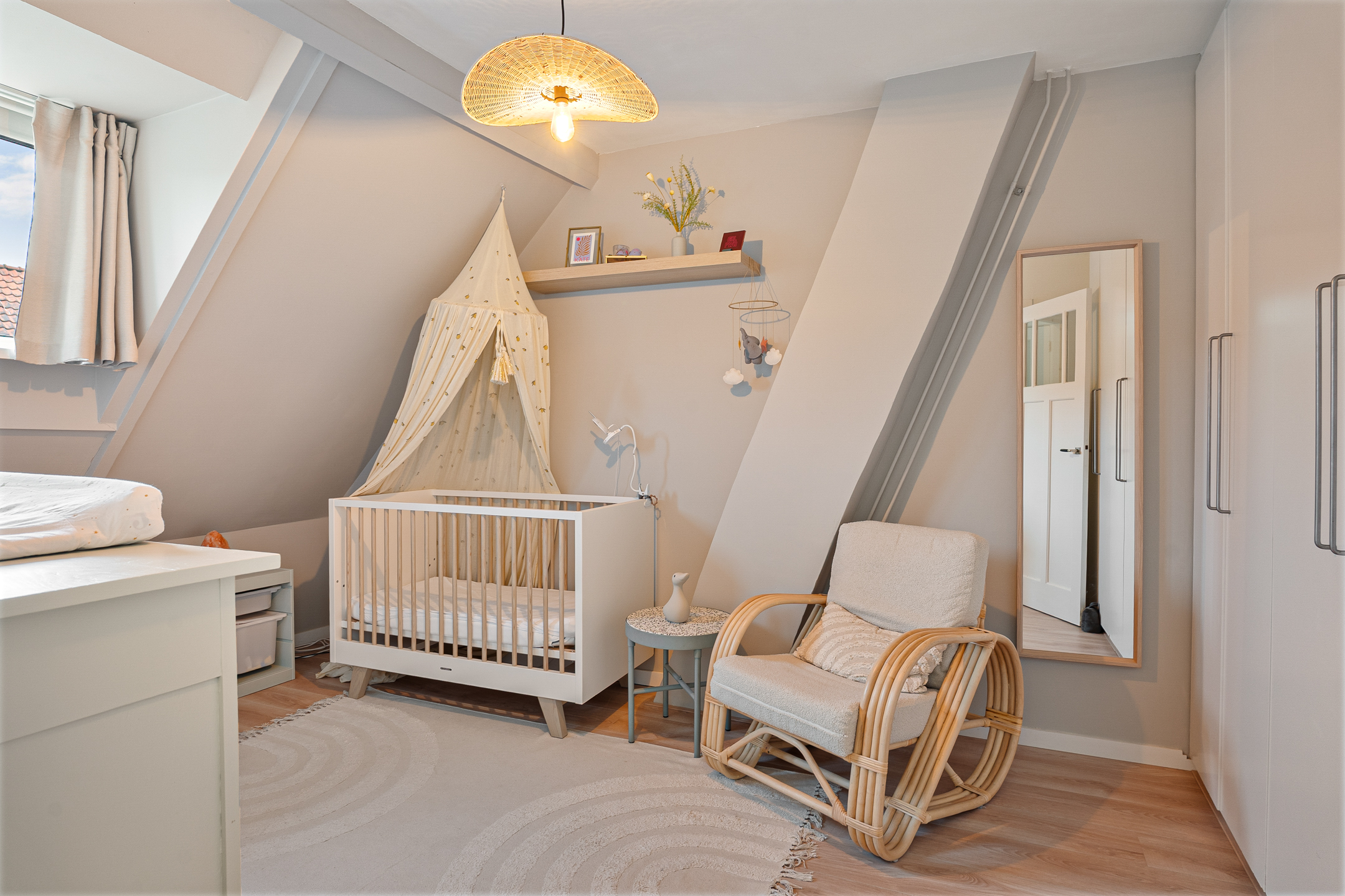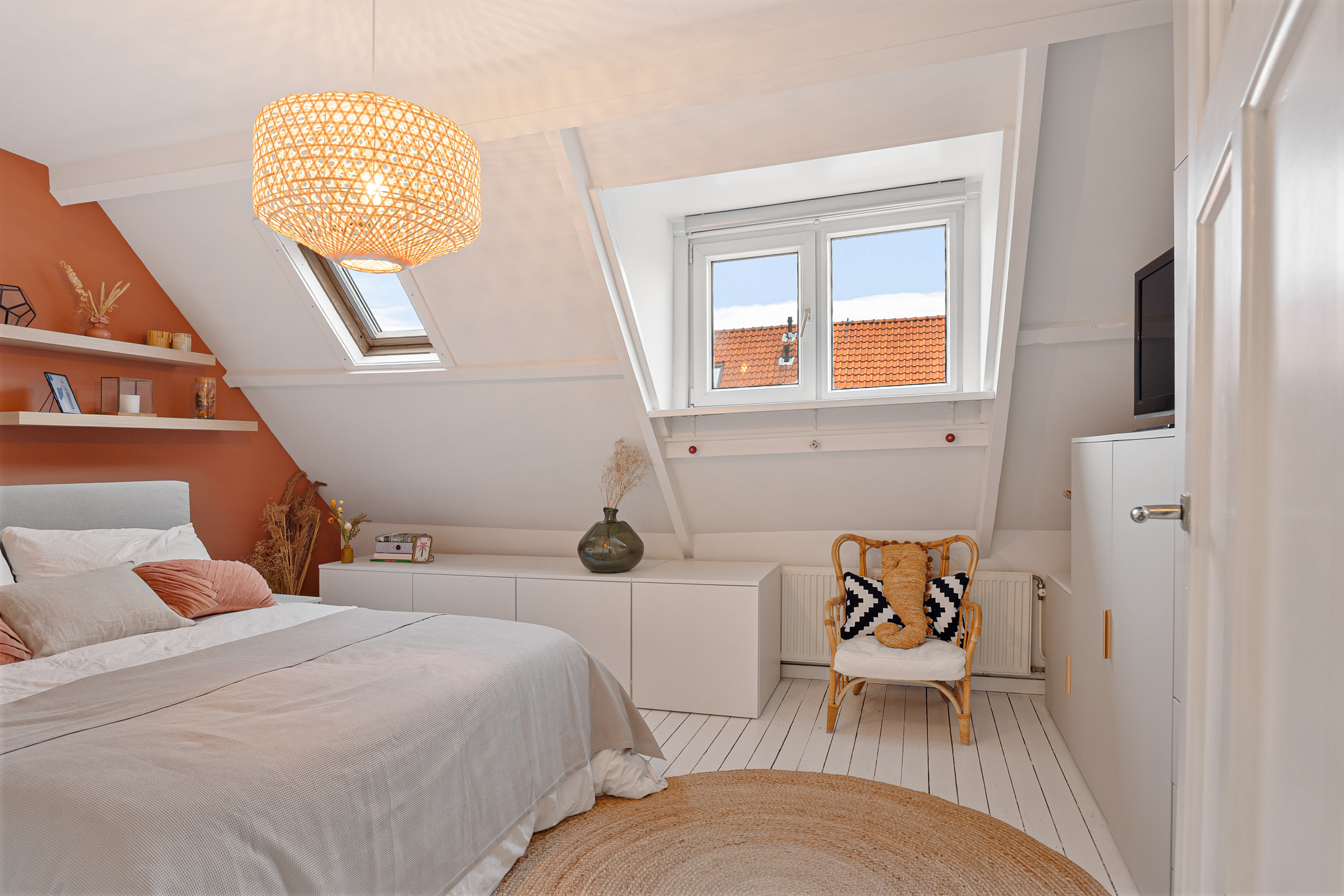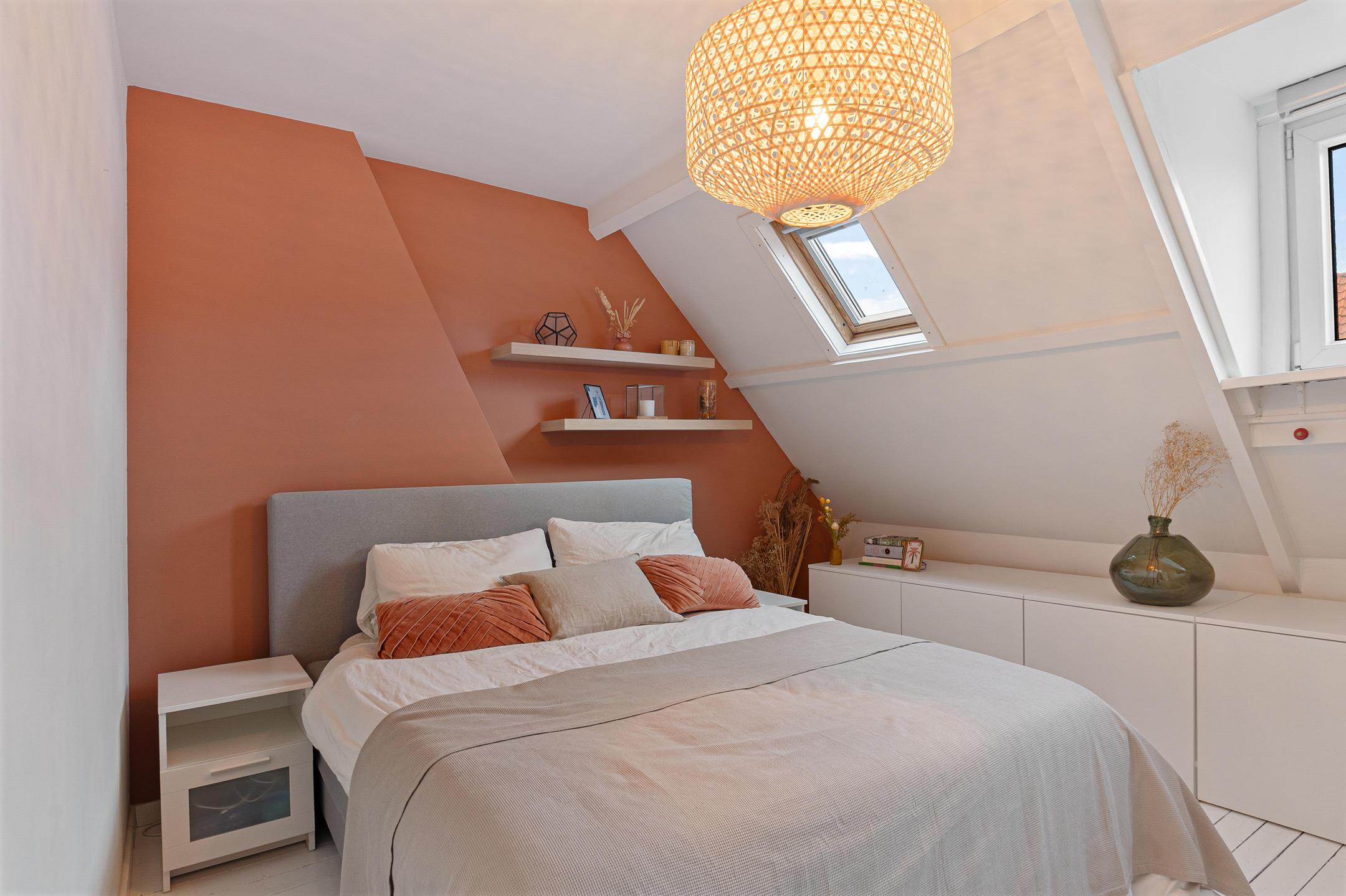 De bovenste verdieping is een verrassend lichte en sfeervolle ruimte. Drie grote Velux-dakramen met screens zorgen voor volop daglicht en ventilatie. Deze kamer is ideaal als extra slaapkamer, werkkamer of hobbyruimte. Achter de knieschotten is handige bergruimte aanwezig. Hier bevinden zich ook de cv-ketel (ATAG) en de wasmachineaansluiting.