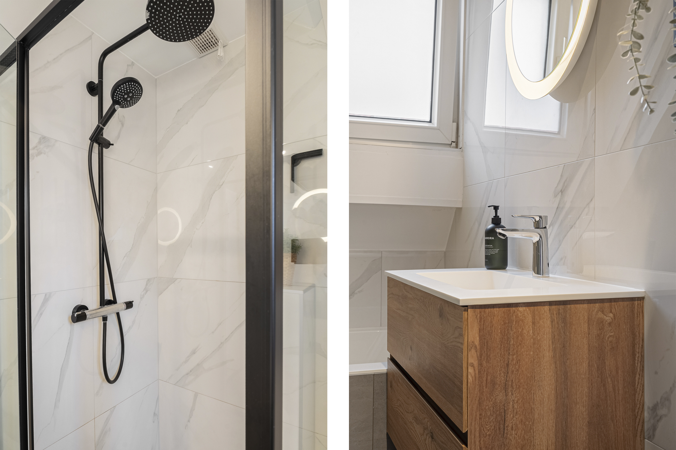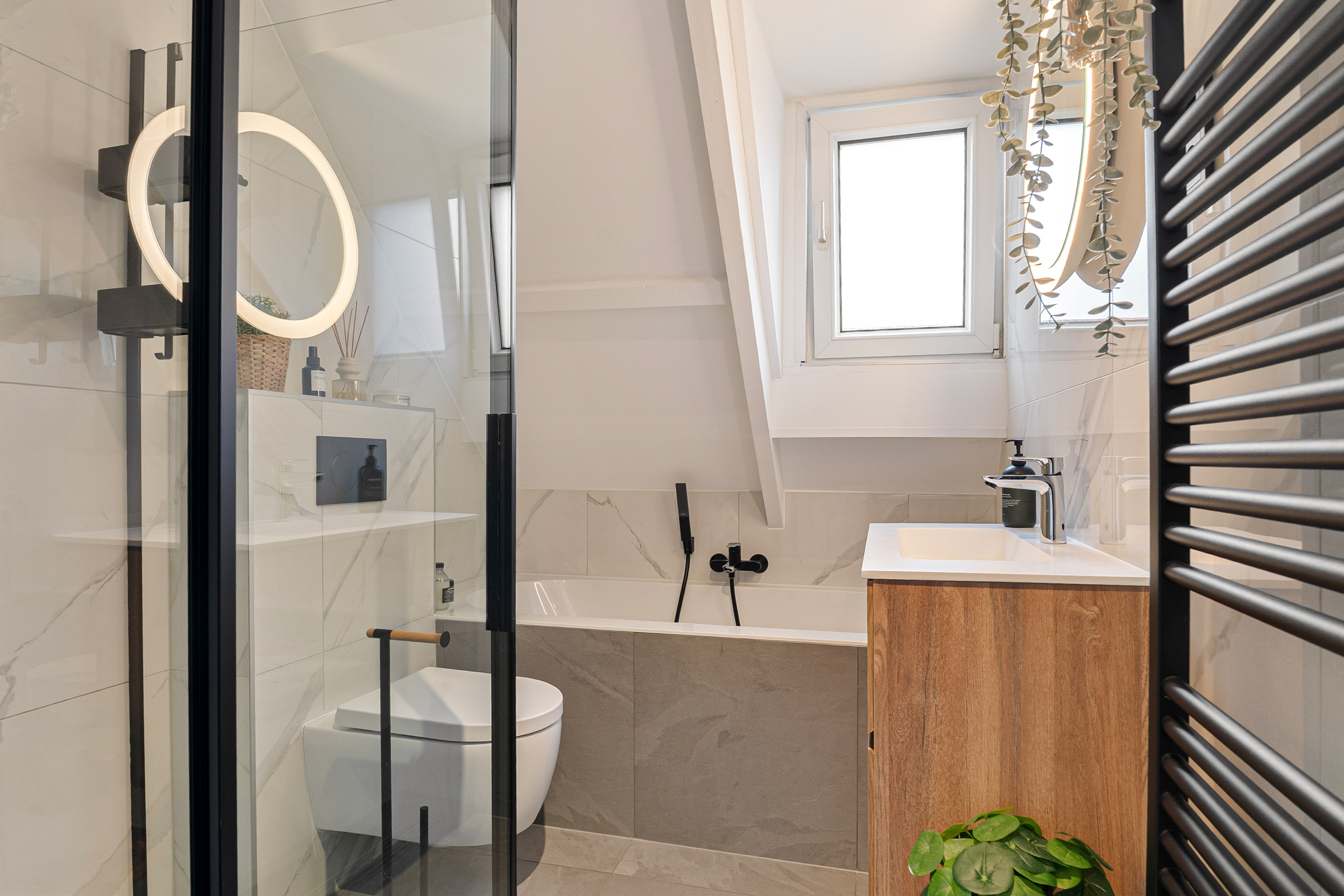 De overloop geeft toegang tot de recent vernieuwde badkamer (2021). Deze ruime, stijlvol afgewerkte badkamer is uitgerust met een comfortabel ligbad, een royale inloopdouche, een wandcloset, een modern wastafelmeubel en een designradiator.