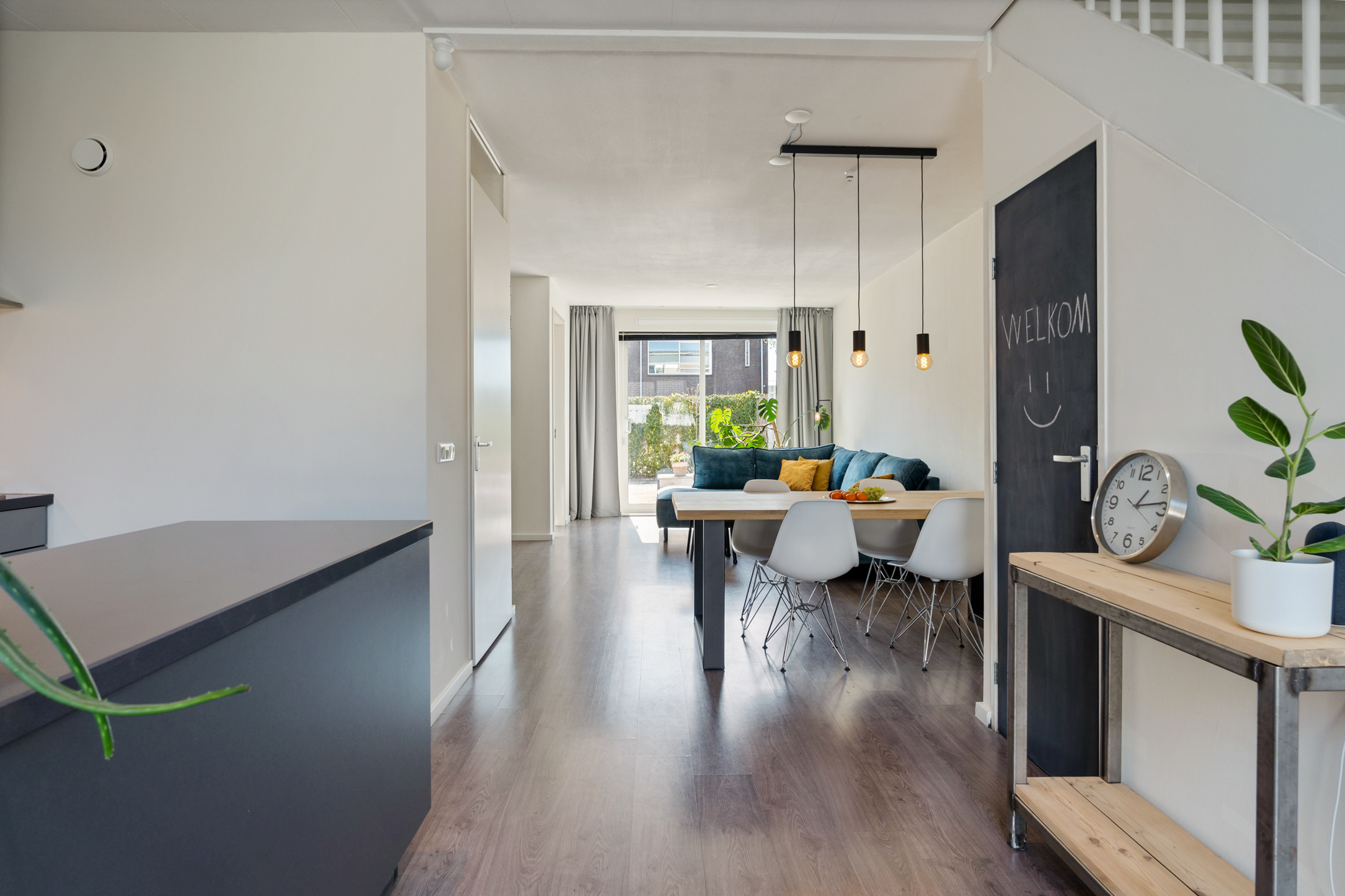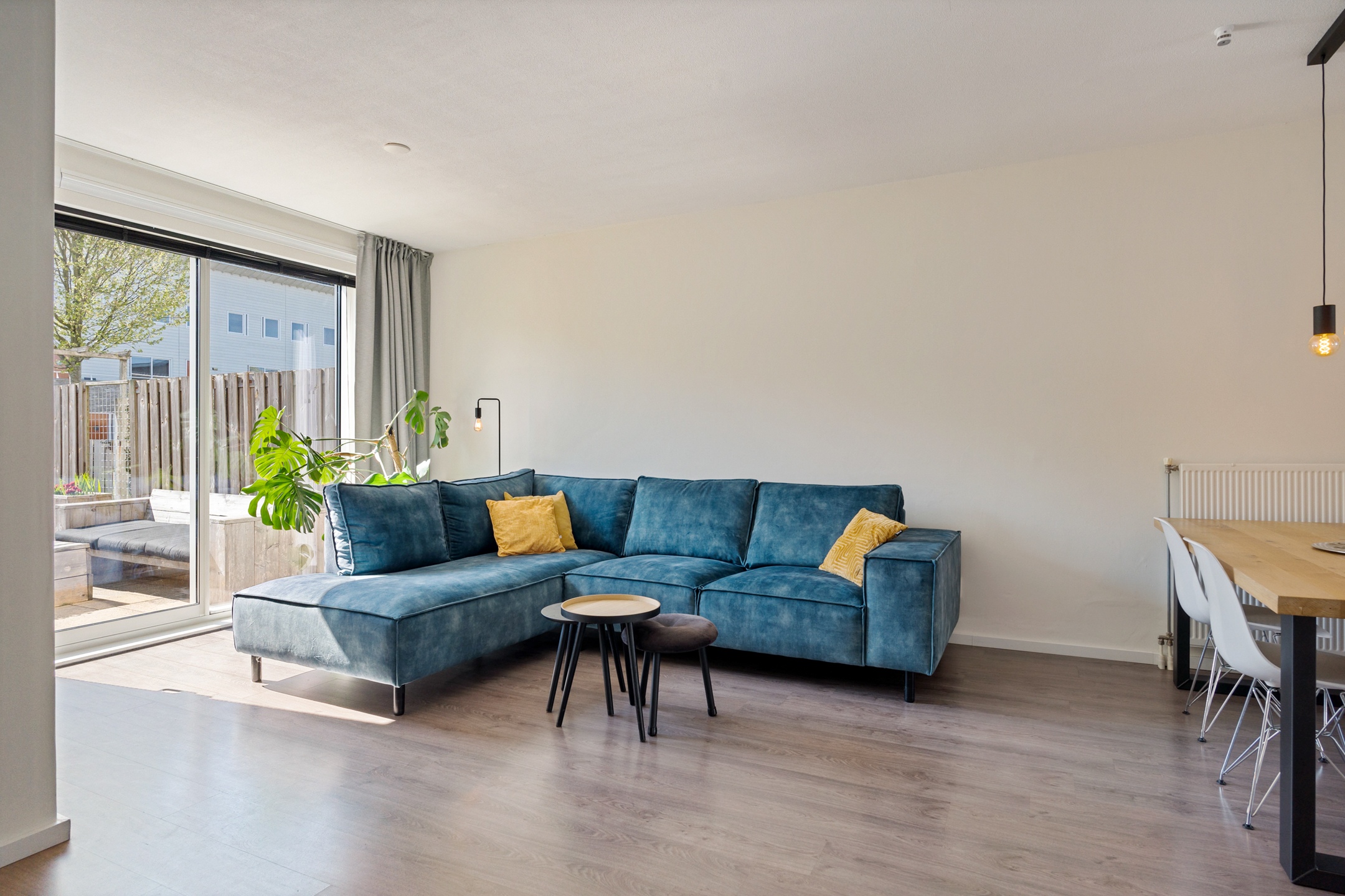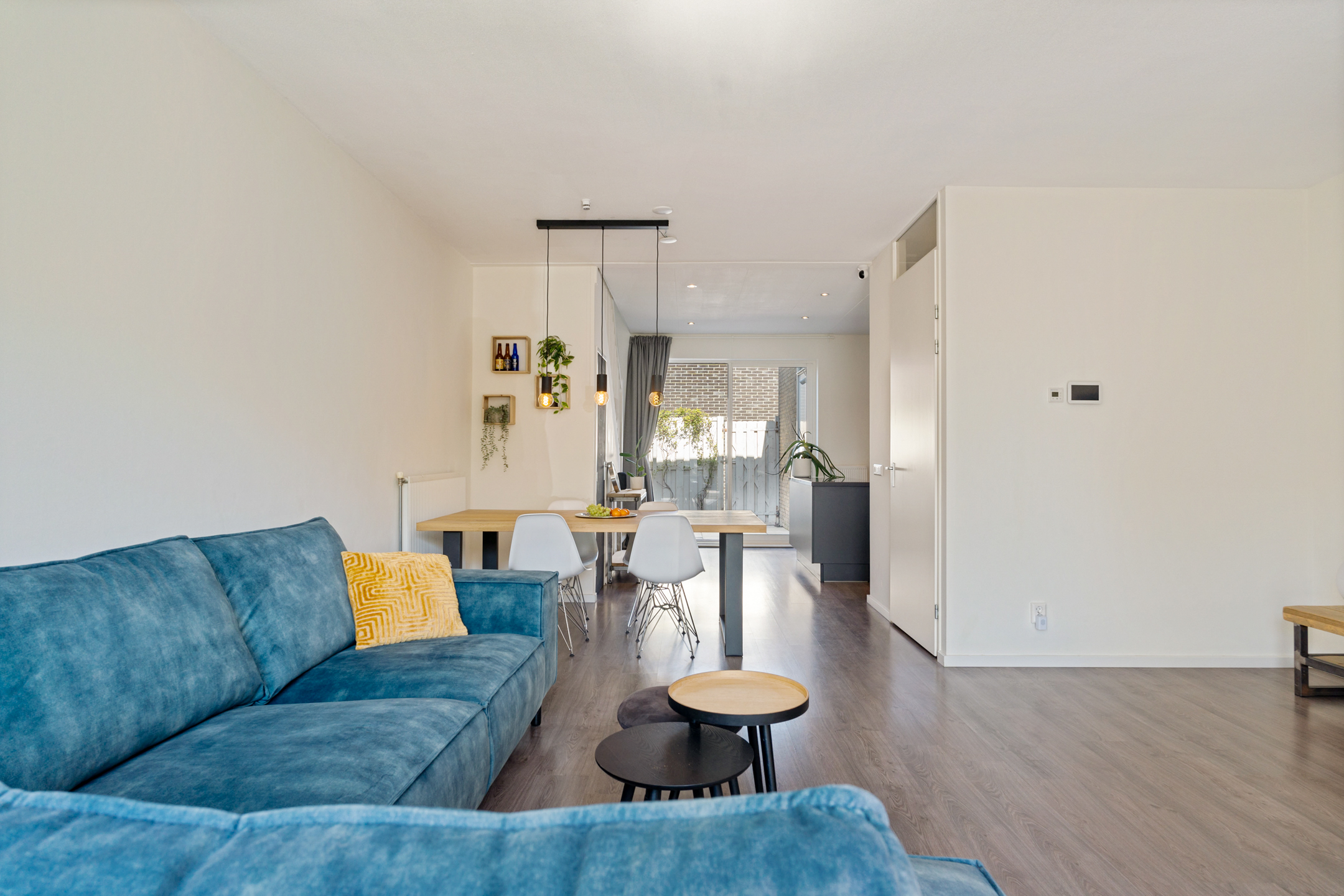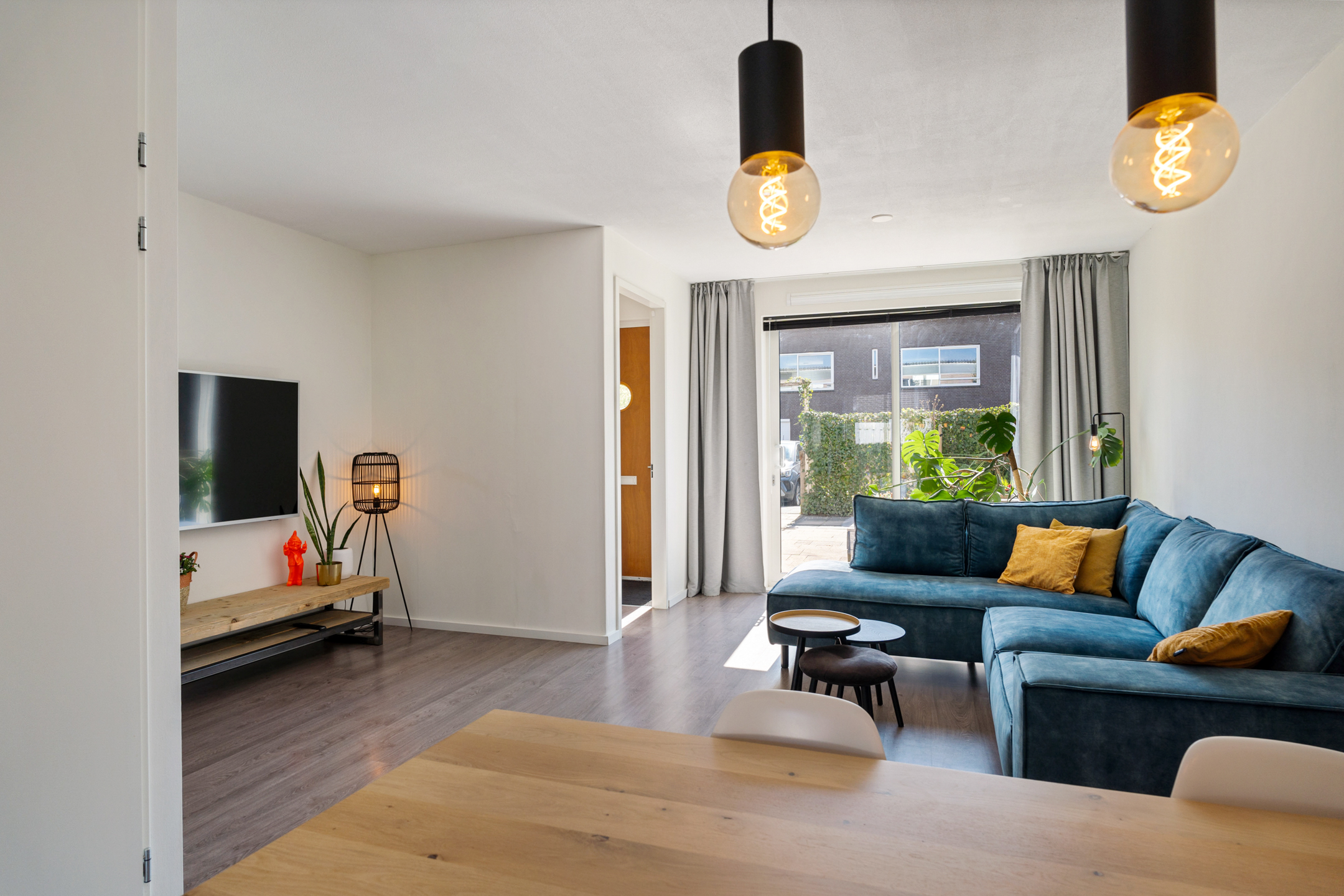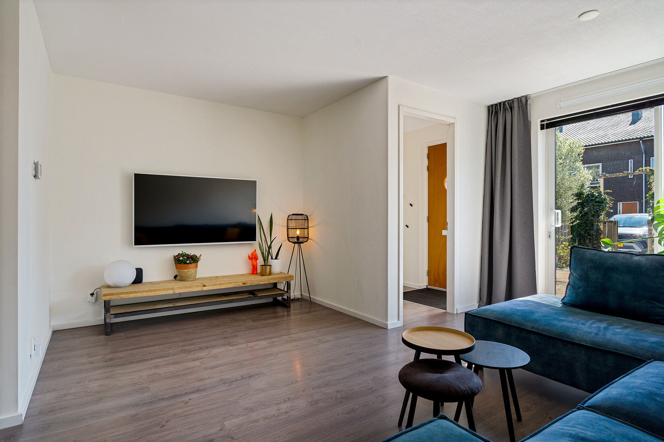 Je komt binnen via de diepe voortuin op het zuidwesten, een fijne plek waar je al vroeg op de dag van de zon kunt genieten. In de hal vind je de meterkast, garderoberuimte en toegang tot de lichte woonkamer. Het zitgedeelte ligt aan de voorzijde en dankzij de schuifpui staat het binnenleven hier naadloos in verbinding met buiten.