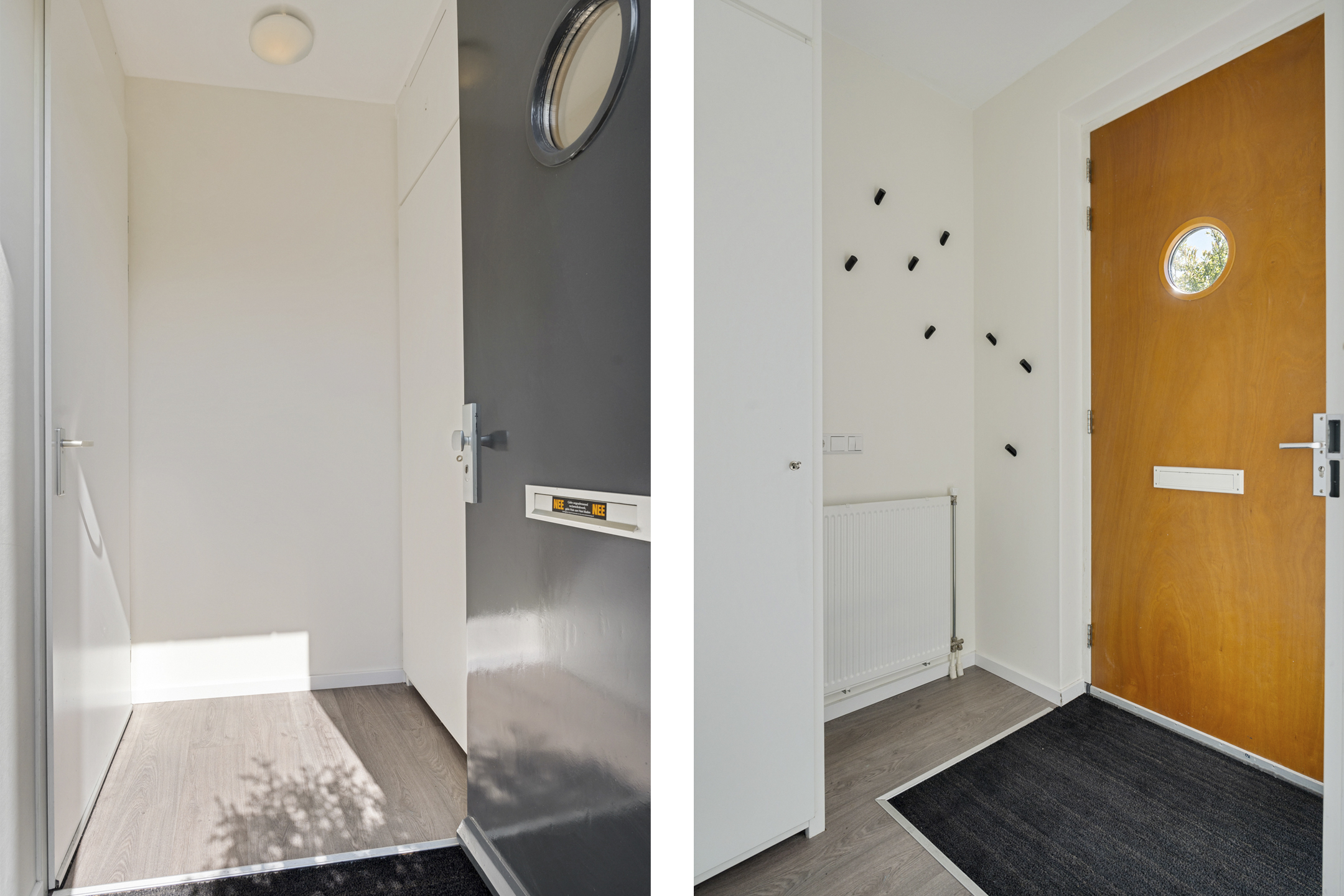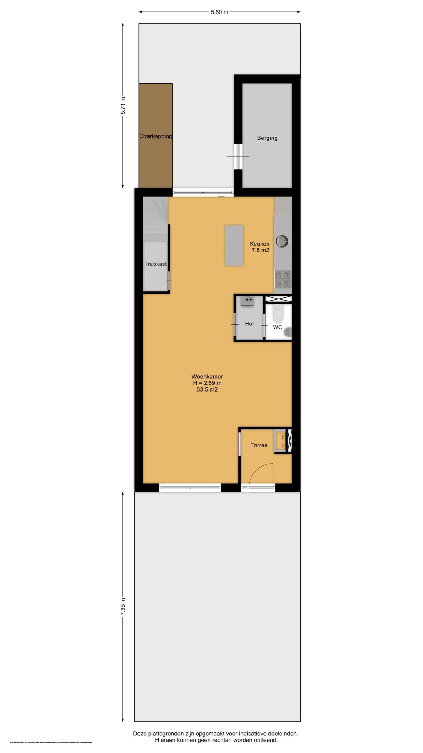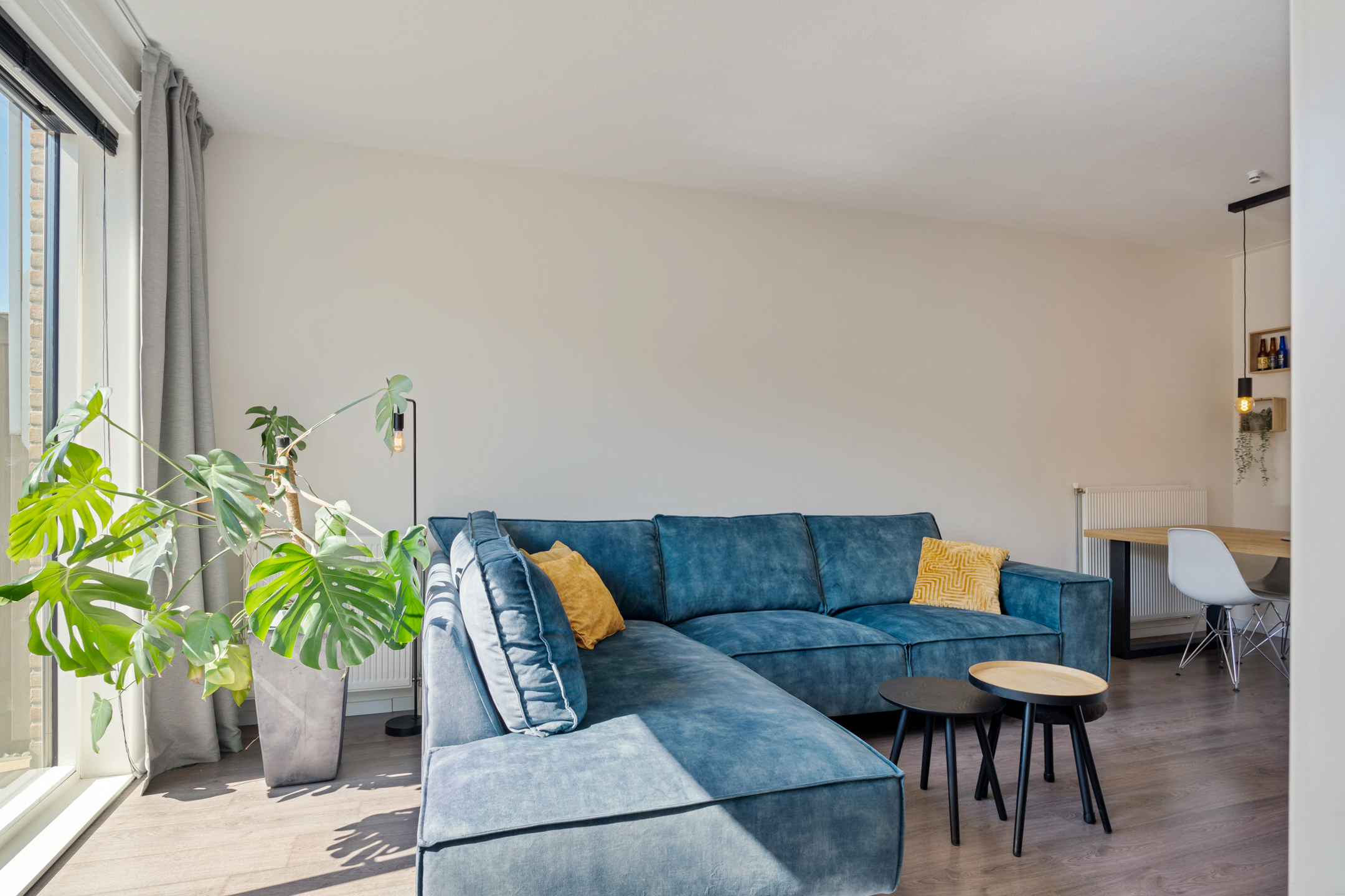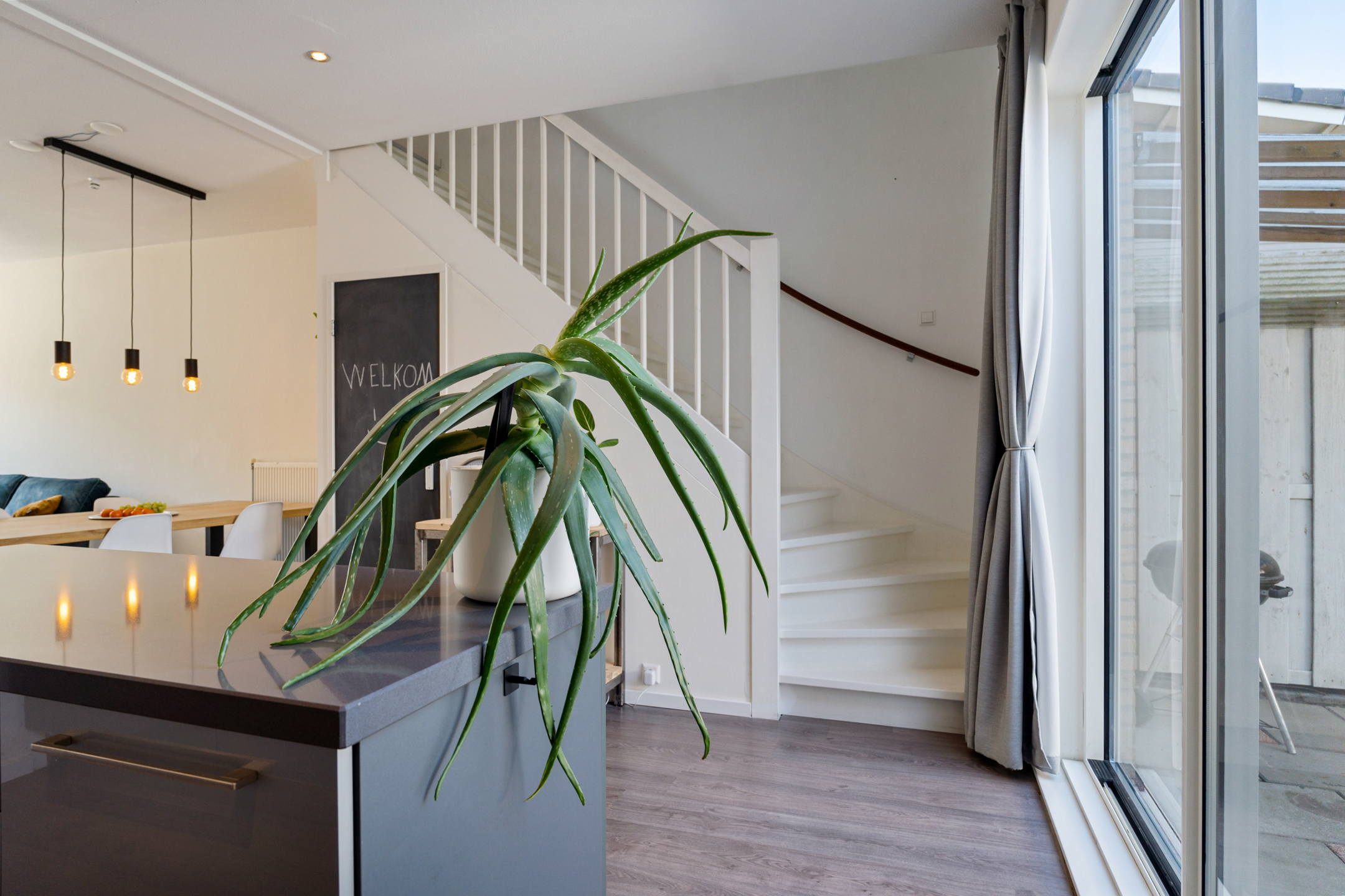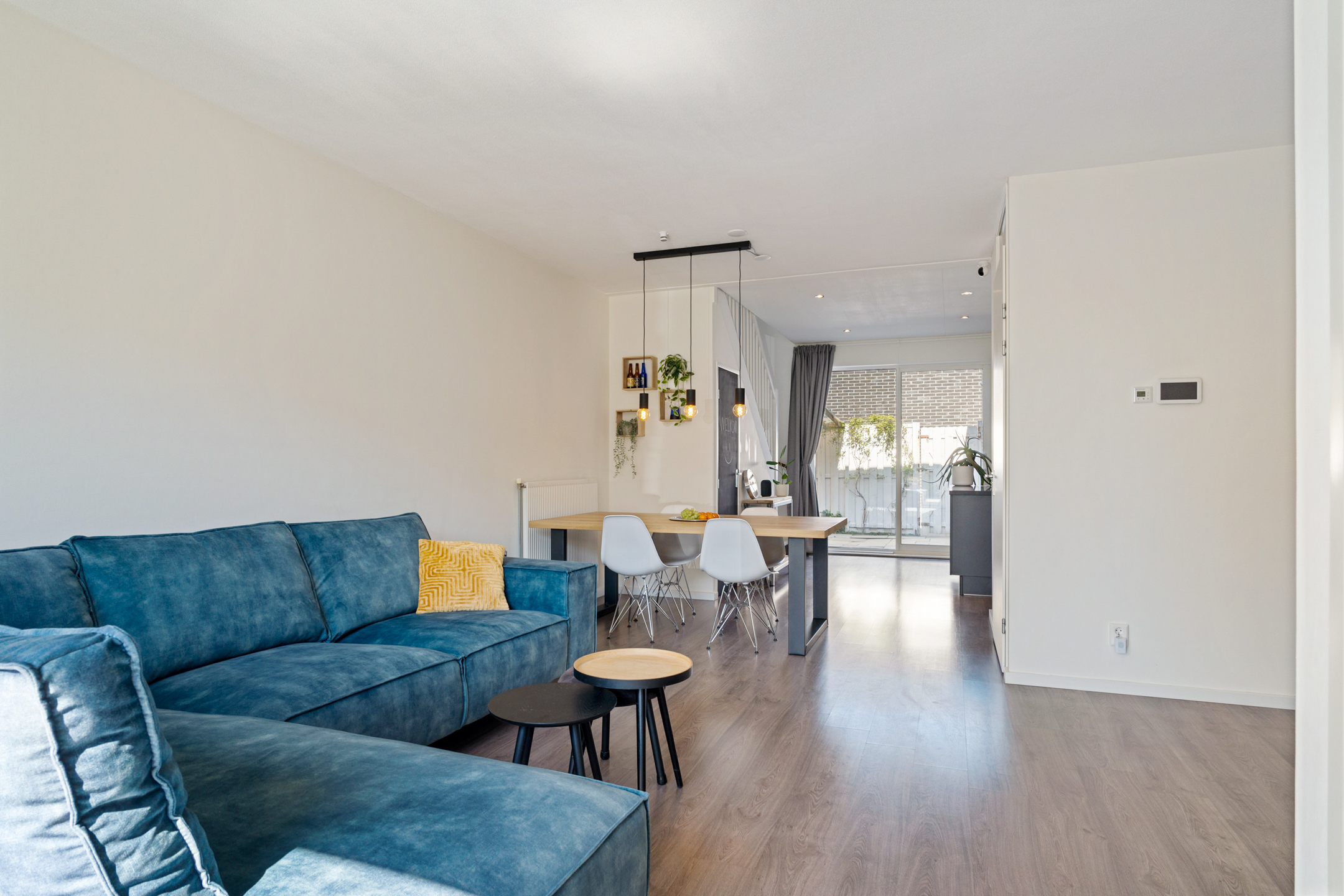 Je komt binnen via de diepe voortuin op het zuidwesten, een fijne plek waar je al vroeg op de dag van de zon kunt genieten. In de hal vind je de meterkast, garderoberuimte en toegang tot de lichte woonkamer. Het zitgedeelte ligt aan de voorzijde en dankzij de schuifpui staat het binnenleven hier naadloos in verbinding met buiten.