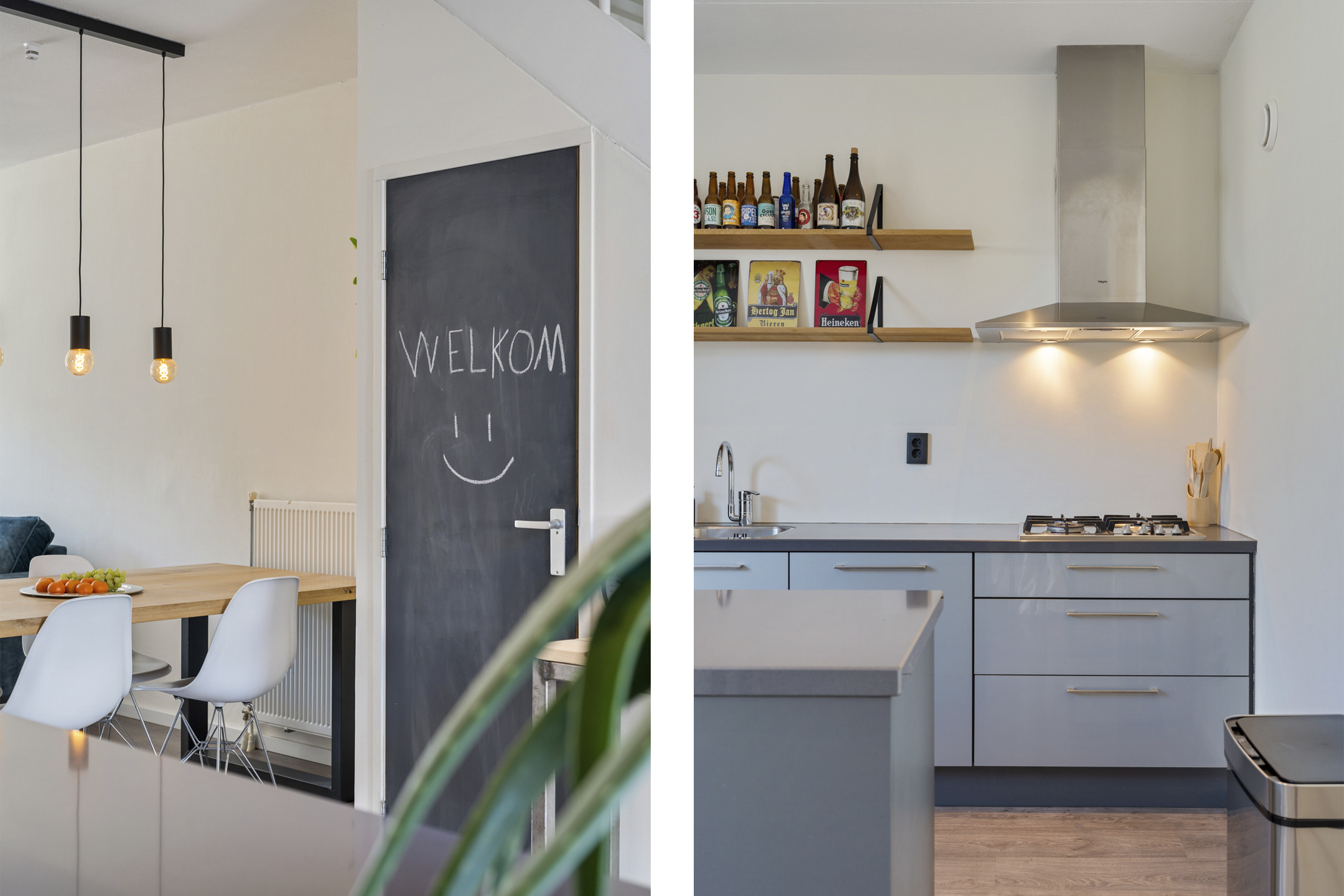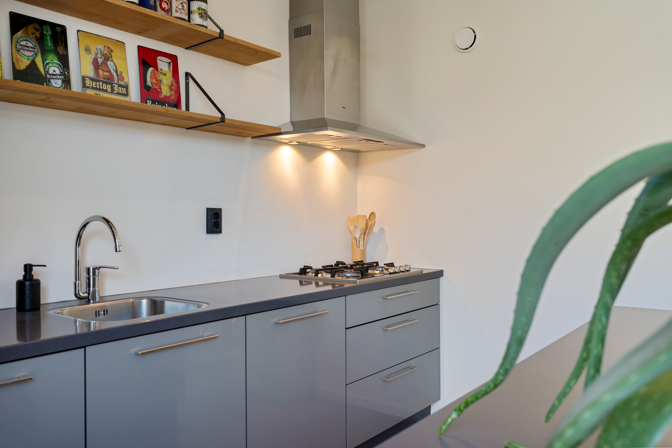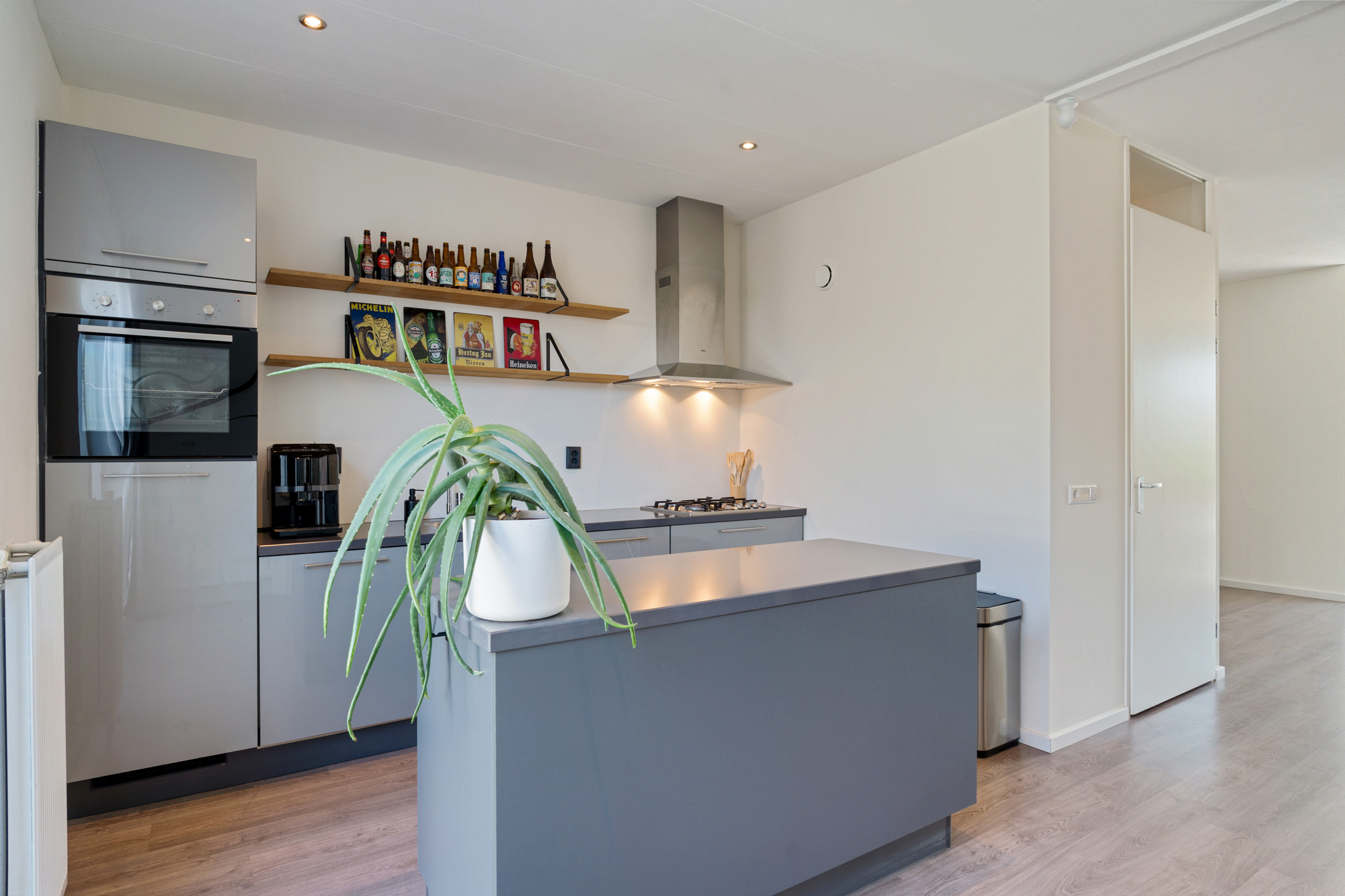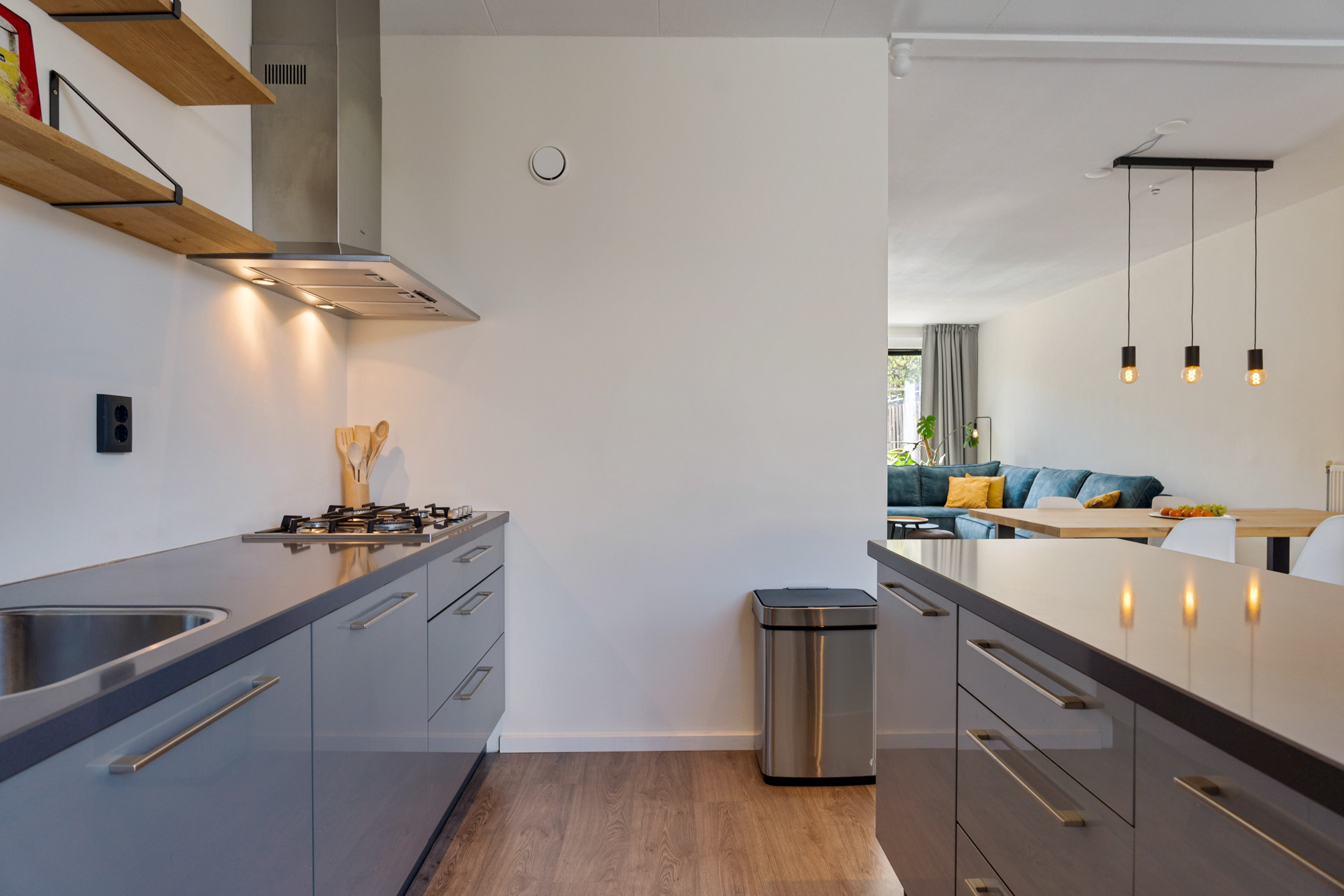 Centraal in de woning zit een tussenhal met een modern toilet en de opstelling van de cv-ketel. Aan de achterzijde wacht een echte eyecatcher: de ruime en luxe woonkeuken met kookeiland. De keuken is strak vormgegeven en voorzien van alle inbouwapparatuur die je nodig hebt: een 4-pits gasfornuis, afzuigkap, oven, magnetron, koelkast en vaatwasser.