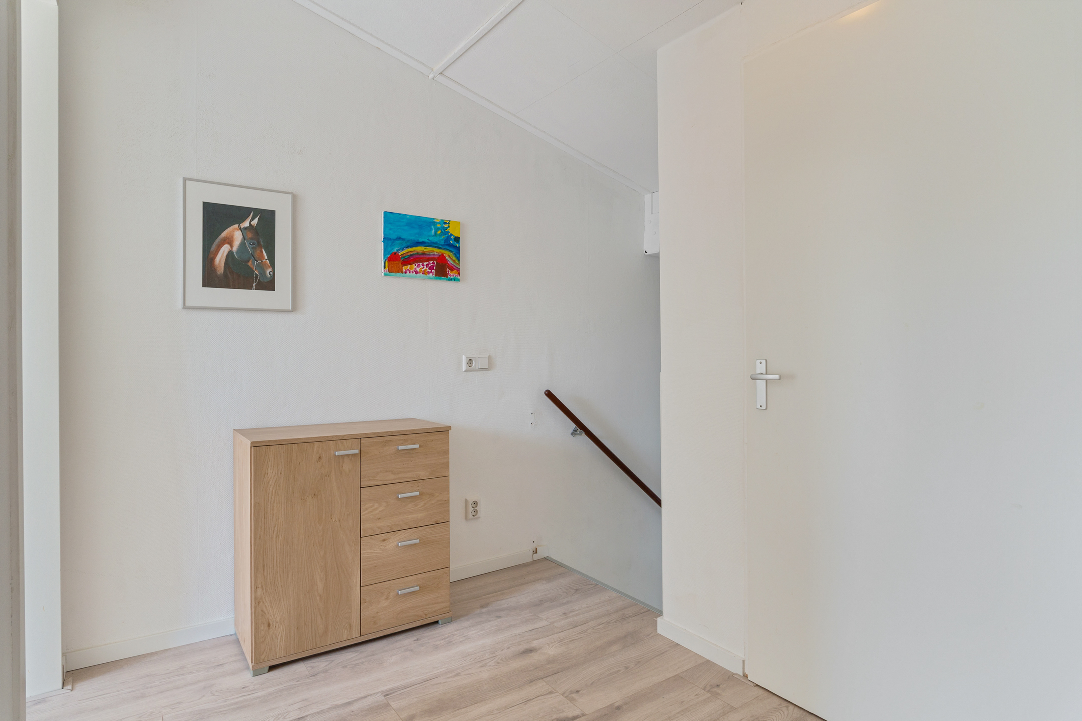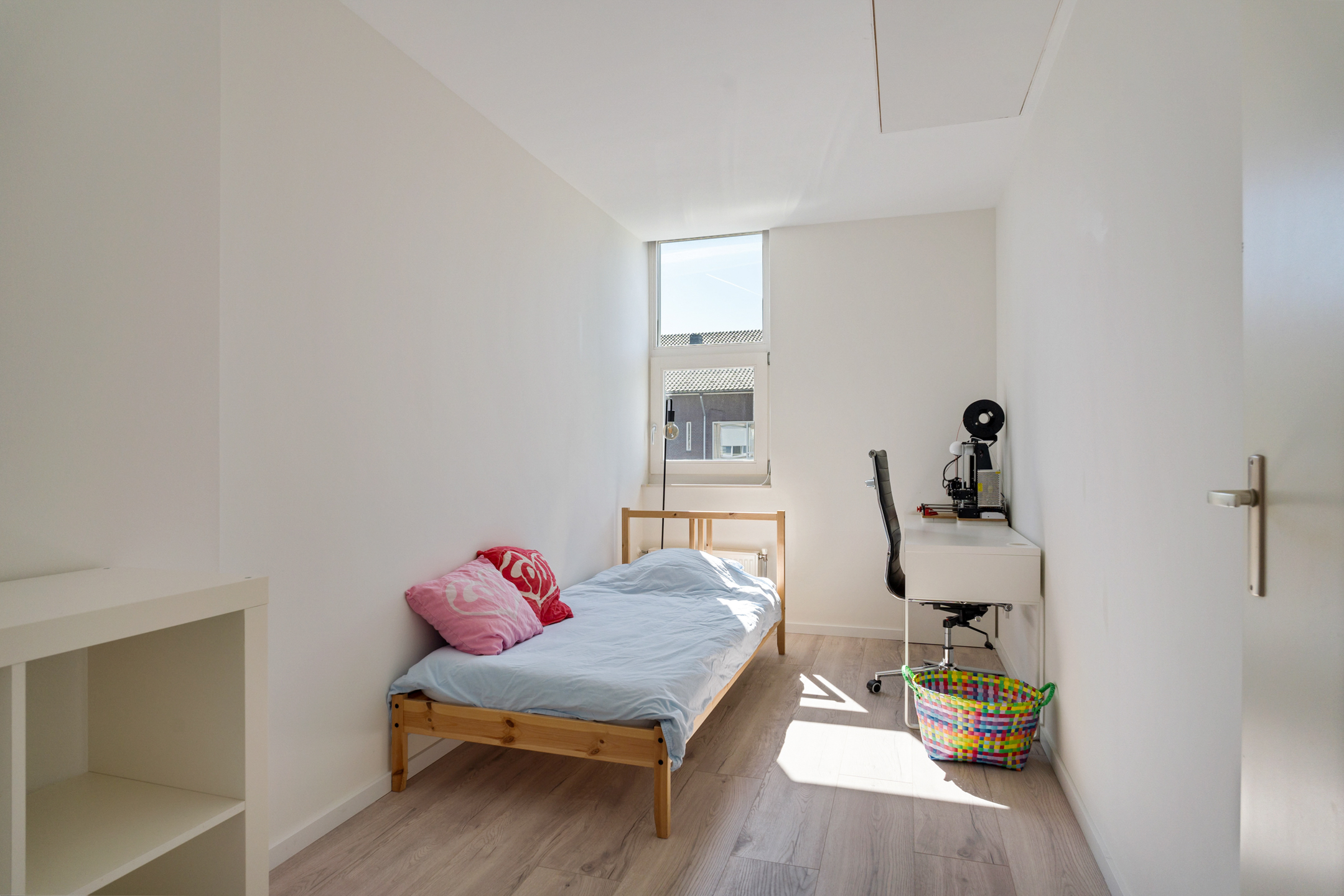 Extra bergruimte nodig? Via een vlizotrap in de kleinere slaapkamer aan de voorzijde bereik je de handige vliering, ideaal voor het opbergen van koffers, seizoensspullen of archiefdozen.