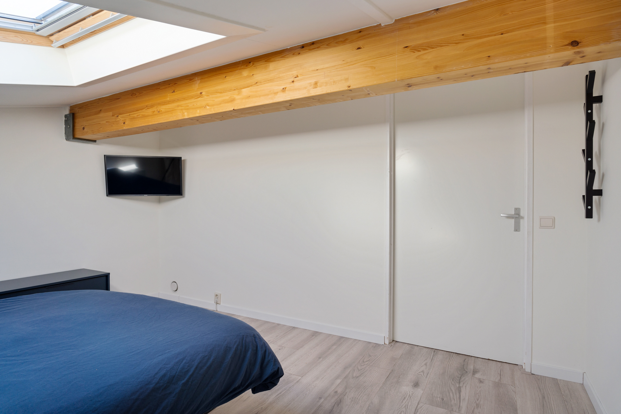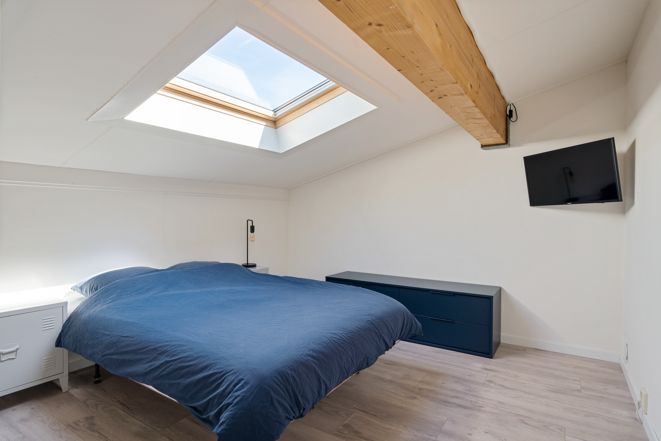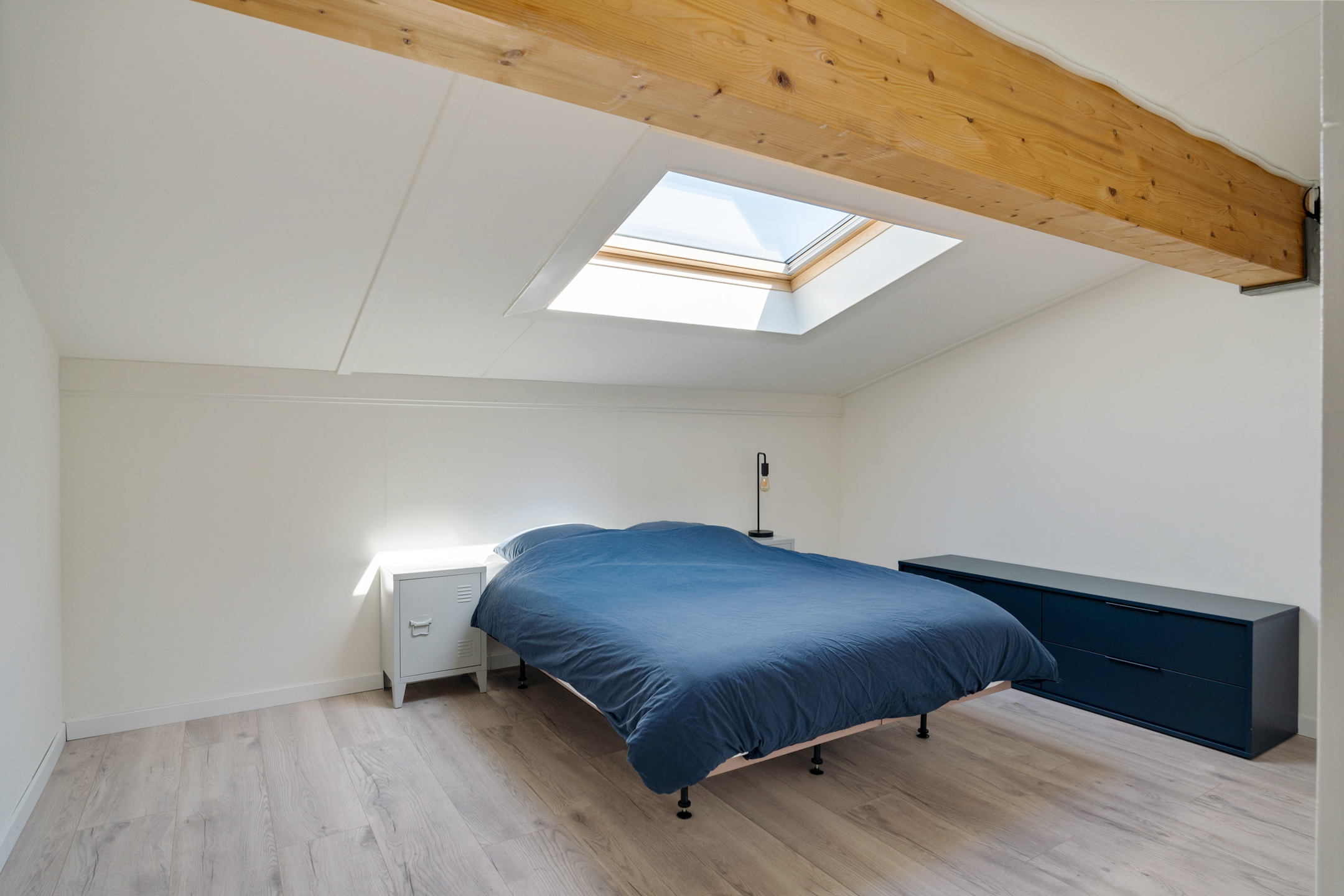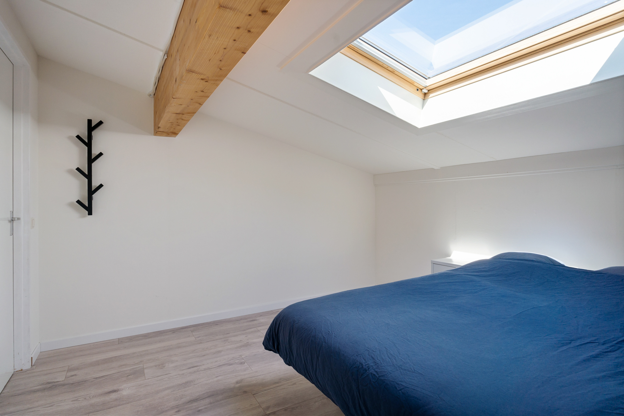 Op de eerste verdieping vind je drie comfortabele slaapkamers, elk met een eigen karakter. De kamer aan de achterzijde is royaal en ligt onder de schuine kap en voelt knus en sfeervol aan. Verder beschikt de kamer over een groot dakraam precies boven het bed – zo begin je de dag met zonlicht en eindig je met uitzicht op de sterren.