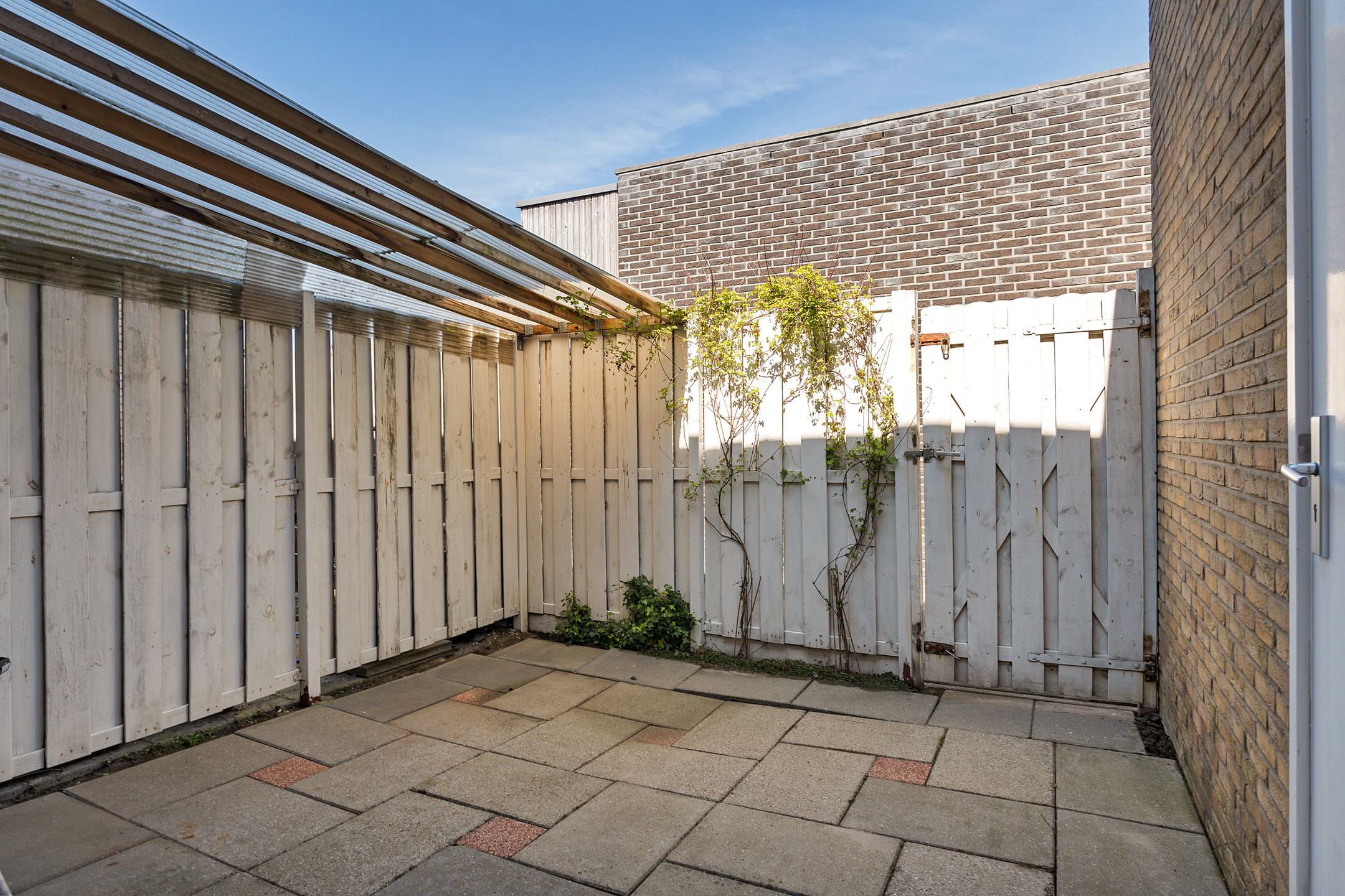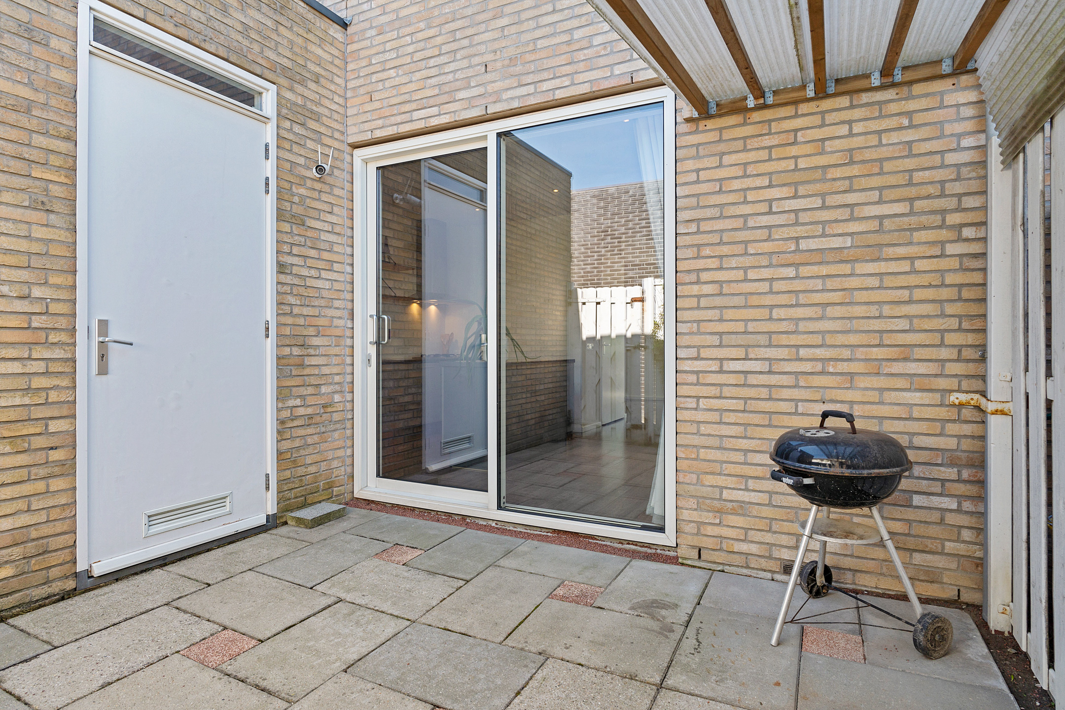 Vanuit de keuken stap je via een tweede schuifpui zo de achtertuin in. Deze tuin is onderhoudsvriendelijk aangelegd, heeft veel privacy en is voorzien van een ruime overkapping en een grote berging – ideaal voor fietsen en tuinspullen.