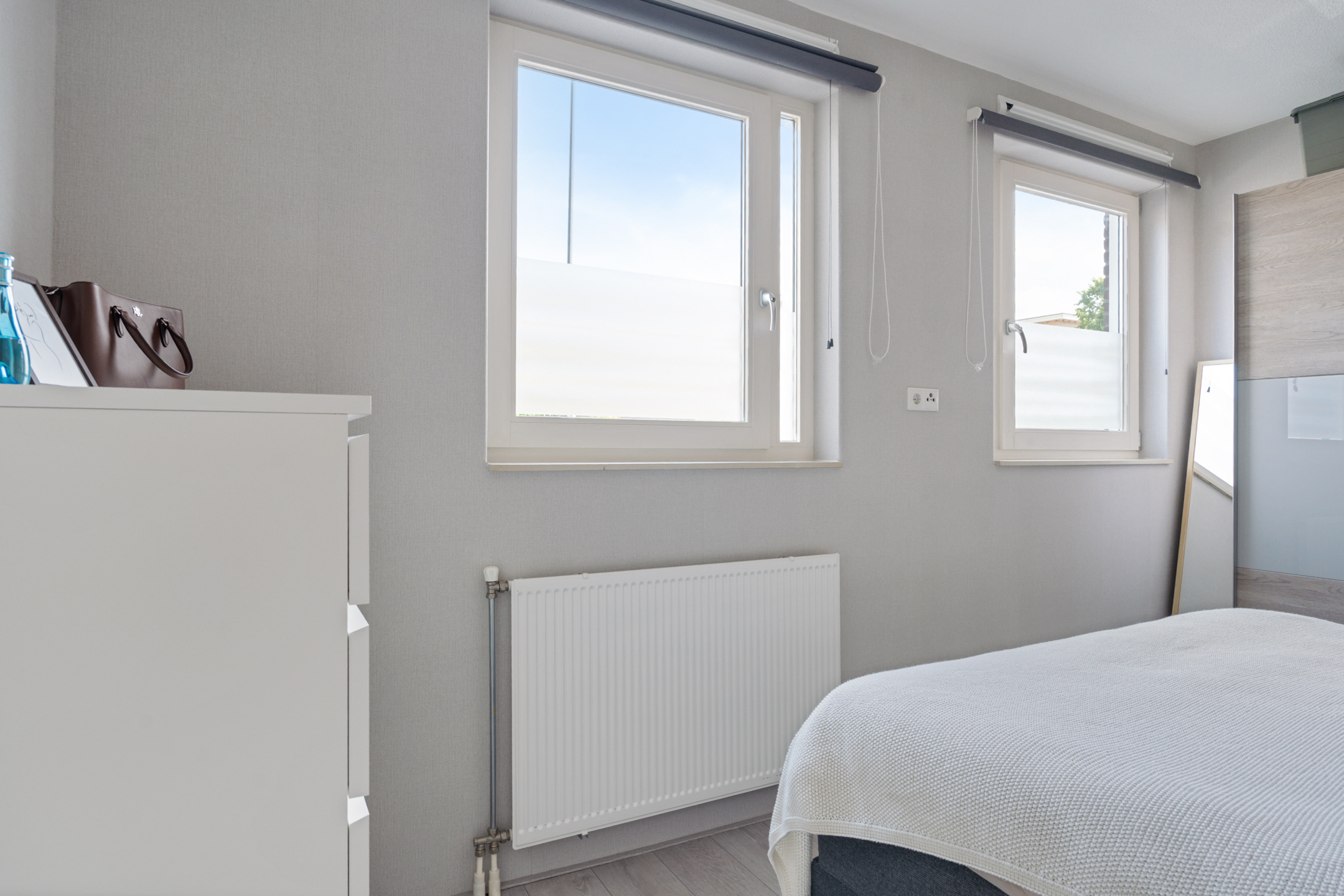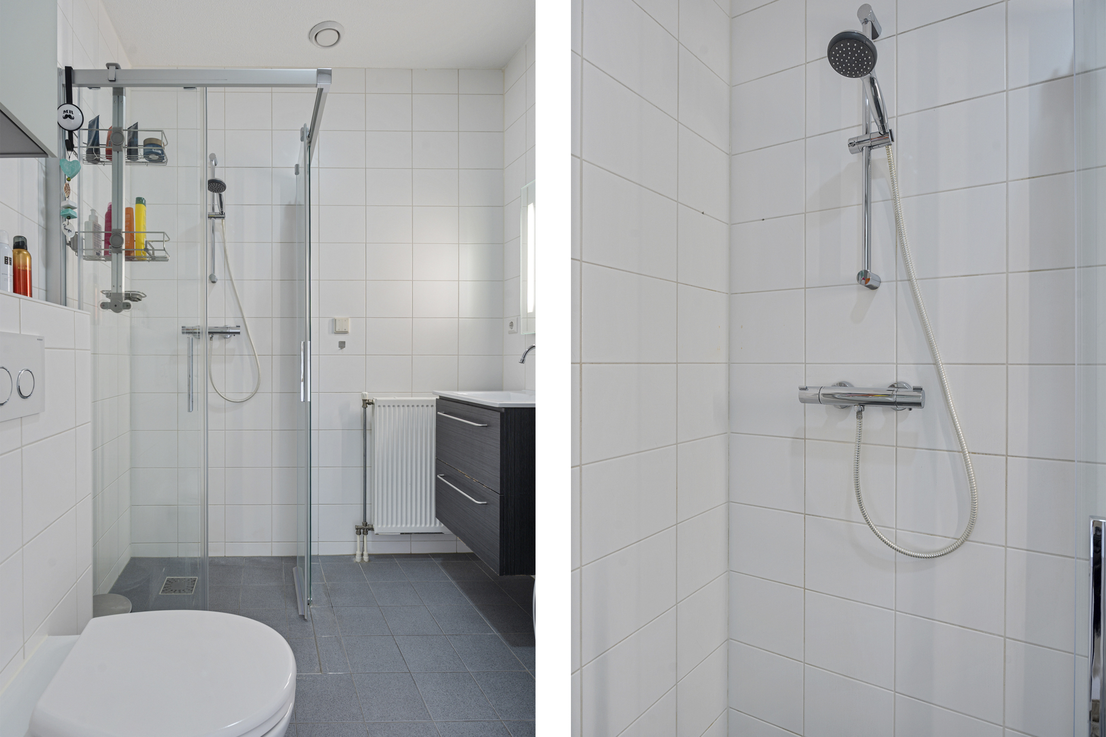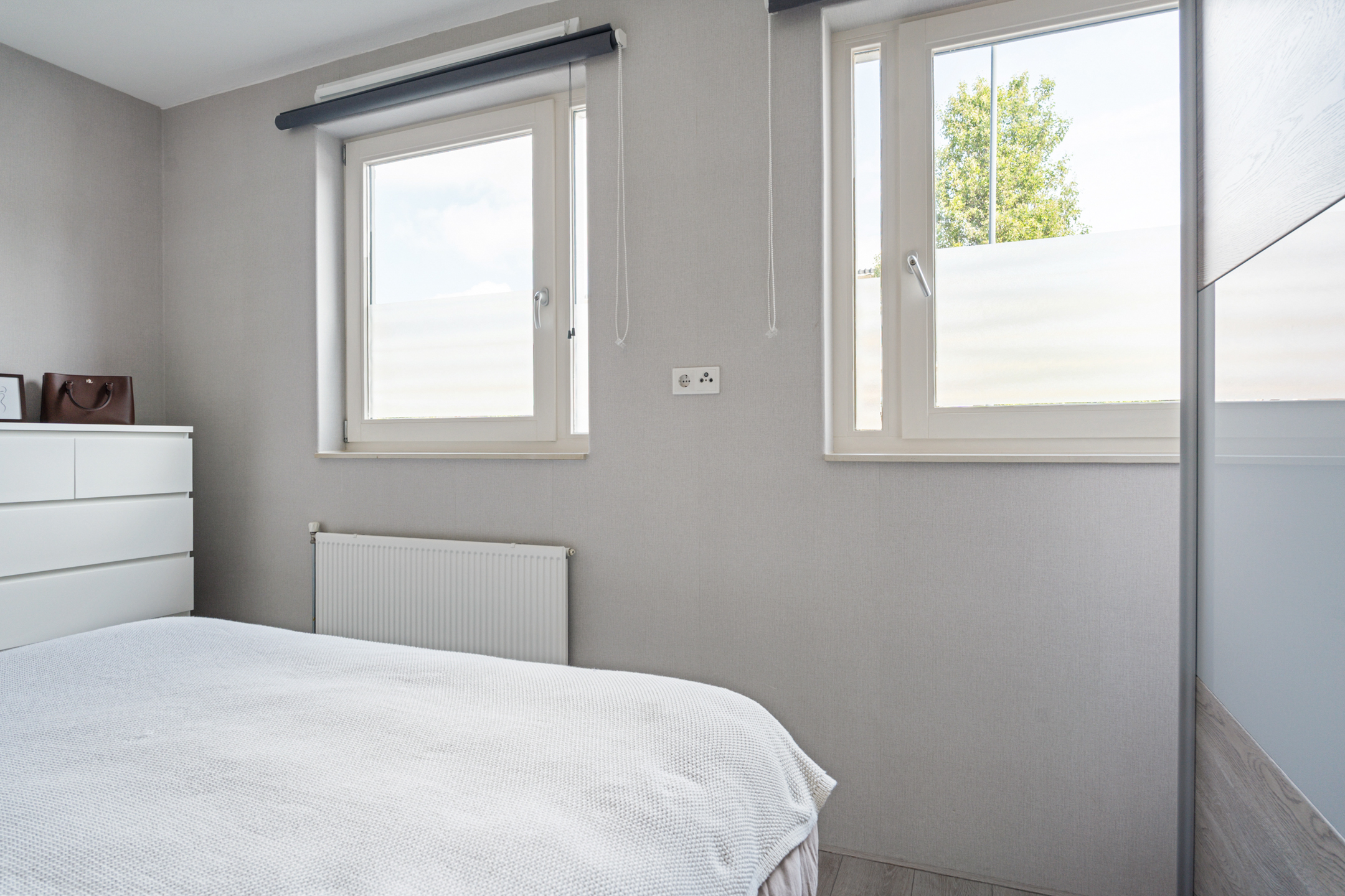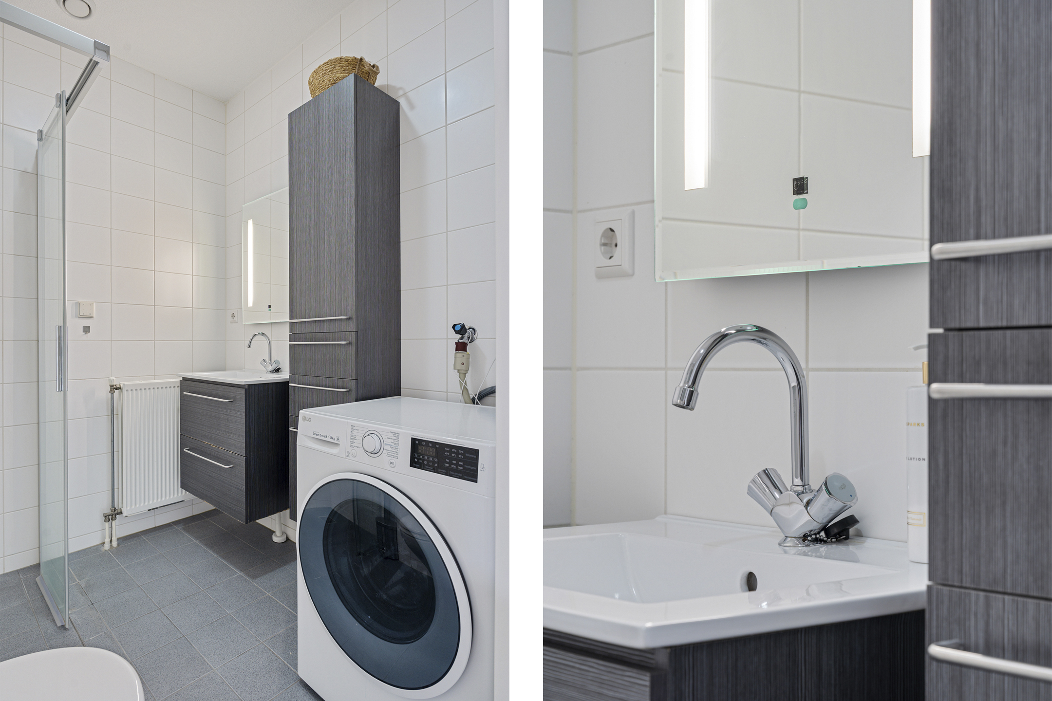 De ruime slaapkamer ligt aan de voorzijde van de woning en biedt voldoende ruimte voor een groot bed en kast. De badkamer is volledig betegeld en voorzien van een douchehoek met glazen wand, een hangend toilet, een wastafel en aansluitingen voor je wasmachine en droger.