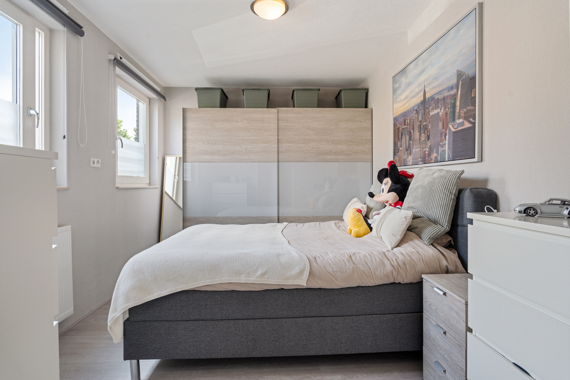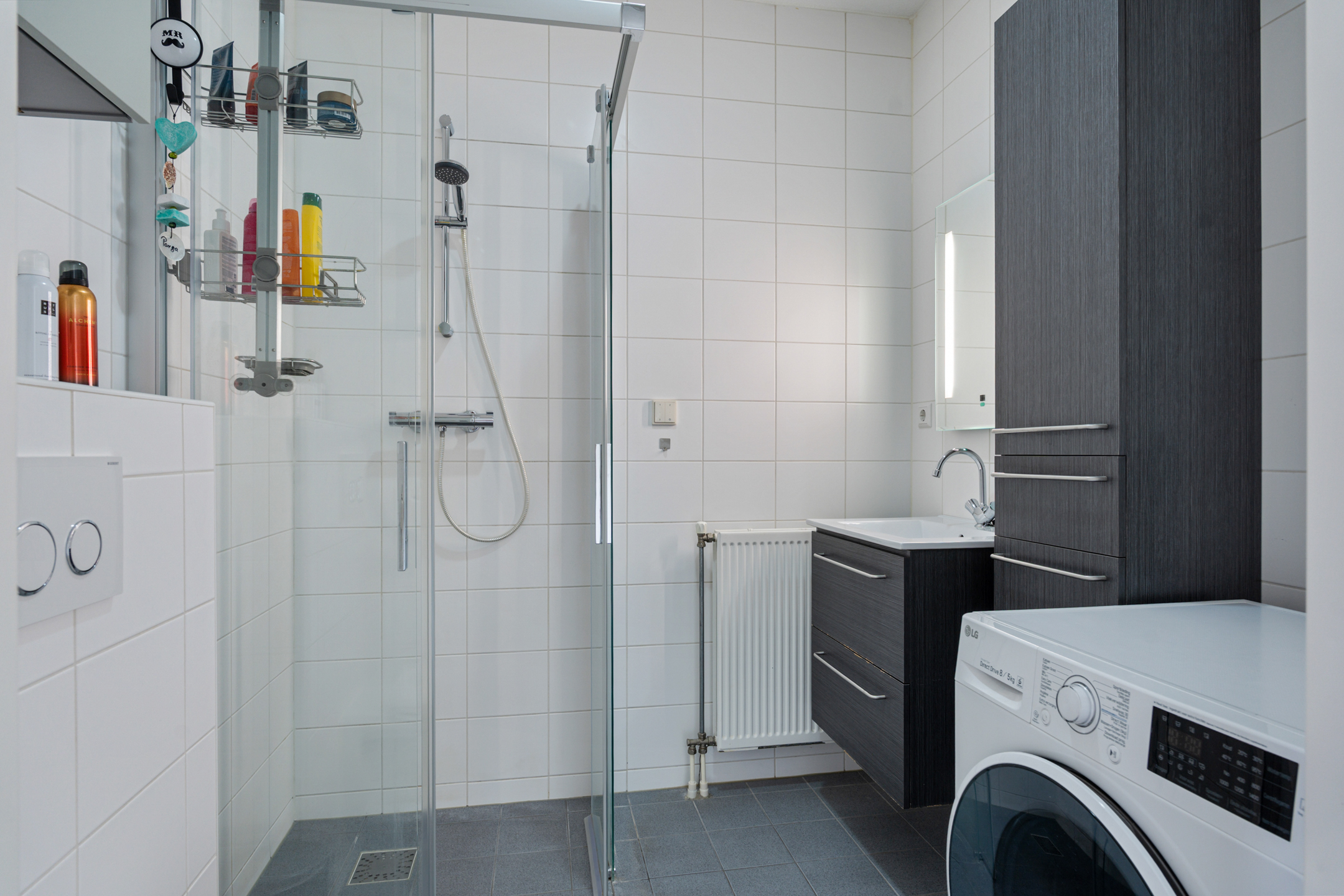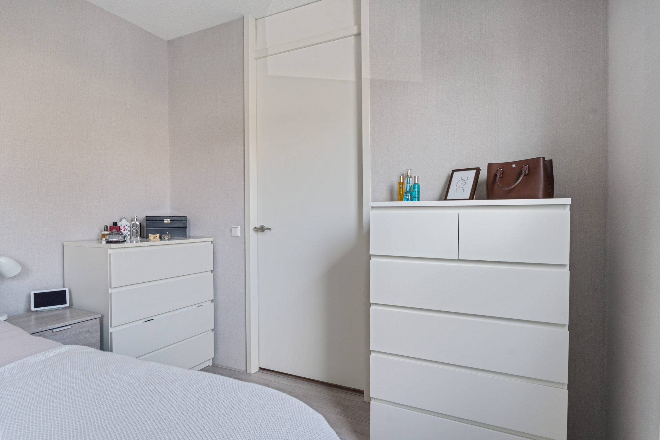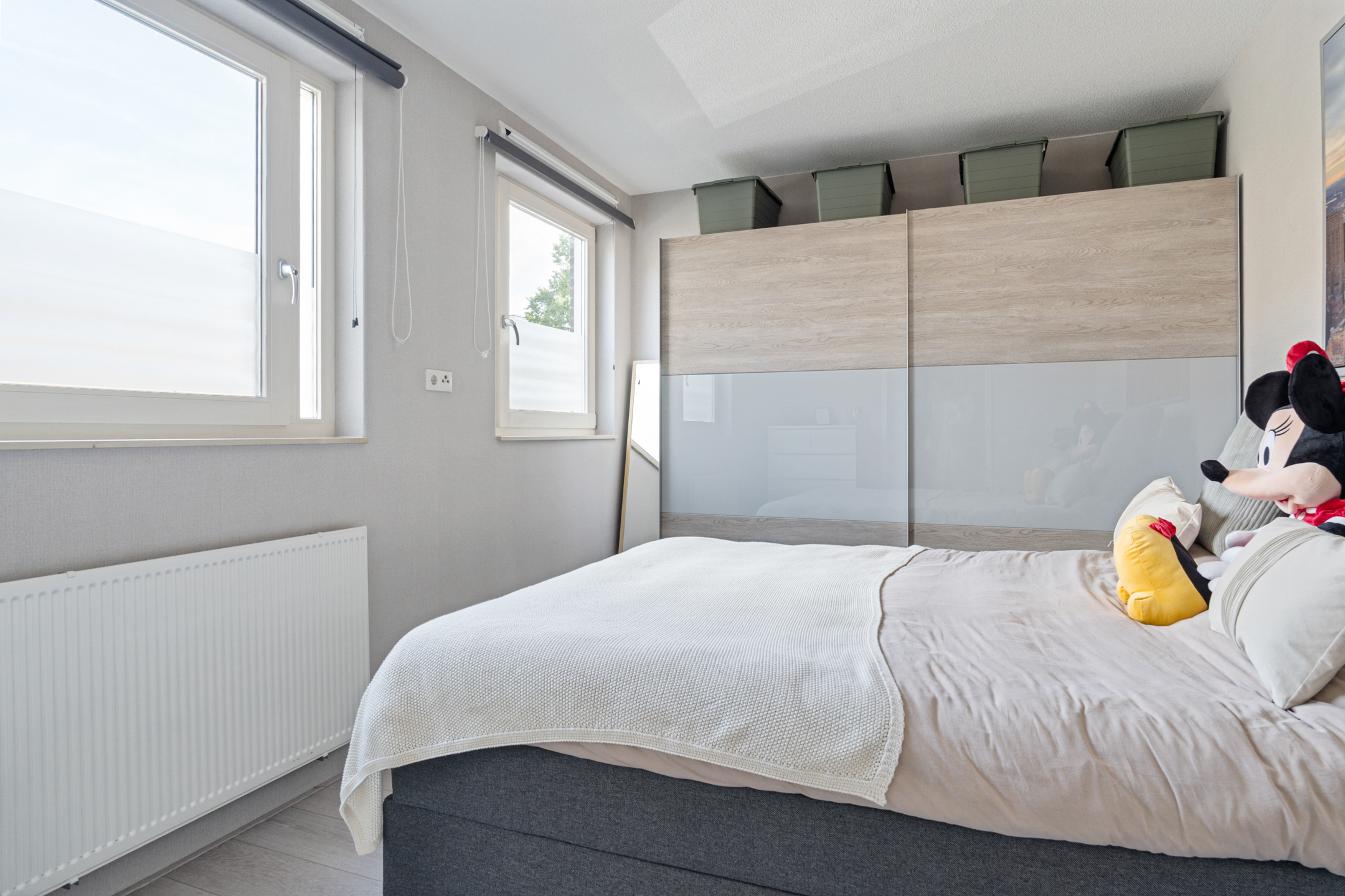 De ruime slaapkamer ligt aan de voorzijde van de woning en biedt voldoende ruimte voor een groot bed en kast. De badkamer is volledig betegeld en voorzien van een douchehoek met glazen wand, een hangend toilet, een wastafel en aansluitingen voor je wasmachine en droger.