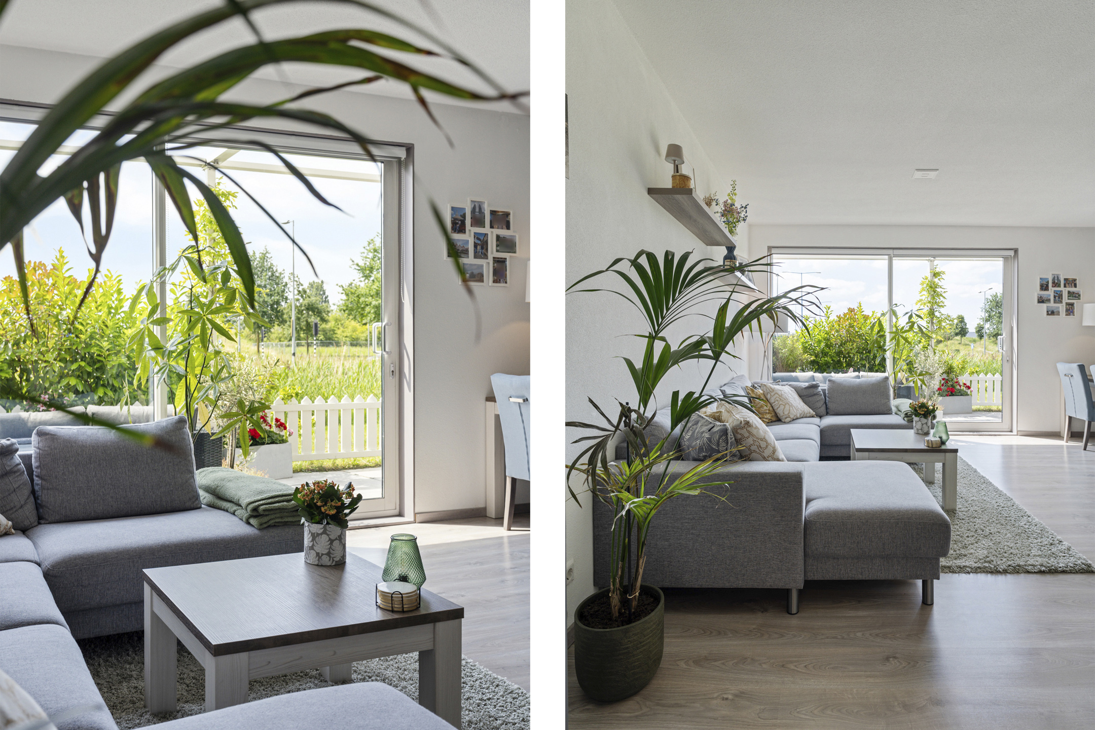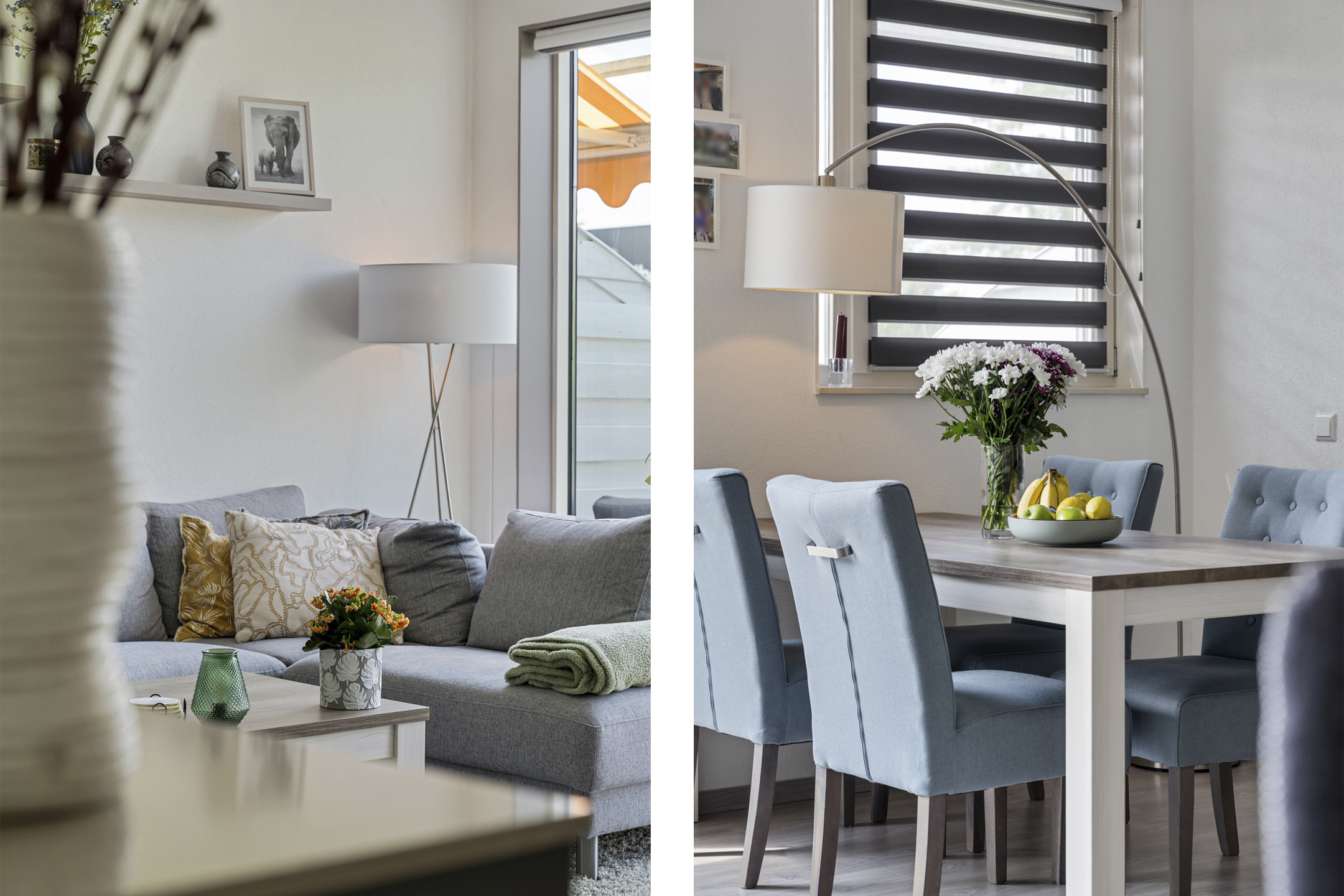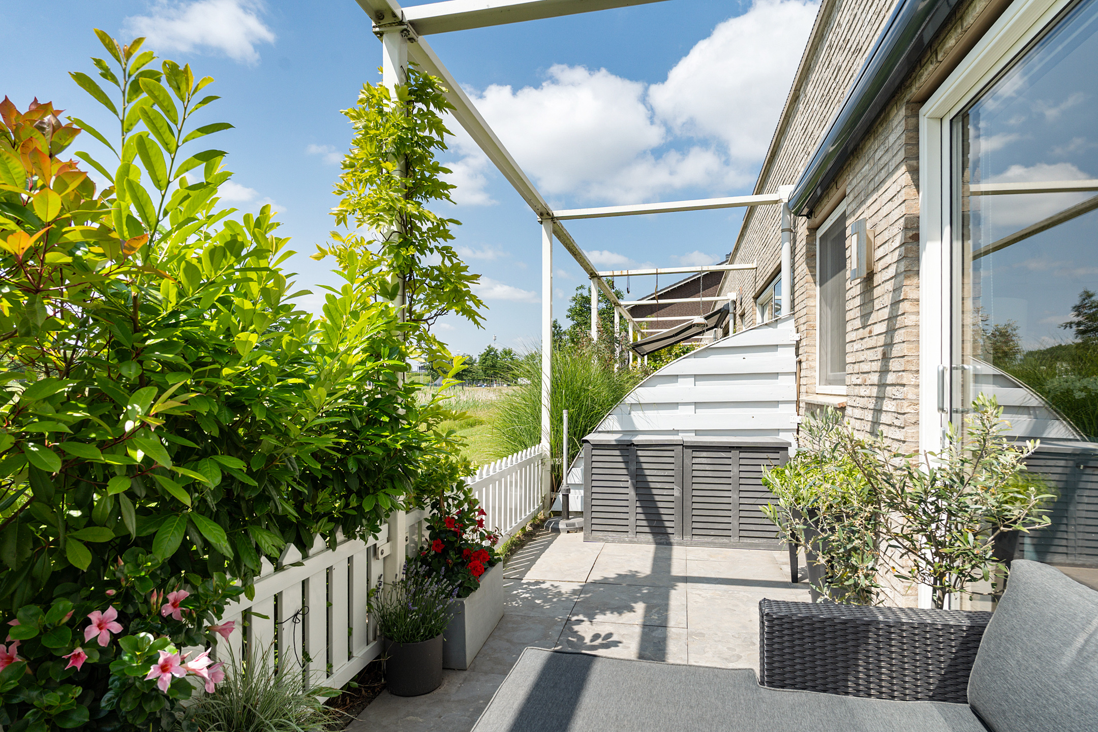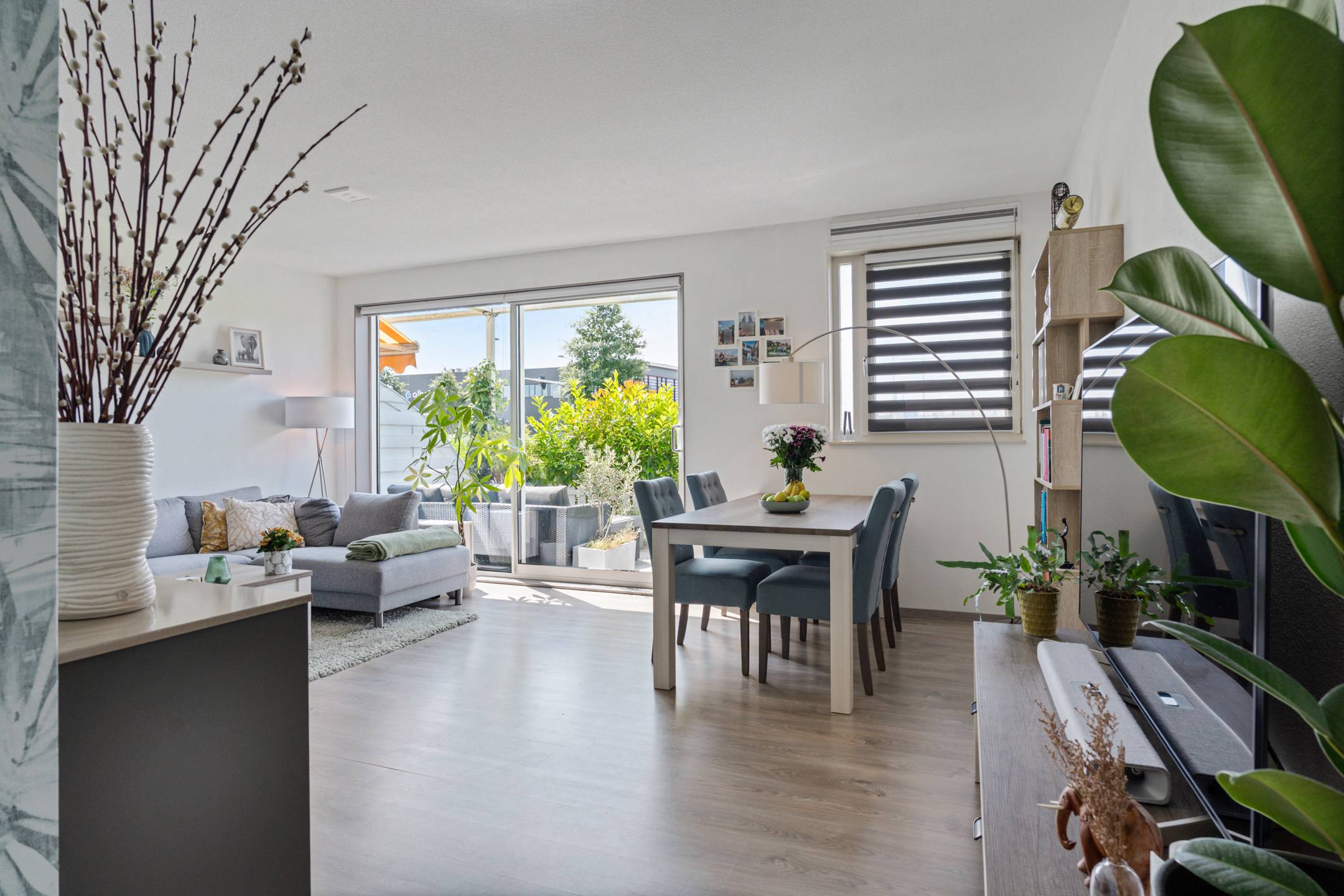 Via eigen entree kom je binnen in de hal met toegang tot alle vertrekken. De woonkamer is licht en strak afgewerkt met een fraaie laminaatvloer. Een schuifpui geeft toegang tot het volledig betegelde terras, perfect gelegen op het zuiden – ideaal om van de zon te genieten.