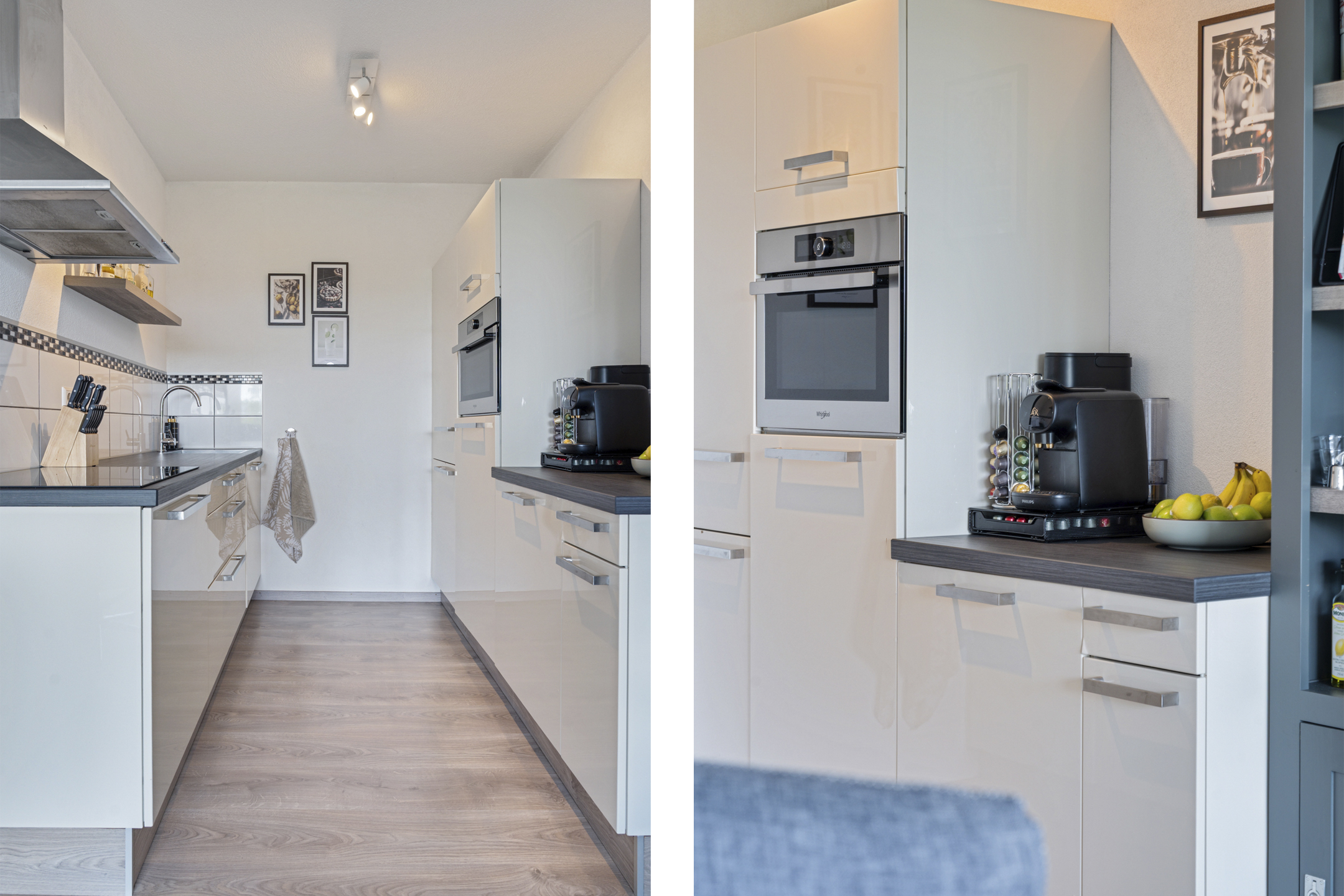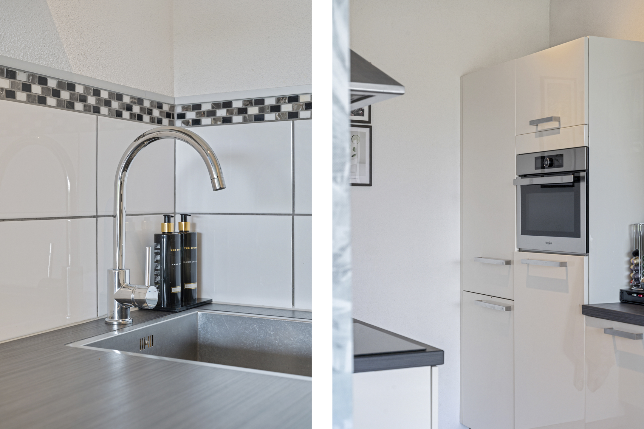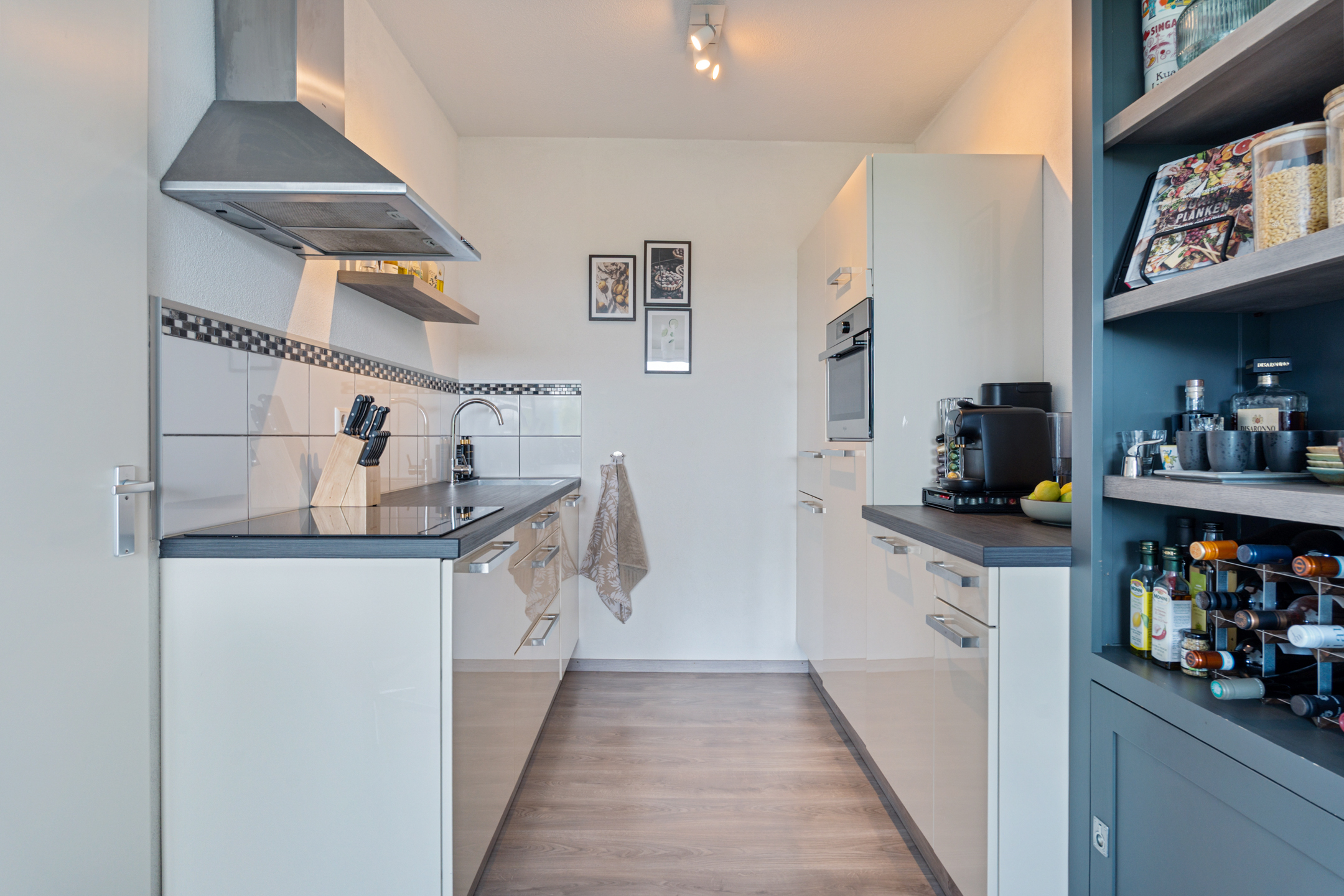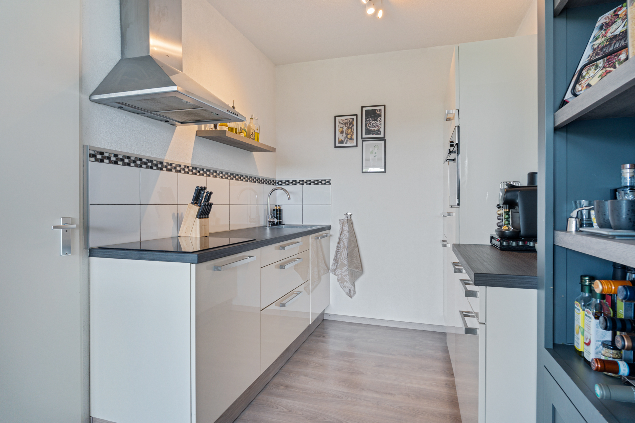 De open keuken in witte hoogglans is modern en voorzien van diverse inbouwapparatuur. In de bergkast vind je de cv-ketel en mechanische ventilatie.
