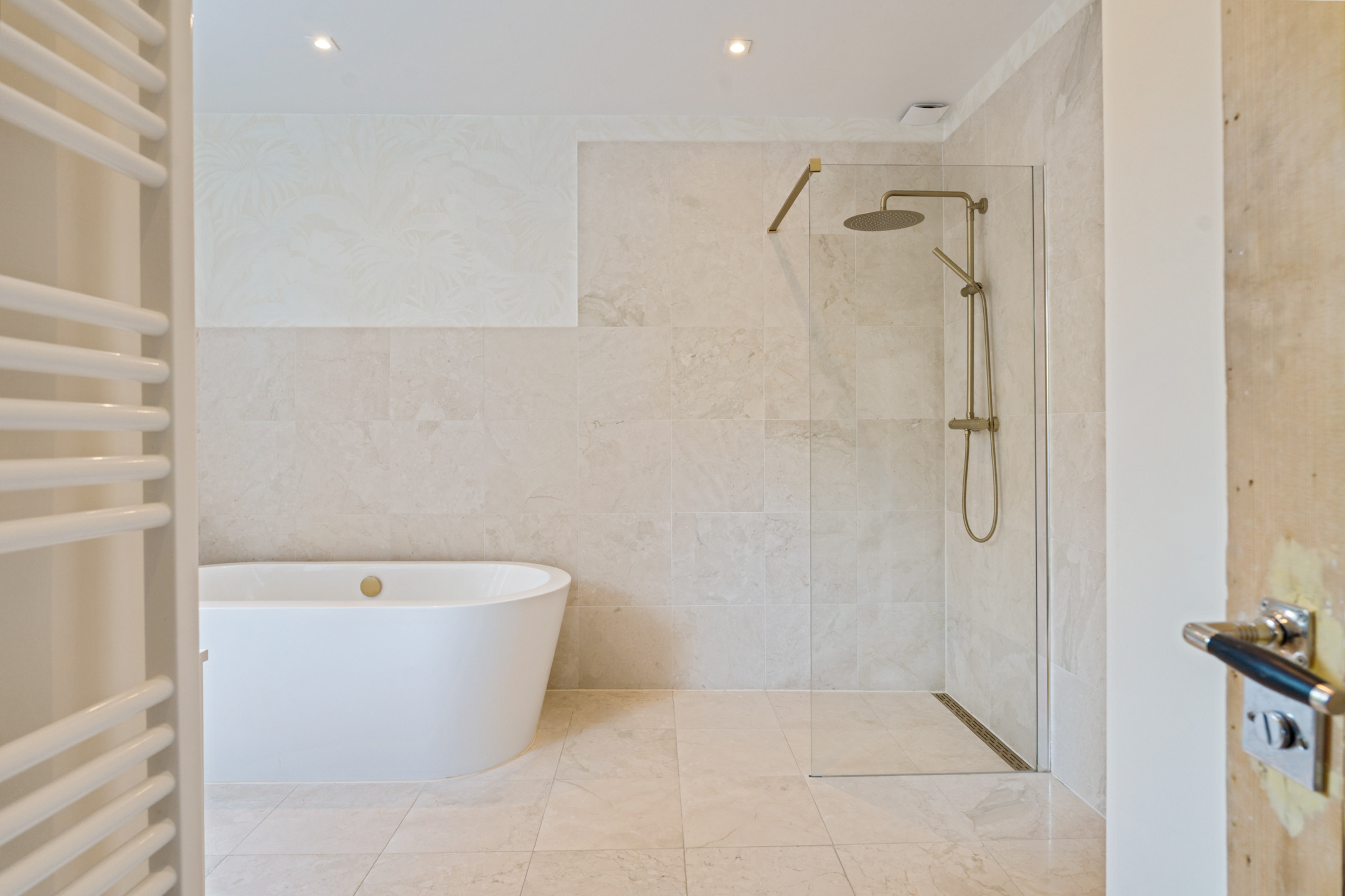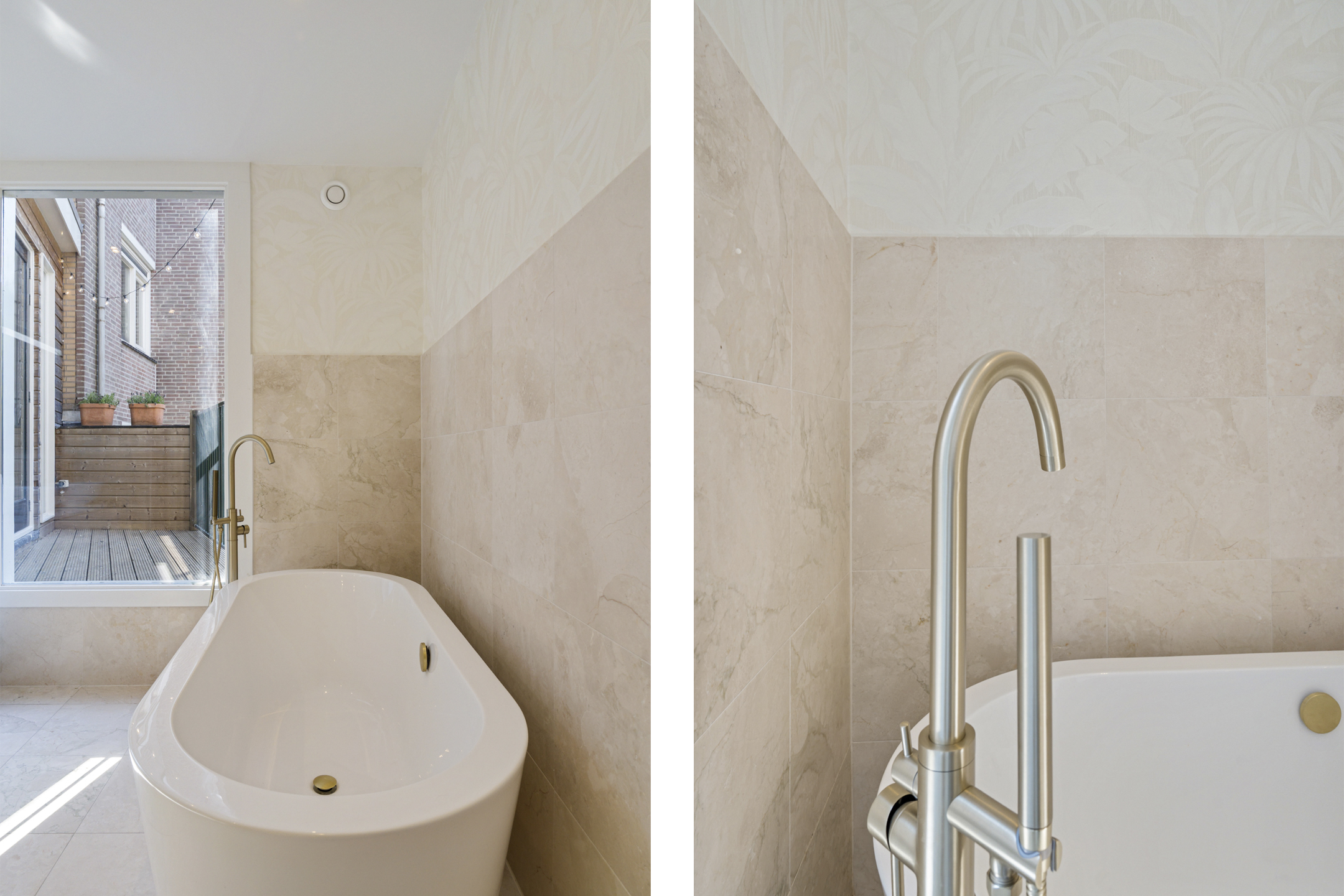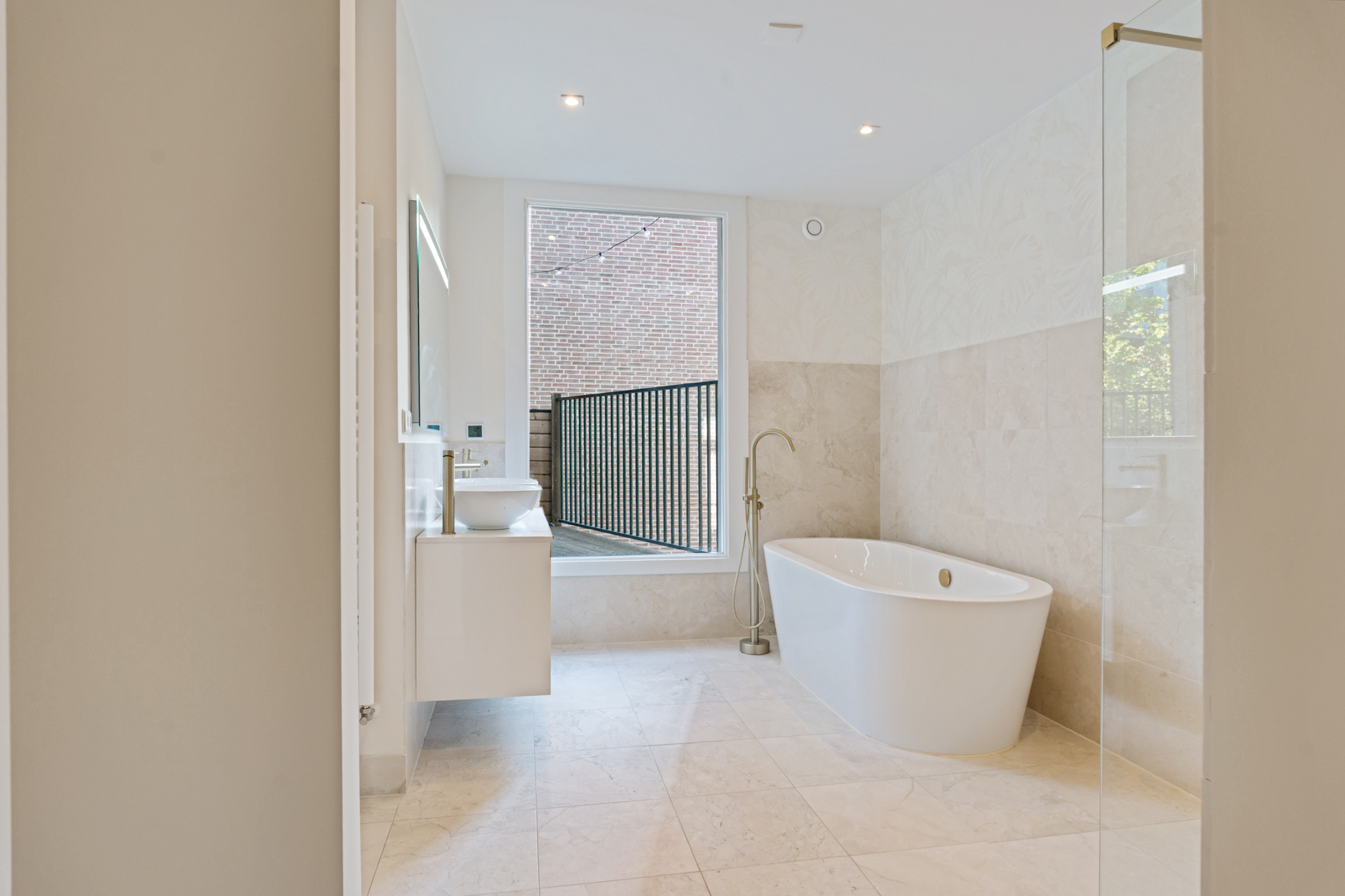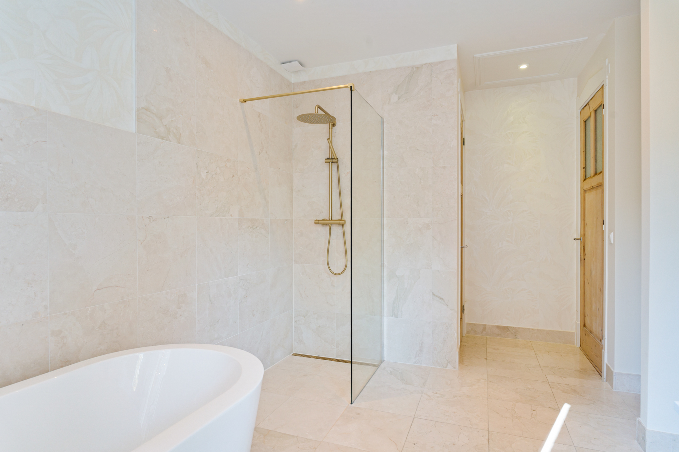 De ruime badkamer is modern afgewerkt met natuurstenen tegels en uitgerust met een ligbad, inloopdouche en vloerverwarming. Het separate toilet, eveneens betegeld met natuursteen, is voorzien van een fonteintje en mechanische ventilatie.