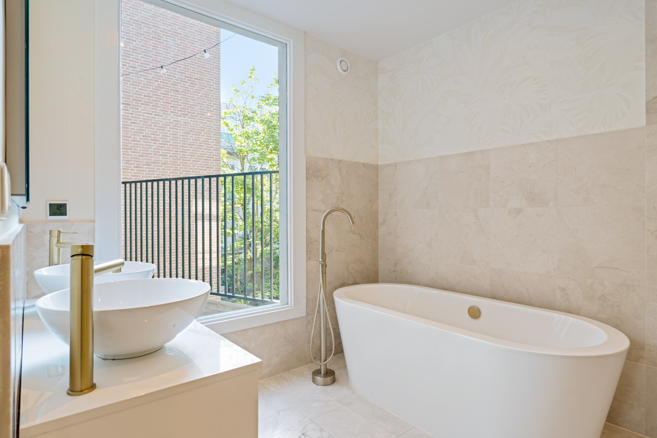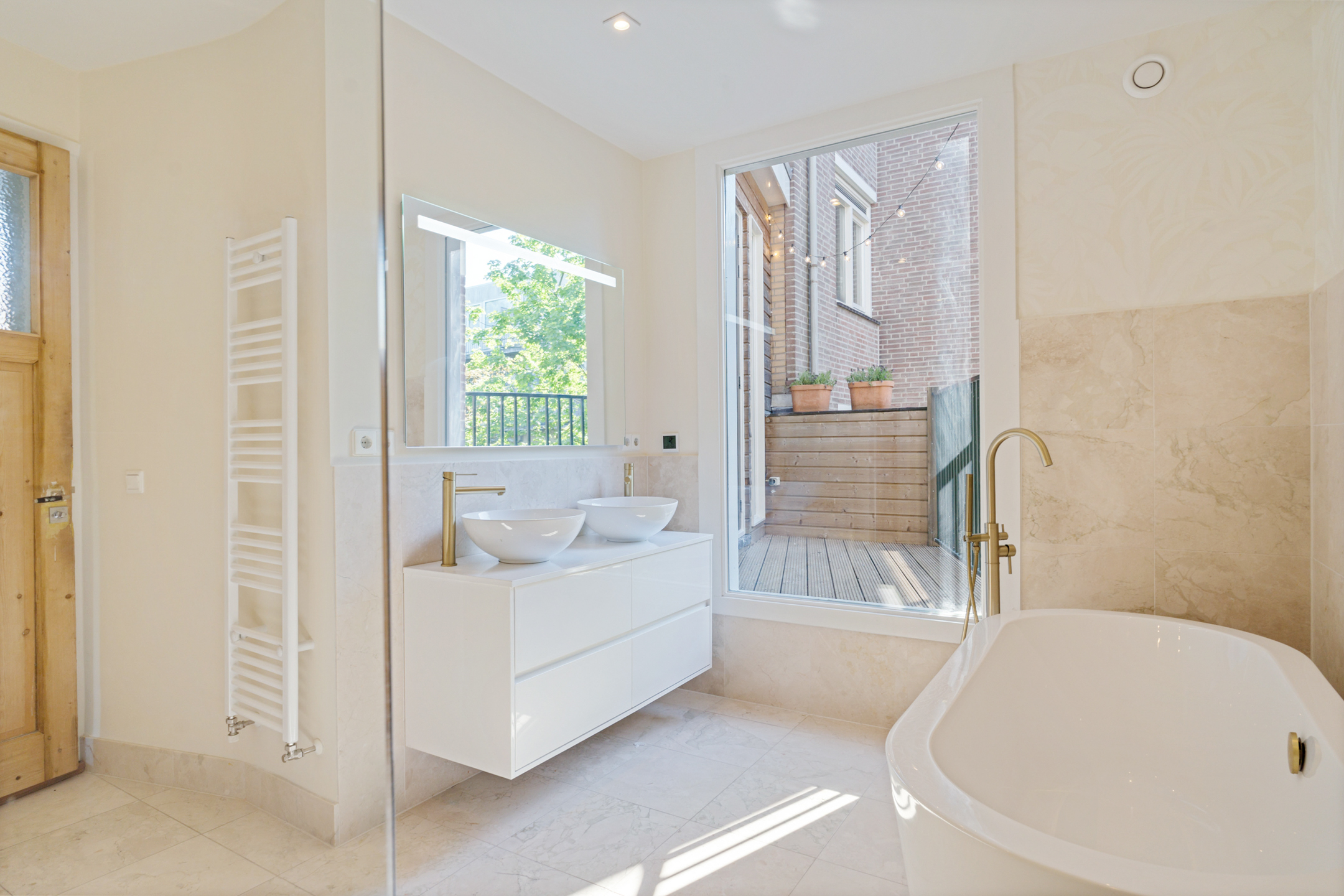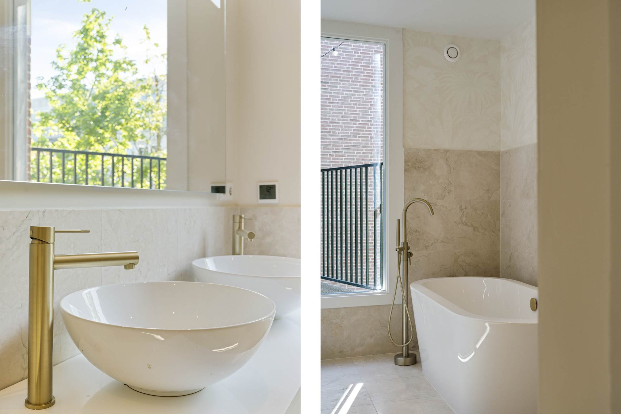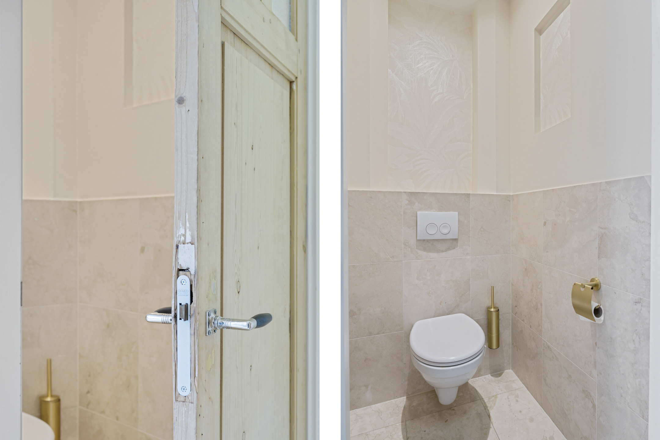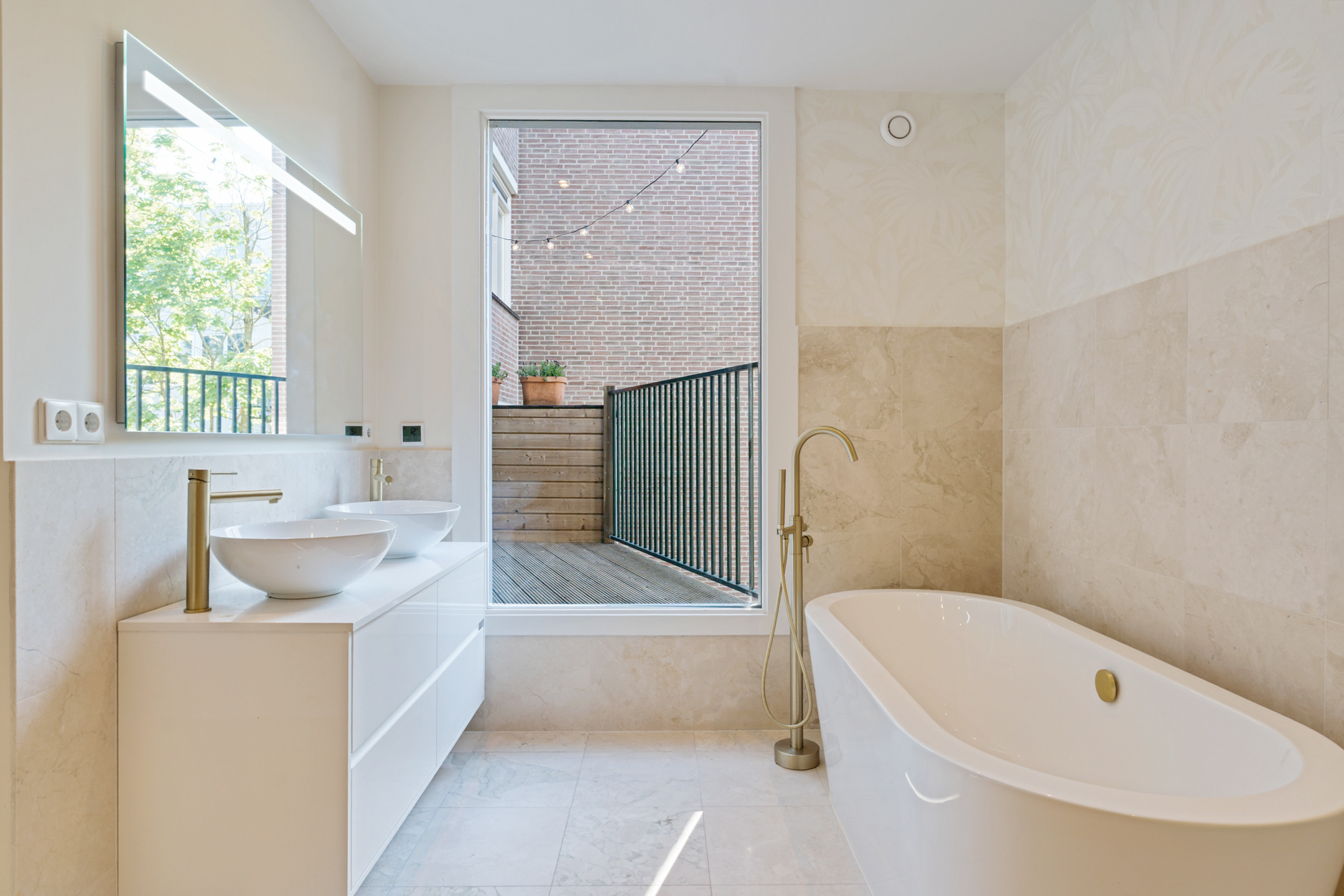 De ruime badkamer is modern afgewerkt met natuurstenen tegels en uitgerust met een ligbad, inloopdouche en vloerverwarming. Het separate toilet, eveneens betegeld met natuursteen, is voorzien van een fonteintje en mechanische ventilatie.