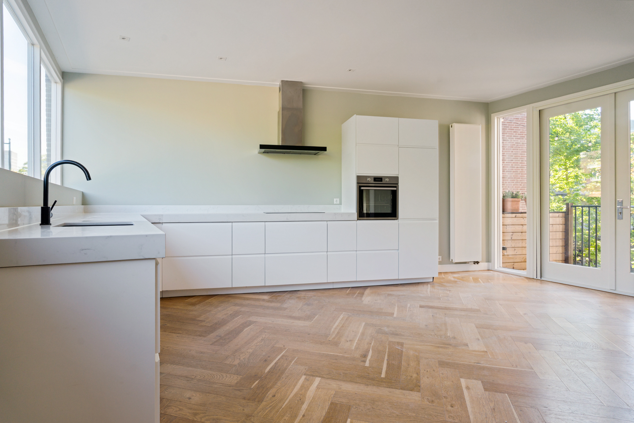 Via de entree stap je binnen in de riante woonkamer, waar direct de prachtige visgraatvloer opvalt. Aan de achterzijde bevindt zich de ruime en moderne woonkeuken, voorzien van een stijlvol werkblad, spoelbak, vaatwasser, koel-/vriescombinatie en combi-oven.