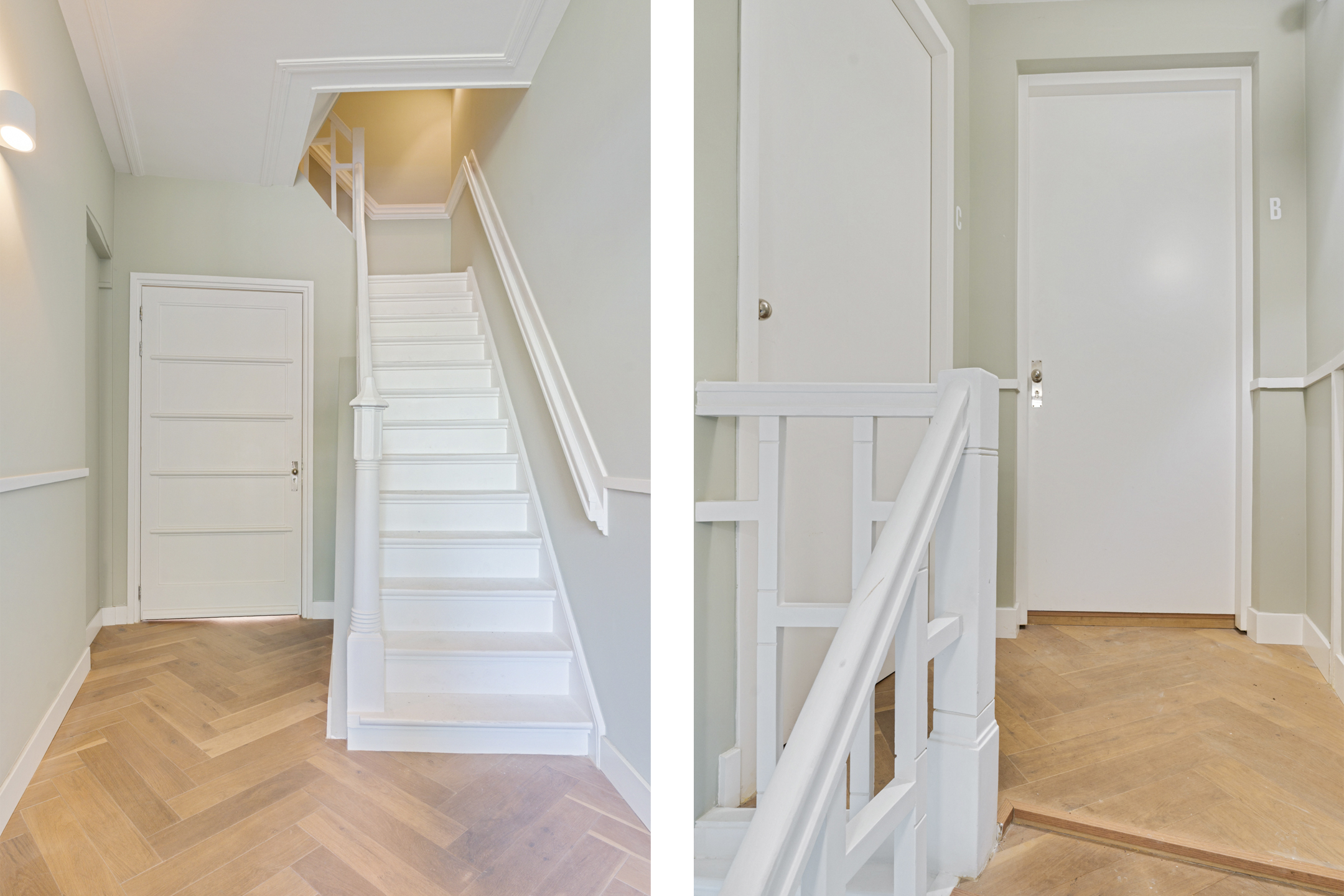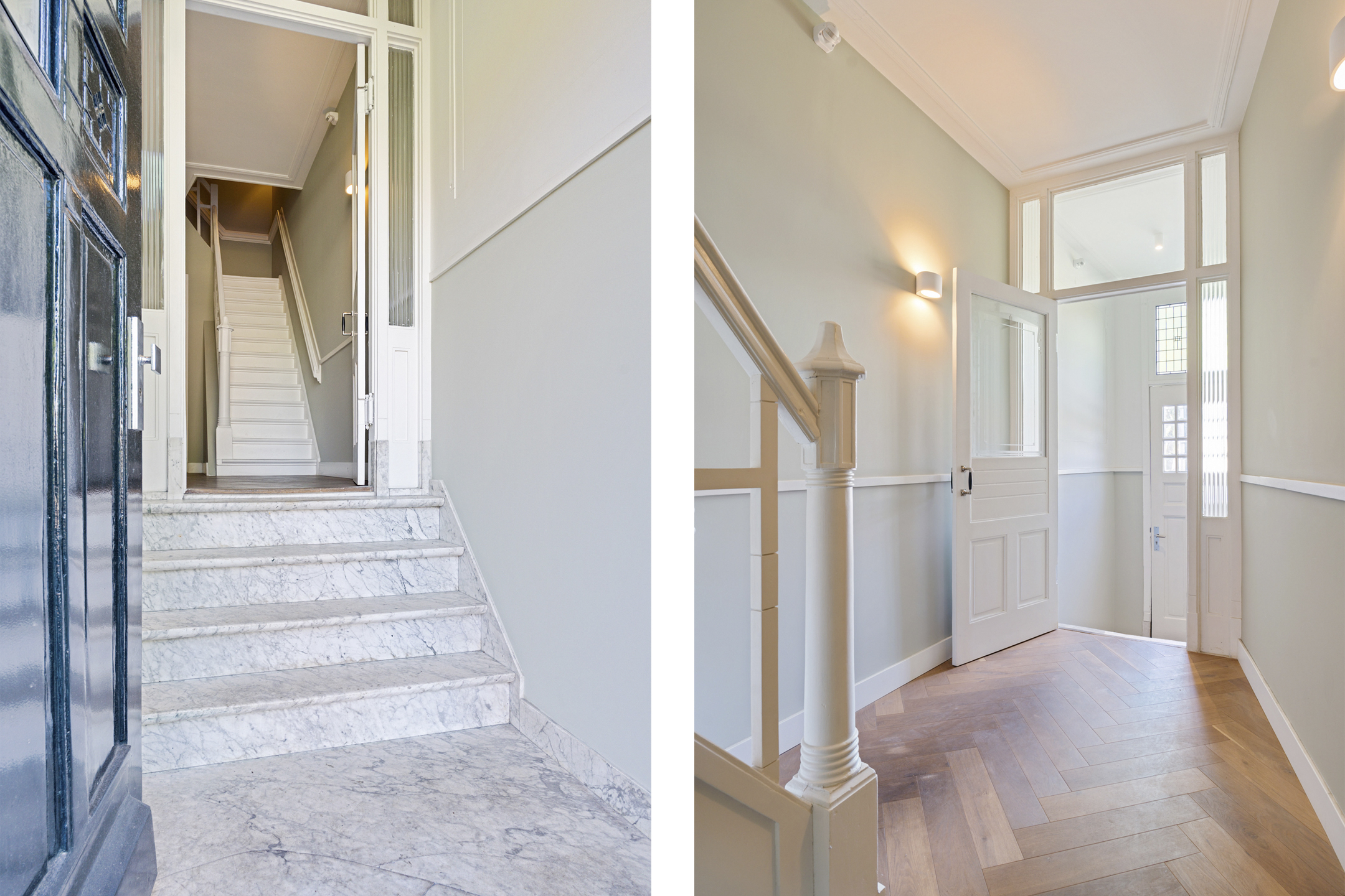 Gezamenlijke entree met een video-intercomsysteem. Bij binnenkomst heb je direct toegang tot je eigen trapopgang naar het appartement.