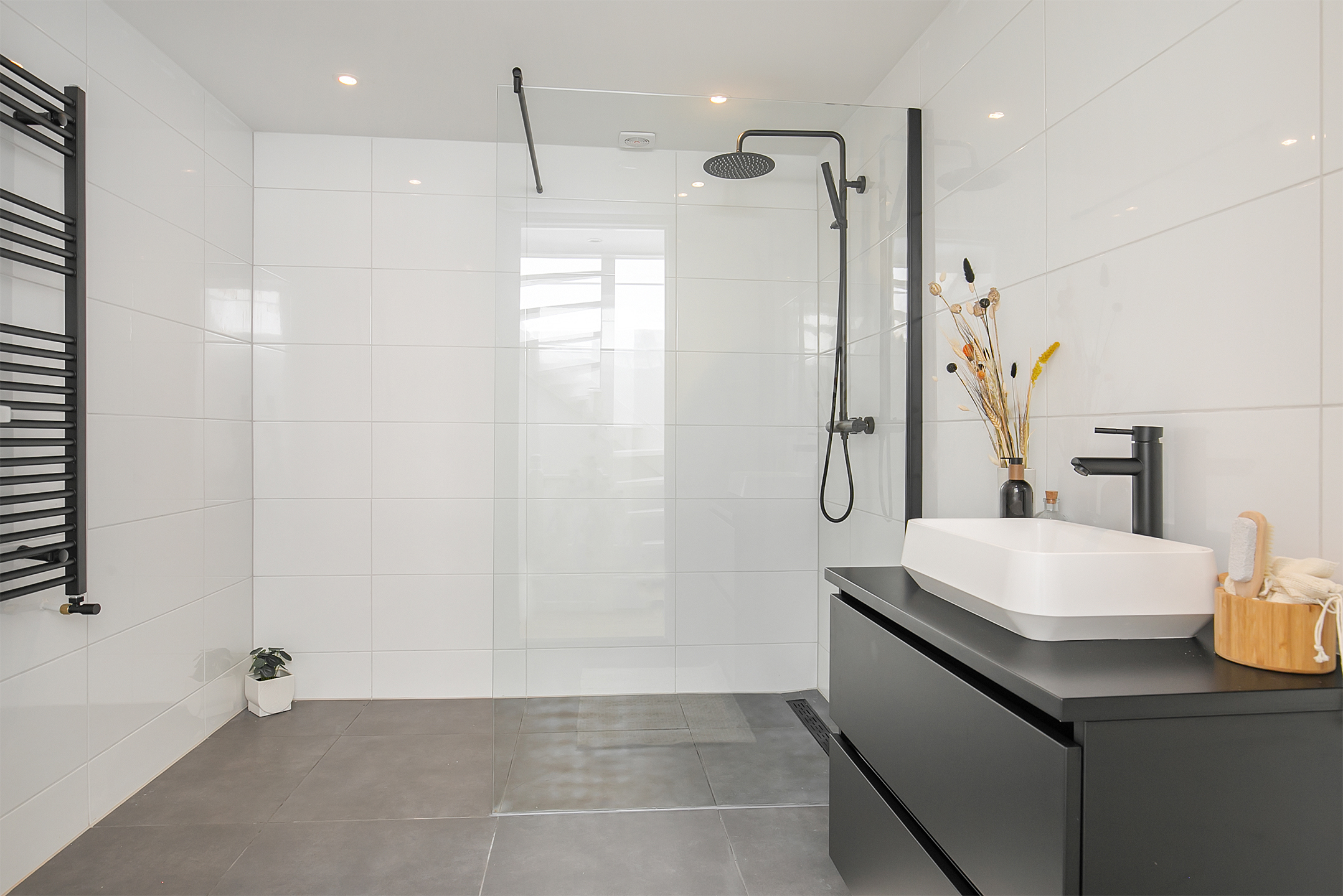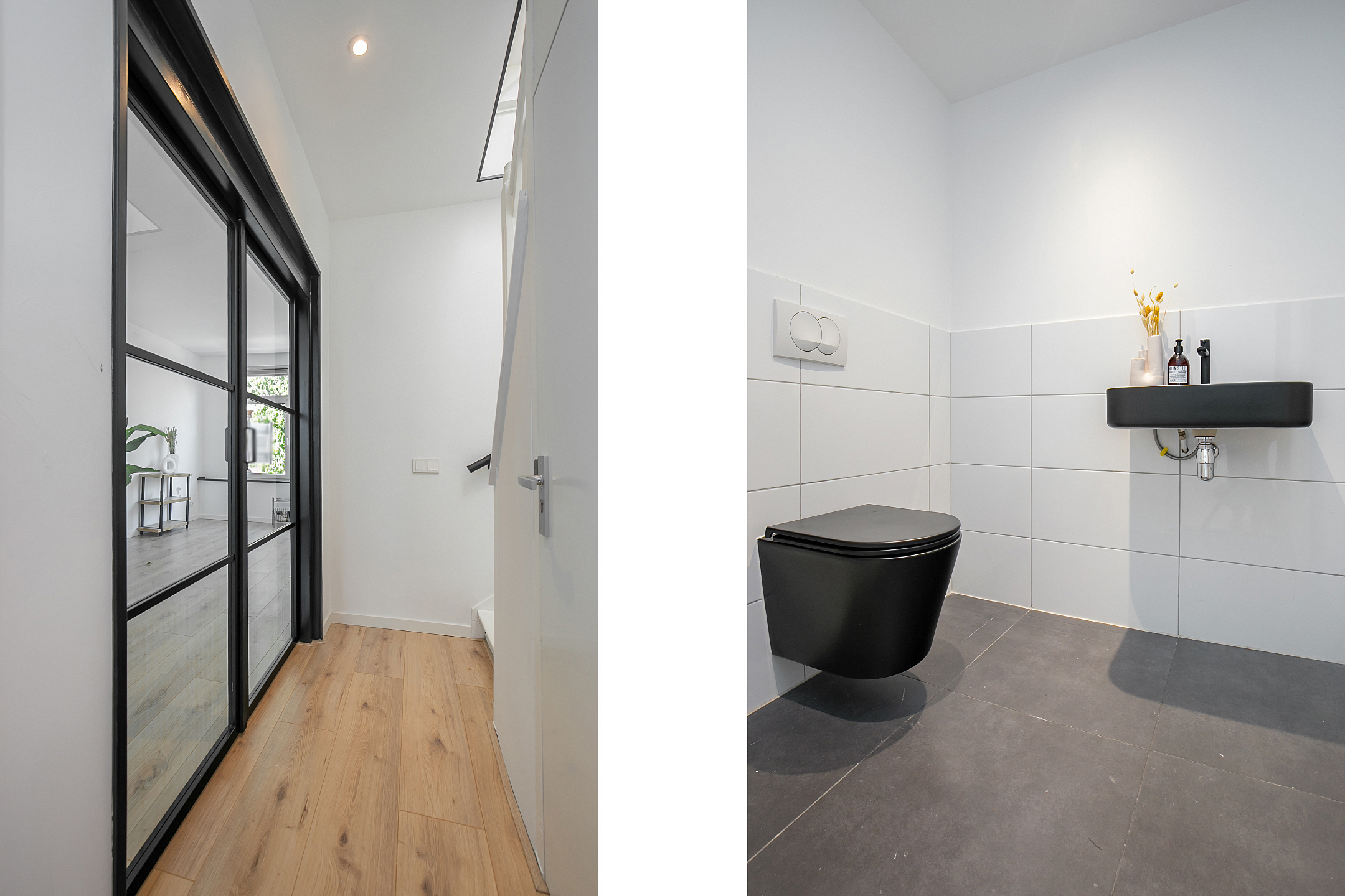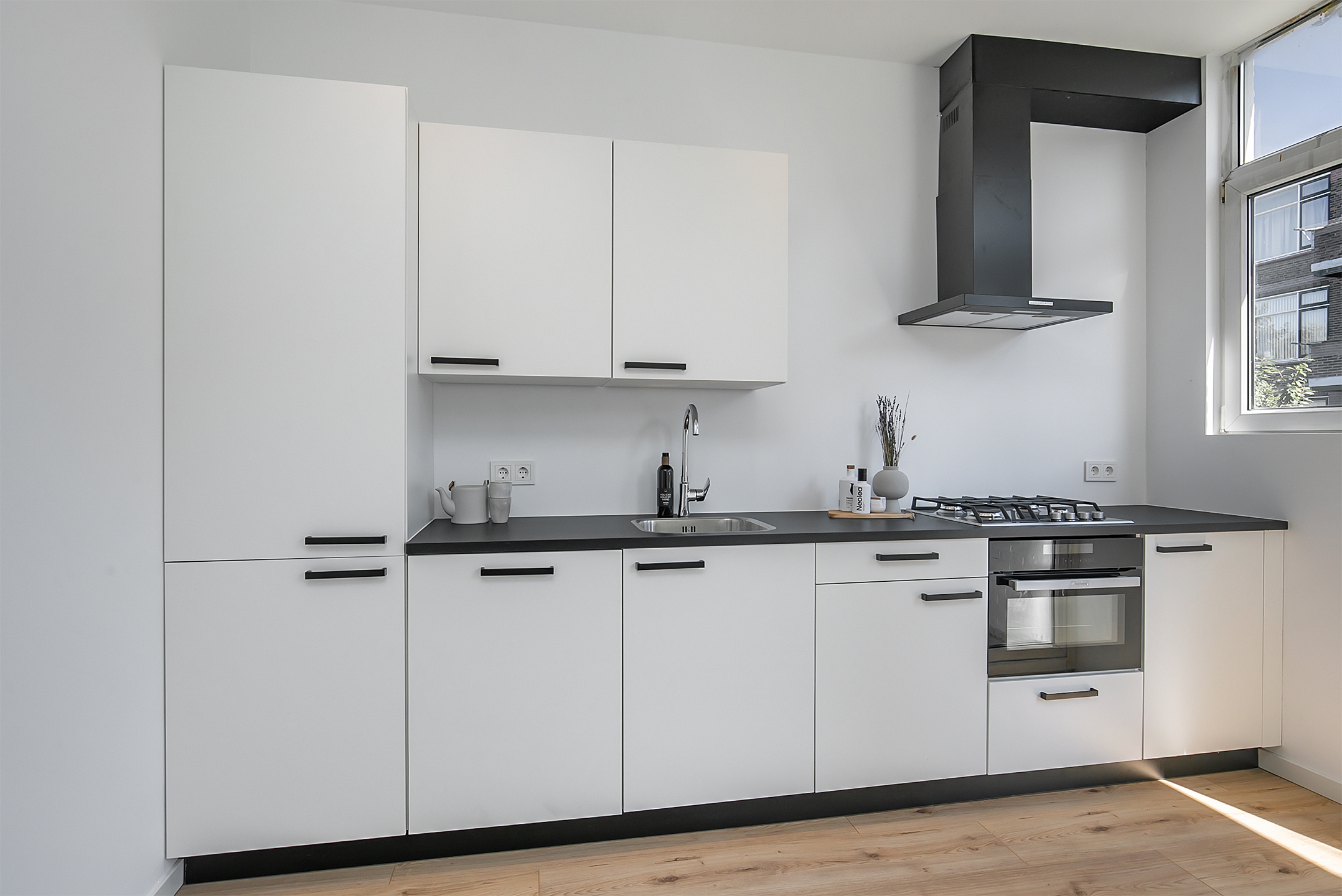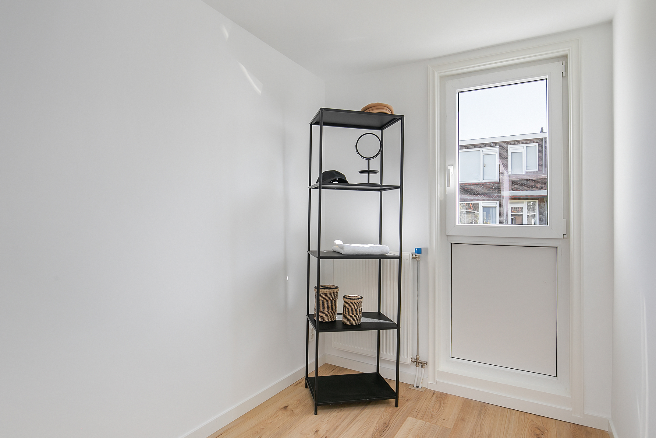 Je komt binnen in de hal die door een dakraam wordt overgoten met lichtinval. Heerlijk thuiskomen dus! Middels de stalen openslaande deuren is vervolgens de ruime leefruimte te betreden. Hier bevinden zich de woonkamer, open keuken en balkon. De woonkamer is gelegen aan de voorzijde en staat in open verbinding met de (nieuwe) keuken die voorzien is van alle benodigde inbouwapparatuur. Aan de achterzijde waar de keuken is, bevindt zich ook het balkon dat middels een schuifpui toegankelijk is. Ook gelegen op deze verdieping is een separaat toilet. Alles hier ademt luxe, maar dat is voor de bovenverdieping gelukkig niet anders!