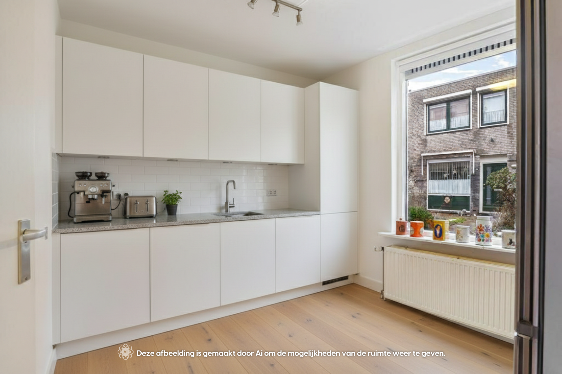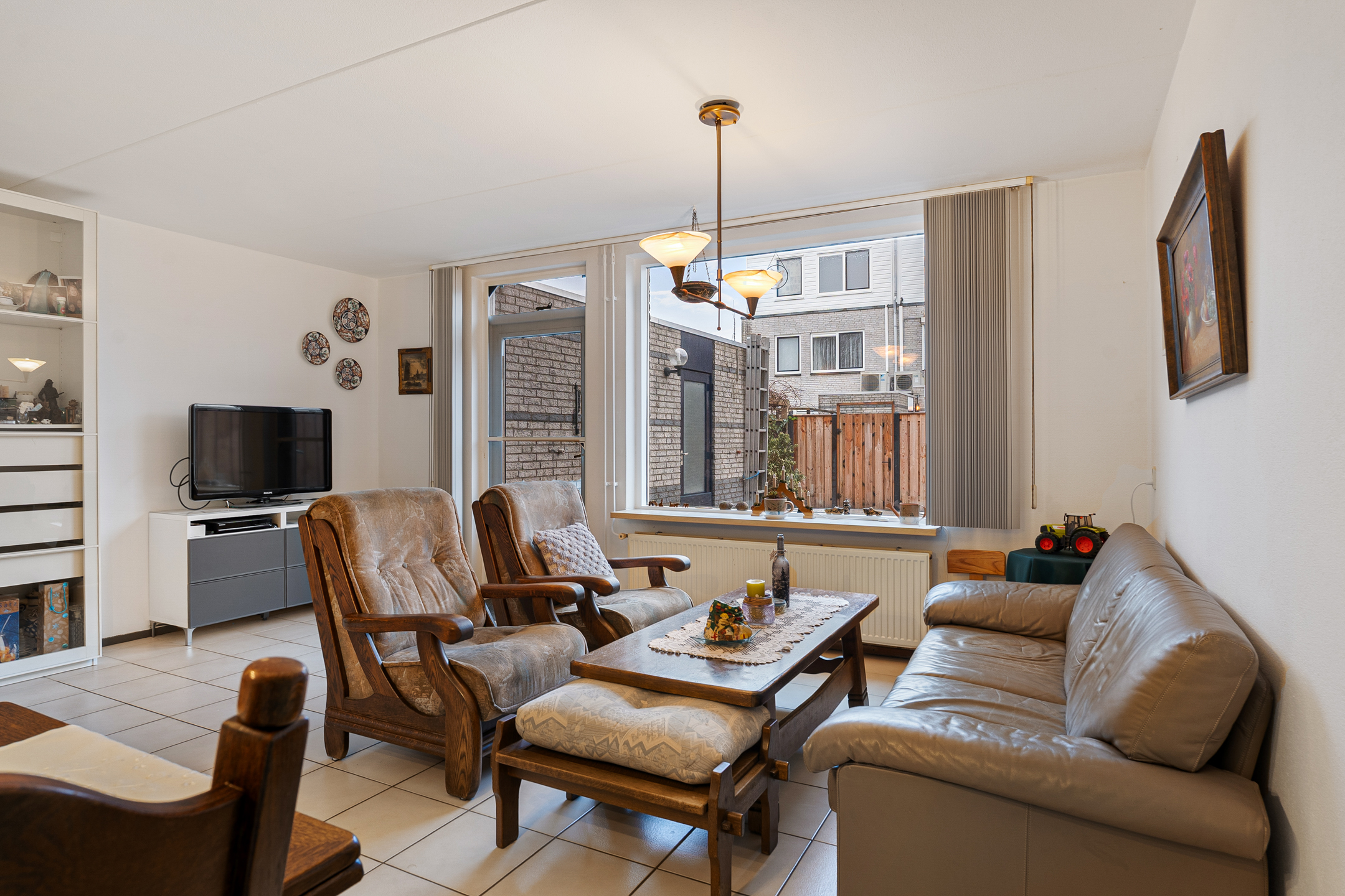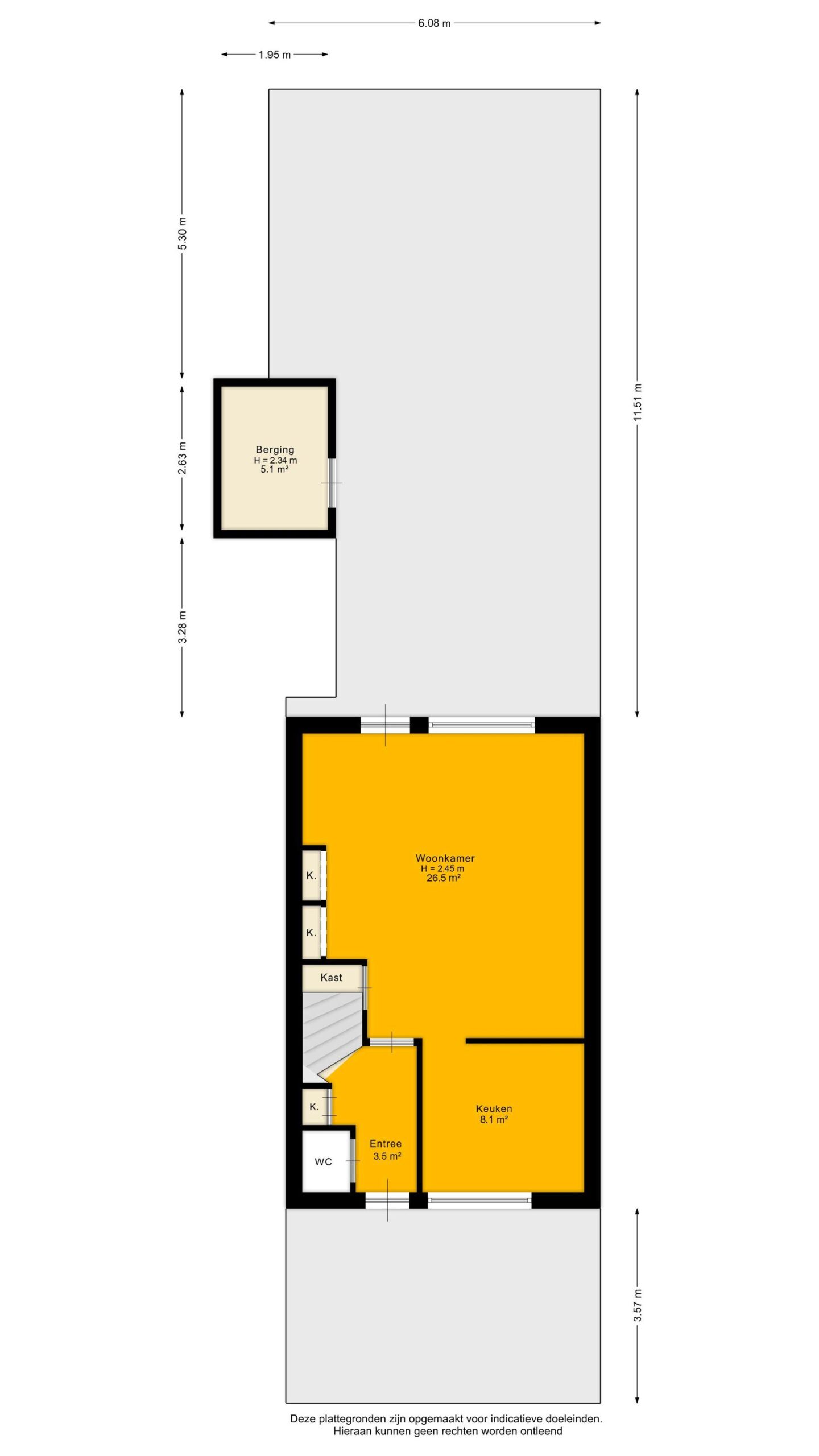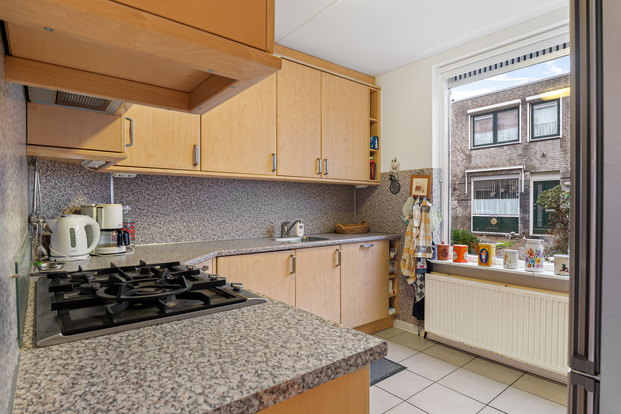 Je komt binnen via de hal met meterkast, toilet en trapkast. Aan de voorzijde bevindt zich de gesloten keuken, praktisch ingedeeld en met uitzicht op de straat. De woonkamer is ruim opgezet en meet circa 26,5 m². Dankzij de grote raampartij aan de achterzijde is dit een lichte en prettige leefruimte met direct zicht op de tuin.