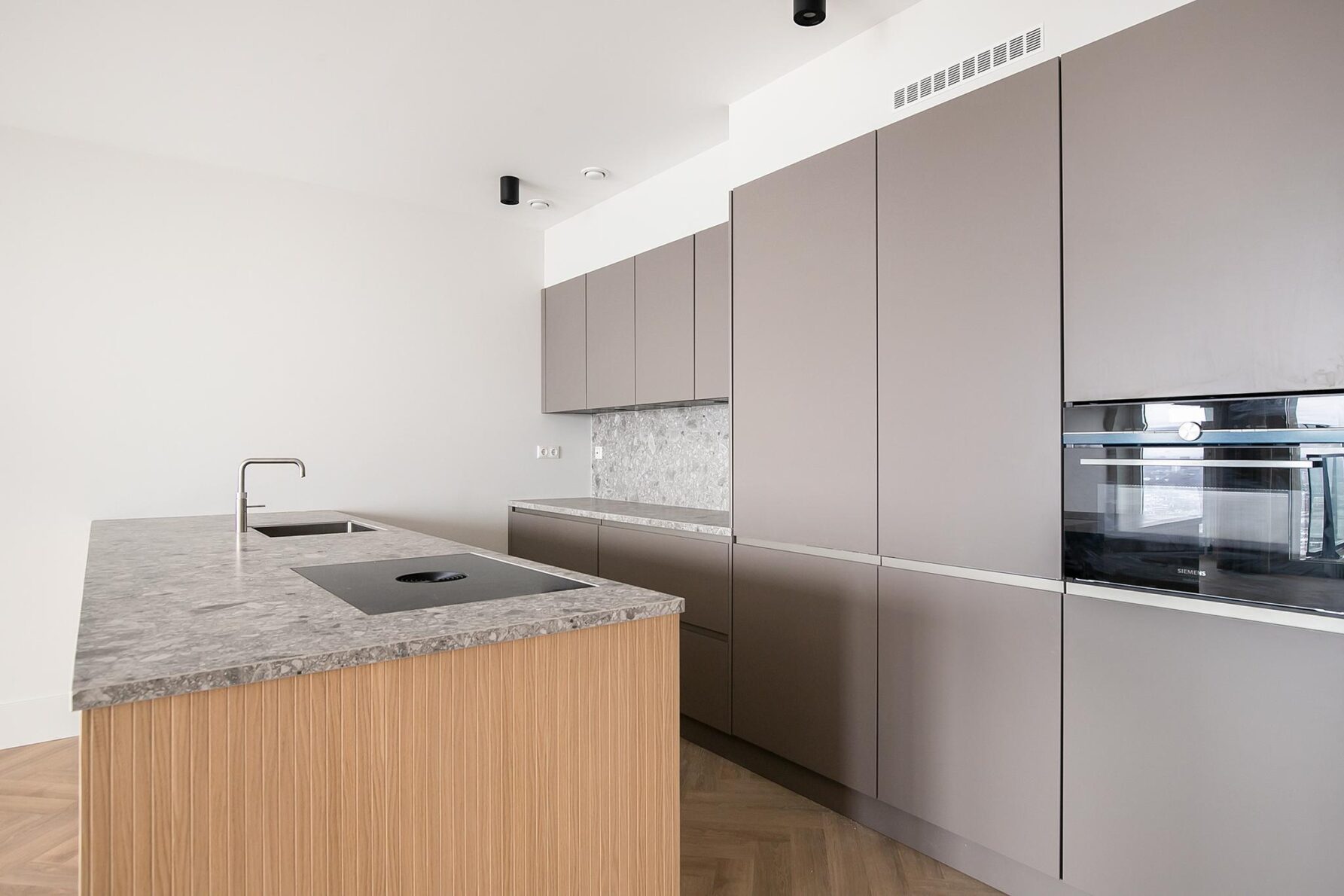 Het appartement voelt direct bij binnenkomst comfortabel en privé. De hal heeft een maatwerk eiken garderobe-unit met bergruimte en een spiegel. De visgraat eiken vloer (PVC) loopt door in de 2 slaapkamers en de woonkamer en door het gehele appartement is vaste opbouwverlichting aangebracht. De 2 slaapkamers zijn licht en hebben beide uitzicht door de lange ramen richting het noordoosten. Twee openslaande deuren met glas leiden naar de woonkamer, waar het luxe behang direct sfeer geeft. De living is licht en net zoals het aangrenzende terras geheel gericht op het fenomenale uitzicht op alle bruggen; de Erasmusbrug, Willemsbrug en de Hef. De open keuken heeft een keukeneiland met een gezellige eetbar. De keuken is uitgerust met een 4-pits inductieplaat met geïntegreerde afzuiging (Bora), een Quooker, koelkast met vrieslades, een combimagnetronoven van Siemens Studioline en een vaatwasmachine. De handige inpandige berging/bijkeuken herbergt de wtw-installatie, biedt ruimte voor de was- en droogapparatuur en alle spullen en voorraad die je hier nog meer kwijt wilt. Er is een modern, separaat toilet op de hal. De badkamer is warm, ruim en sfeervol. De afwerking is luxe en door de handige indeling oogt deze ruimtelijk. Rechts een ligbad, in het midden een dubbele badkamermeubel met ronde spiegel met verlichting en links een verwarmd handdoekenrek en een rookglazen deur naar de inloop-douchecabine.