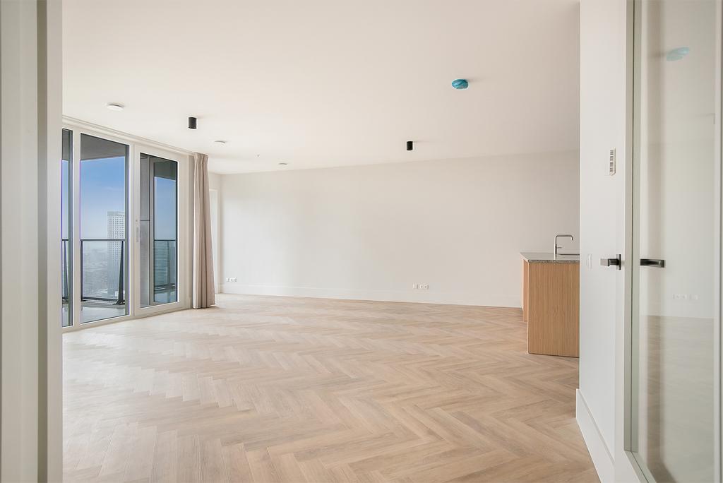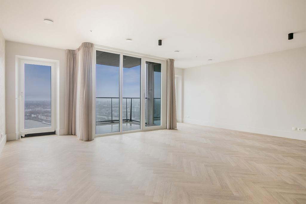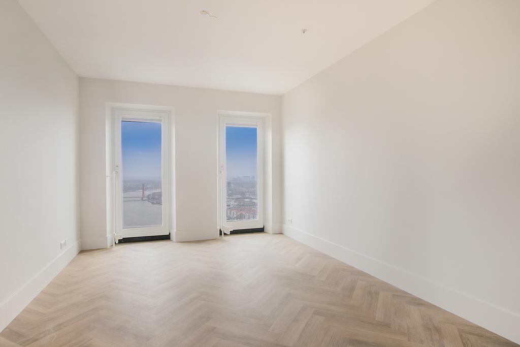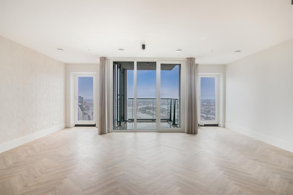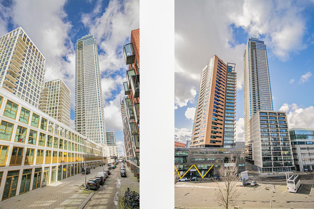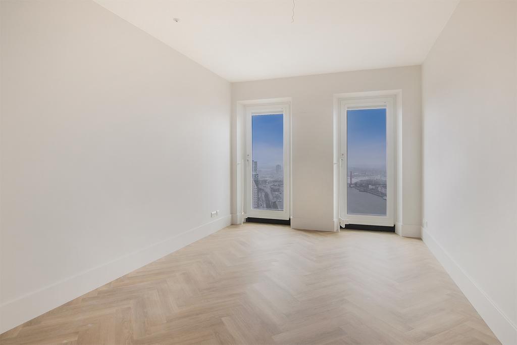 Het appartement ligt op de 32e verdieping en heeft uitzicht op Maas met de Erasmusbrug. Het heeft 2 slaapkamers, een luxe badkamer, een woonkamer met keuken en een terras en natuurlijk uitzicht op de Maas en Rotterdam richting Centrum, Noordereiland, Zuid, Kralingen en nog verder.