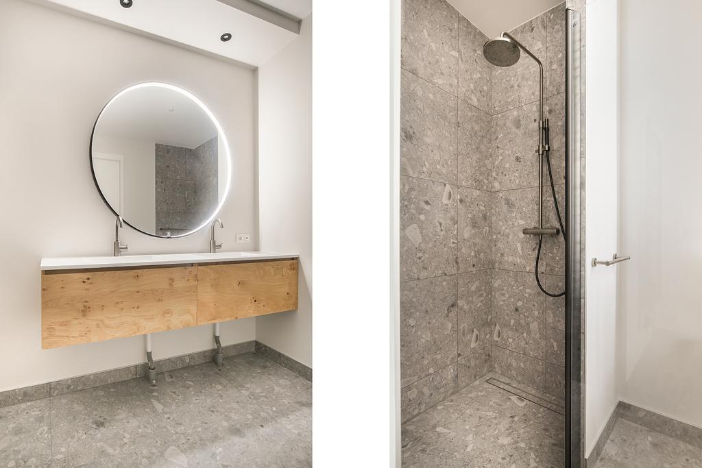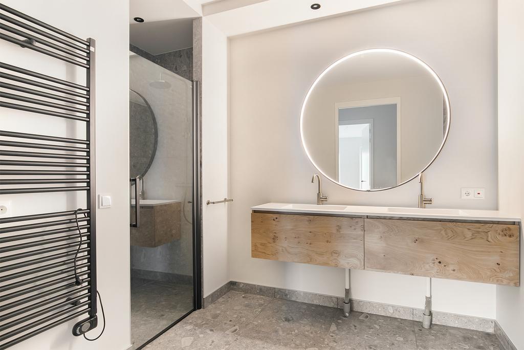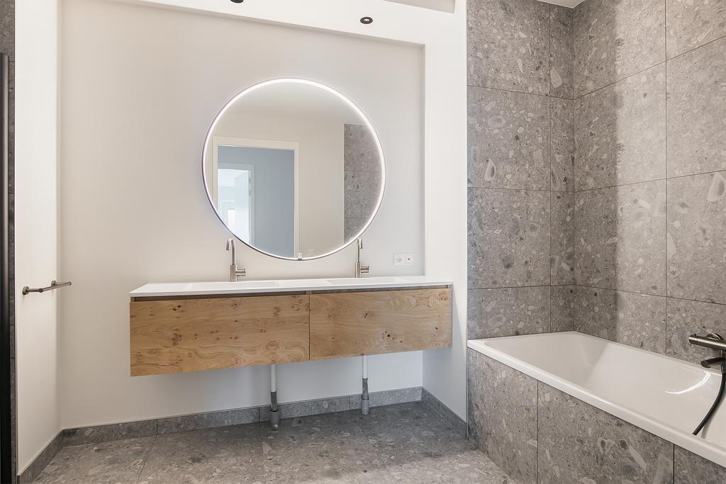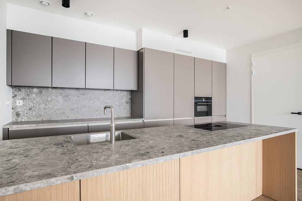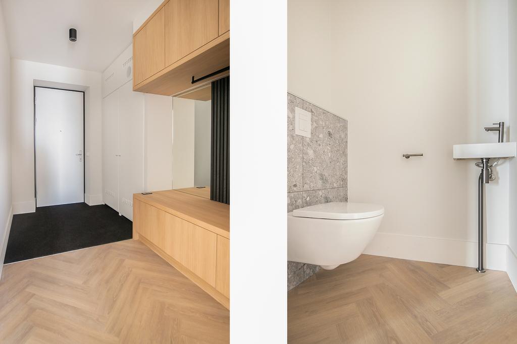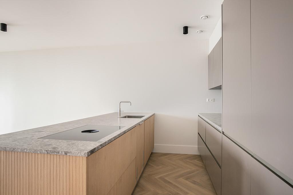 Dit appartement voelt direct bij binnenkomst comfortabel en privé. De hal heeft een maatwerk eiken garderobe-unit met bergruimte en een spiegel. De visgraat eiken vloer (PVC) loopt door in de 2 slaapkamers en de woonkamer en door het gehele appartement is vaste opbouwverlichting aangebracht. De 2 slaapkamers zijn licht en hebben beide uitzicht door de lange ramen richting het noordoosten. Twee openslaande deuren met glas leiden naar de woonkamer, waar het luxe behang direct sfeer geeft. De living is licht en net zoals het aangrenzende terras geheel gericht op het fenomenale uitzicht op alle bruggen; de Erasmusbrug, Willemsbrug en de Hef. De open keuken heeft een keukeneiland met een gezellige eetbar. De keuken is uitgerust met een 4-pits inductieplaat met geïntegreerde afzuiging (Bora), een Quooker, koelkast met vrieslades, een combimagnetronoven van Siemens Studioline en een vaatwasmachine. De handige inpandige berging/bijkeuken herbergt de wtw-installatie, biedt ruimte voor de was- en droogapparatuur en alle spullen en voorraad die je hier nog meer kwijt wilt. Er is een modern, separaat toilet op de hal. De badkamer is warm, ruim en sfeervol. De afwerking is luxe en door de handige indeling oogt deze ruimtelijk. Rechts een ligbad, in het midden een dubbele badkamermeubel met ronde spiegel met verlichting en links een verwarmd handdoekenrek en een rookglazen deur naar de inloop-douchecabine.