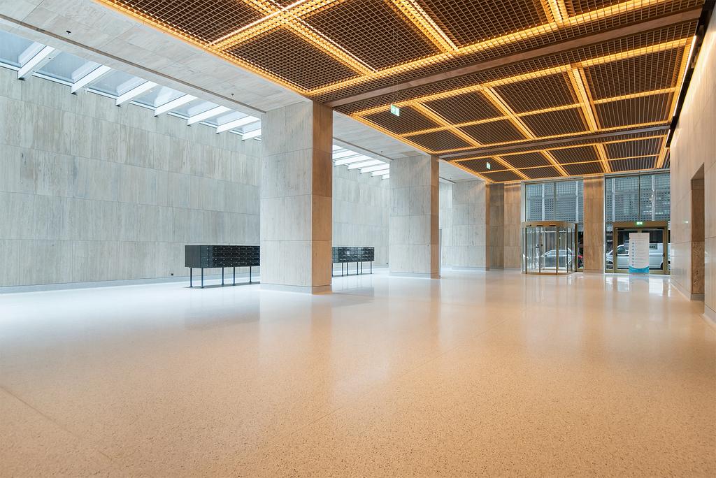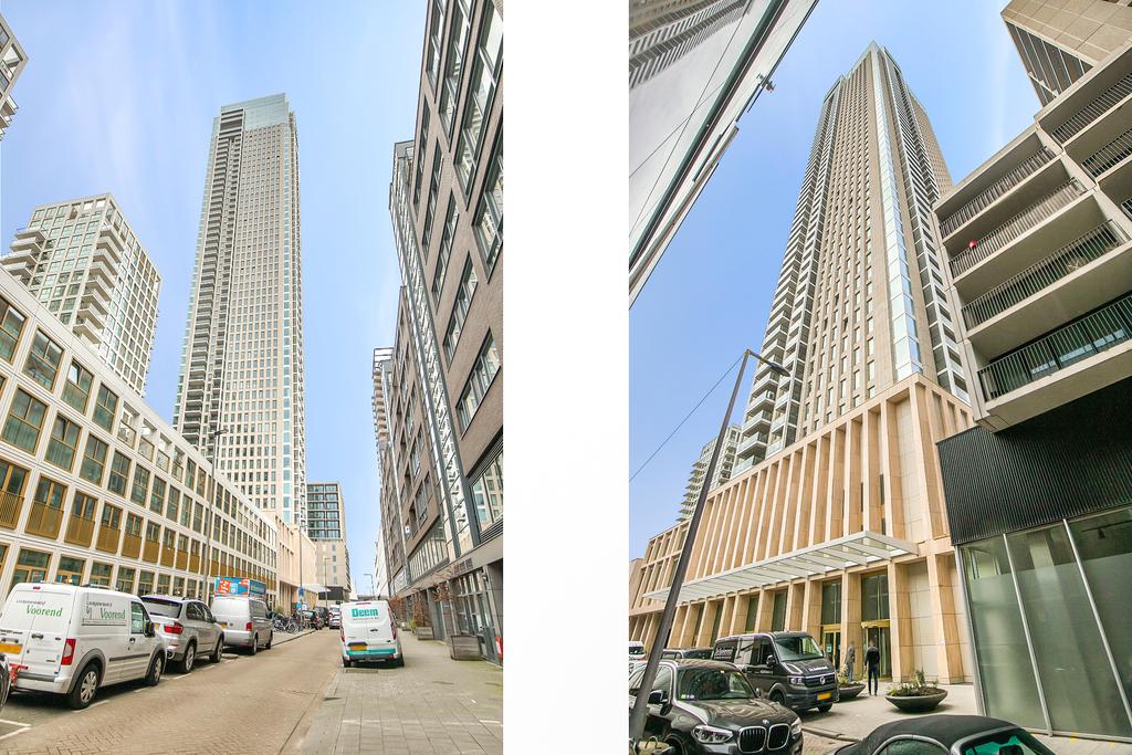 Vlak naast de Erasmusbrug vind je 2 ingangen om dit prachtige, gloednieuwe gebouw binnen te gaan. Dat kun je overigens alleen als bewoner of als je een afspraak hebt, want de toegang wordt beheerd door de receptie en dat is wel zo prettig. De hal is enorm met travertin vloeren en wanden, een lichtatrium, een ontvangstbalie, bring-me boxen en brievenbussen. Er gaan meerdere liften naar de 57 verdiepingen, er is een 3-laagse parkeergarage in het gebouw zelf en er zijn een aantal lagen met ruime bergingen die bij de appartementen horen. Dit is echt ‘Manhattan aan de Maas’!