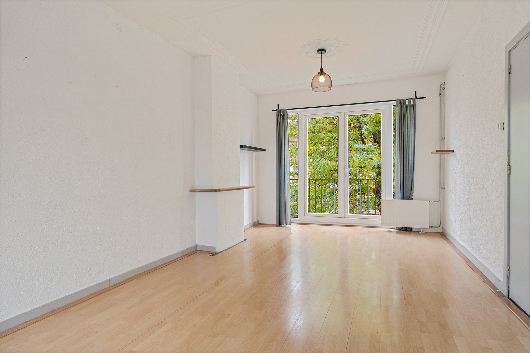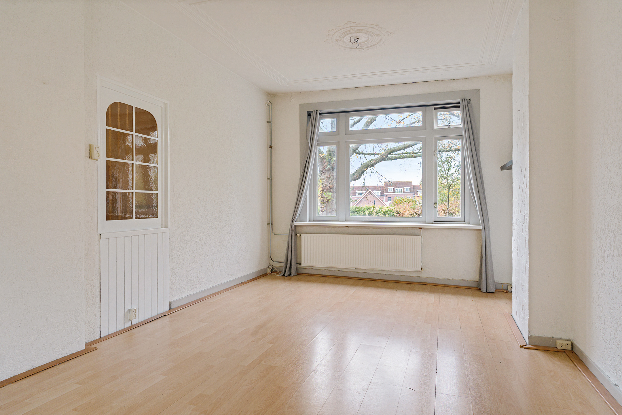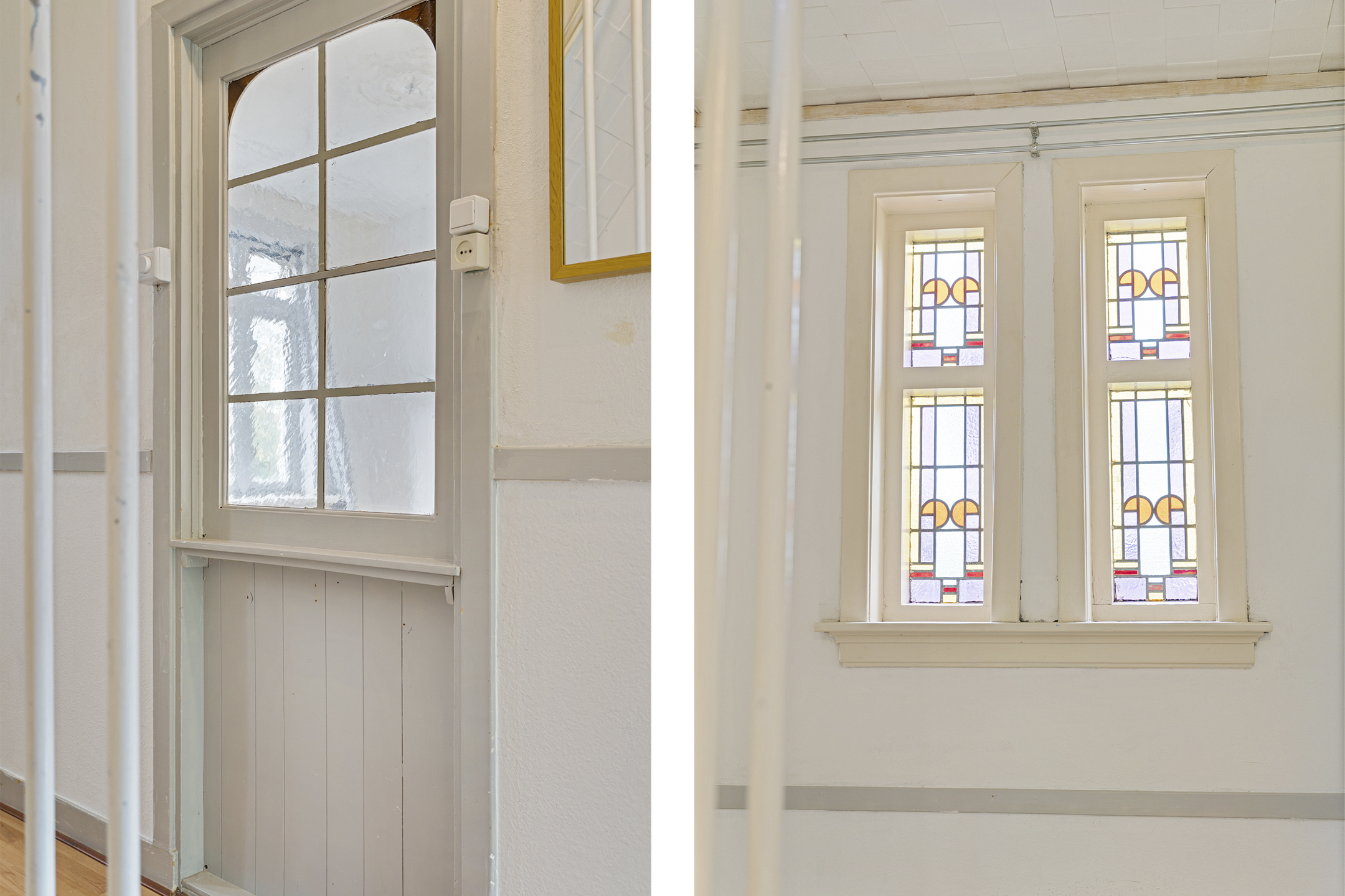 Ruime overloop met glas-in-loodramen, toegang tot de verschillende vertrekken en trap naar de zolderverdieping. Apart toilet. De doorzon woonkamer is heerlijk licht en beschikt over een klassiek ornamentenplafond en kunststof kozijnen met openslaande deuren naar het balkon aan de achterzijde. Dit balkon is netjes afgewerkt en ligt op het oosten.