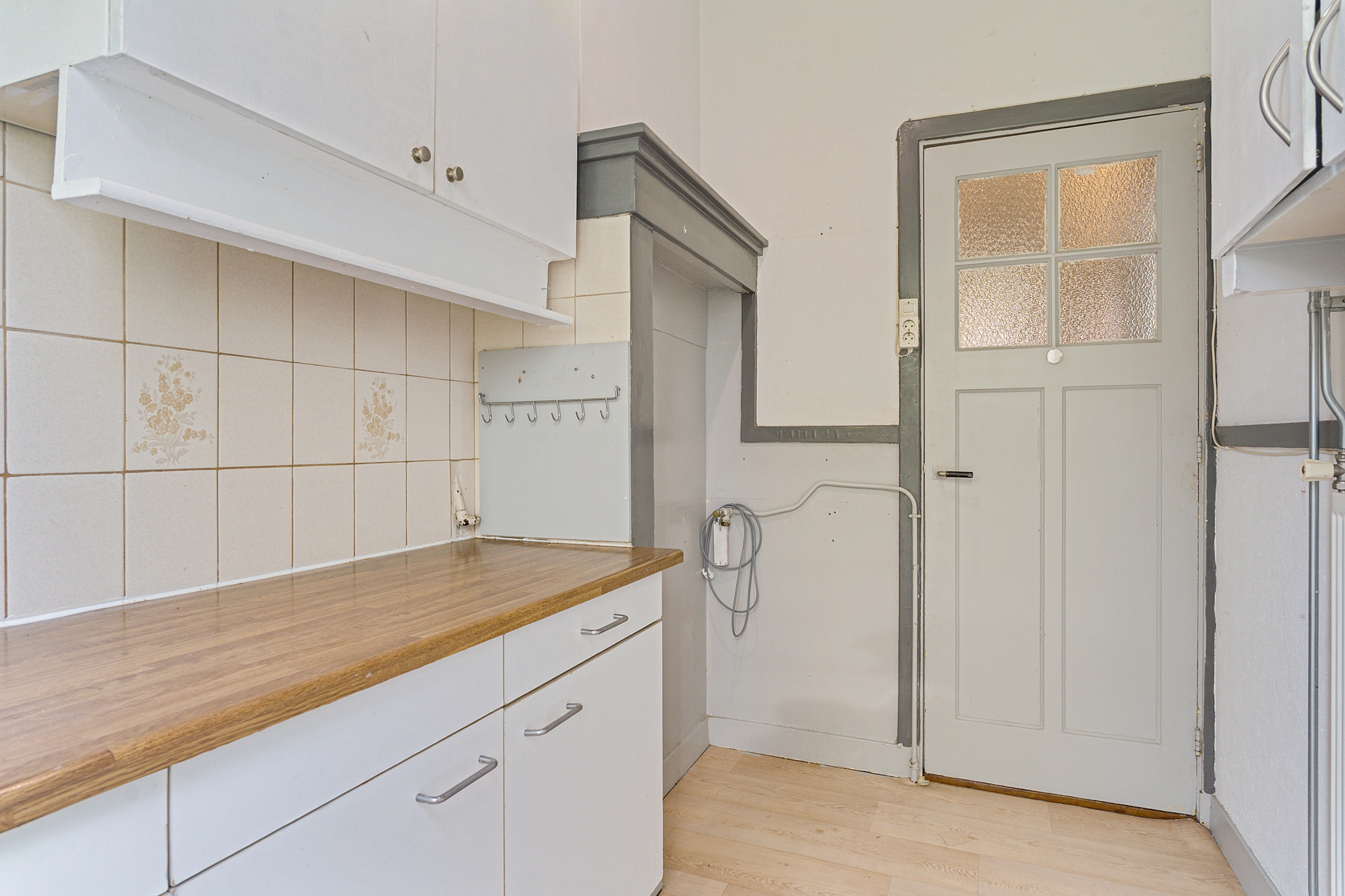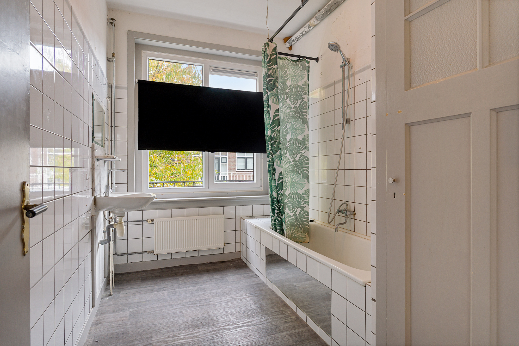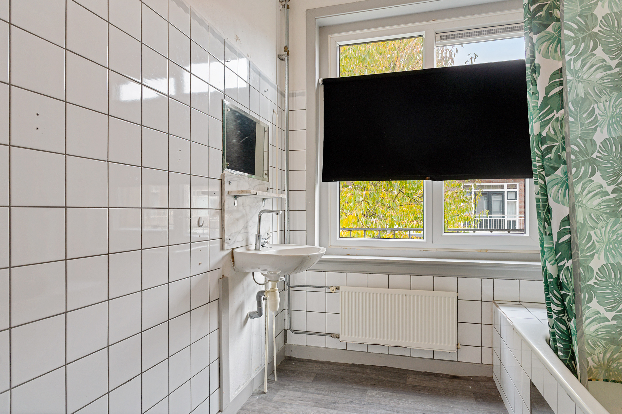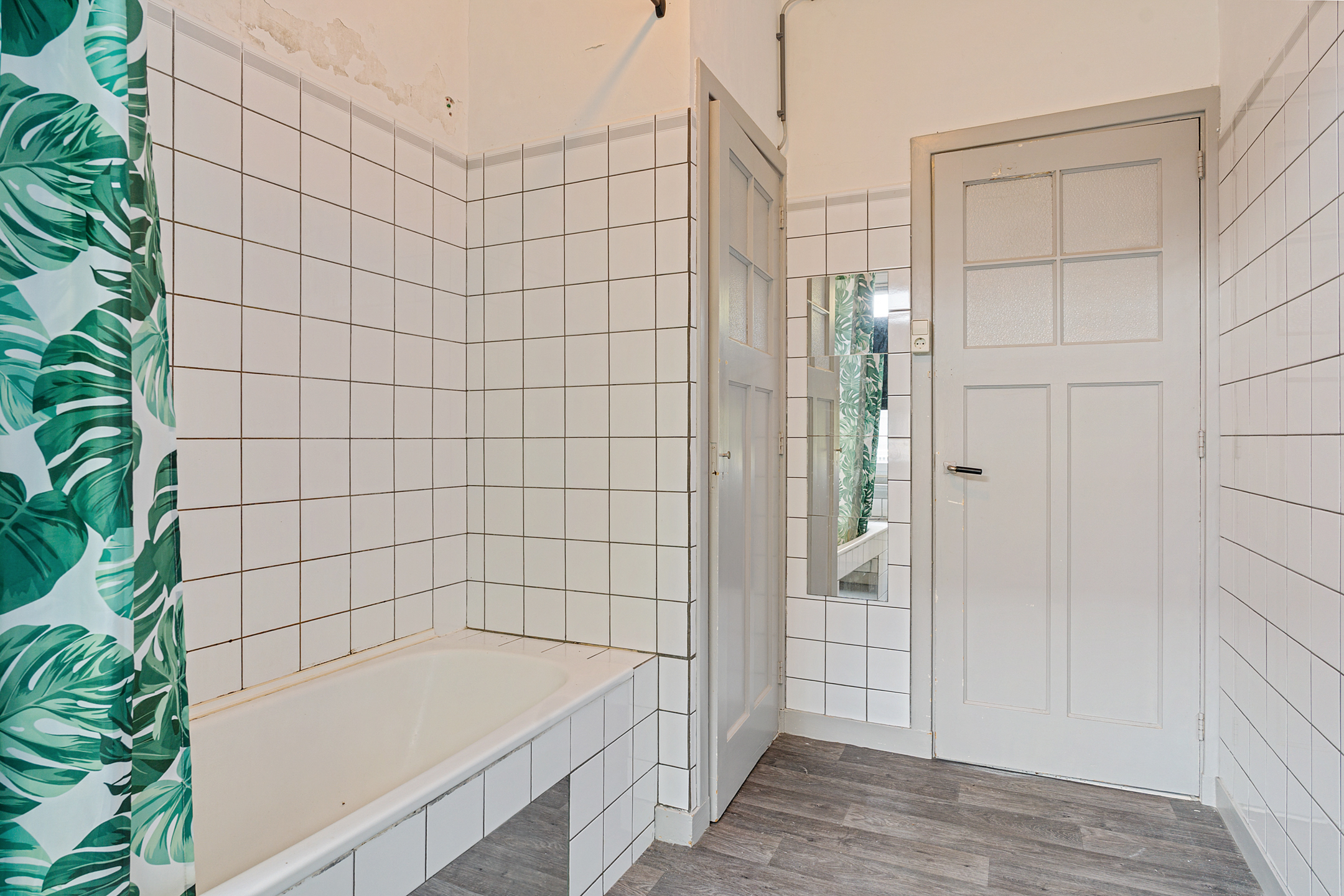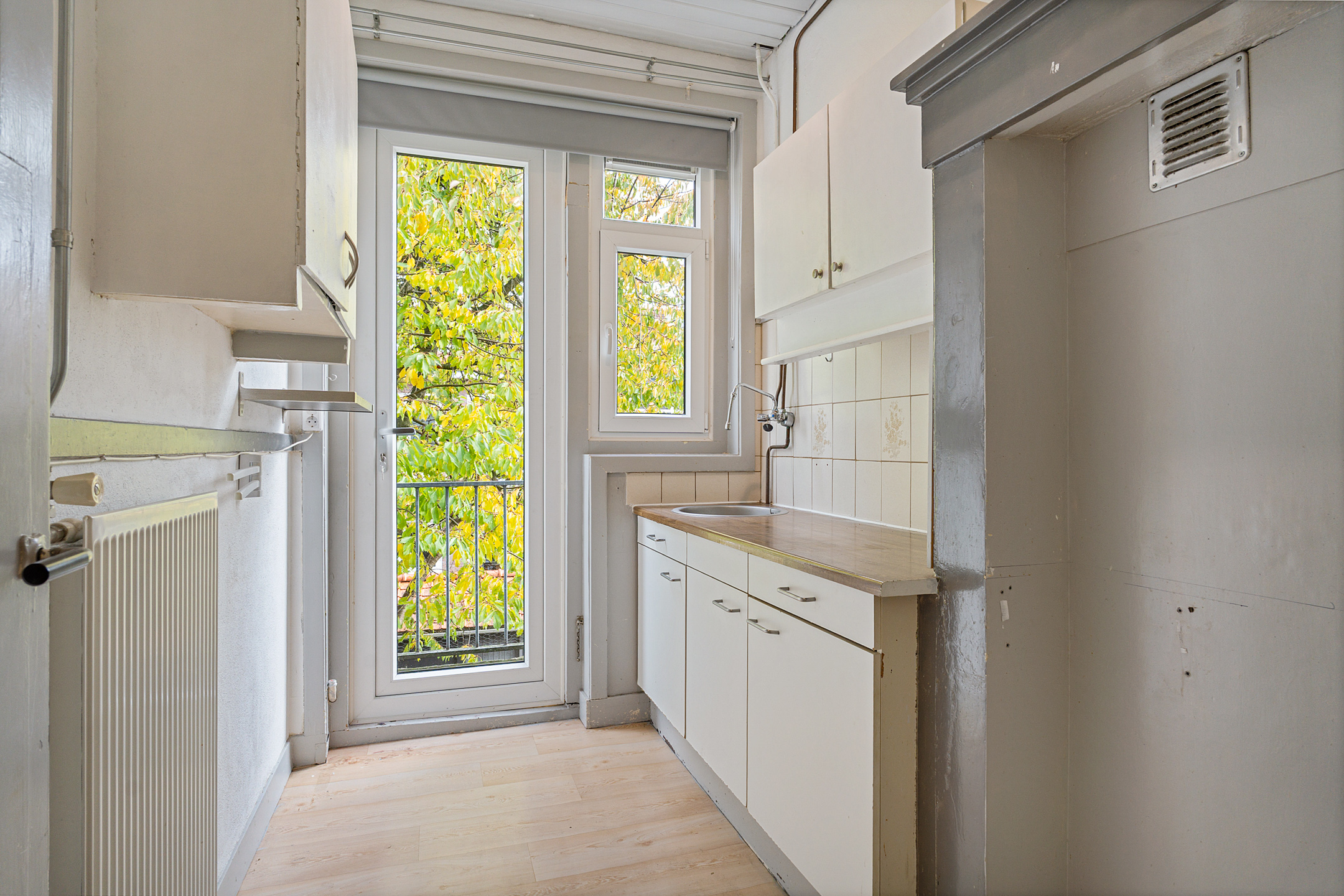 De afgesloten keukenruimte is eenvoudig uitgevoerd en biedt eveneens toegang tot het balkon. De basic badkamer is voorzien van een ligbad met douche, wastafel en een kast met wasmachineaansluiting. Aan de voorzijde bevindt zich een slaapkamer met prettig lichtinval.