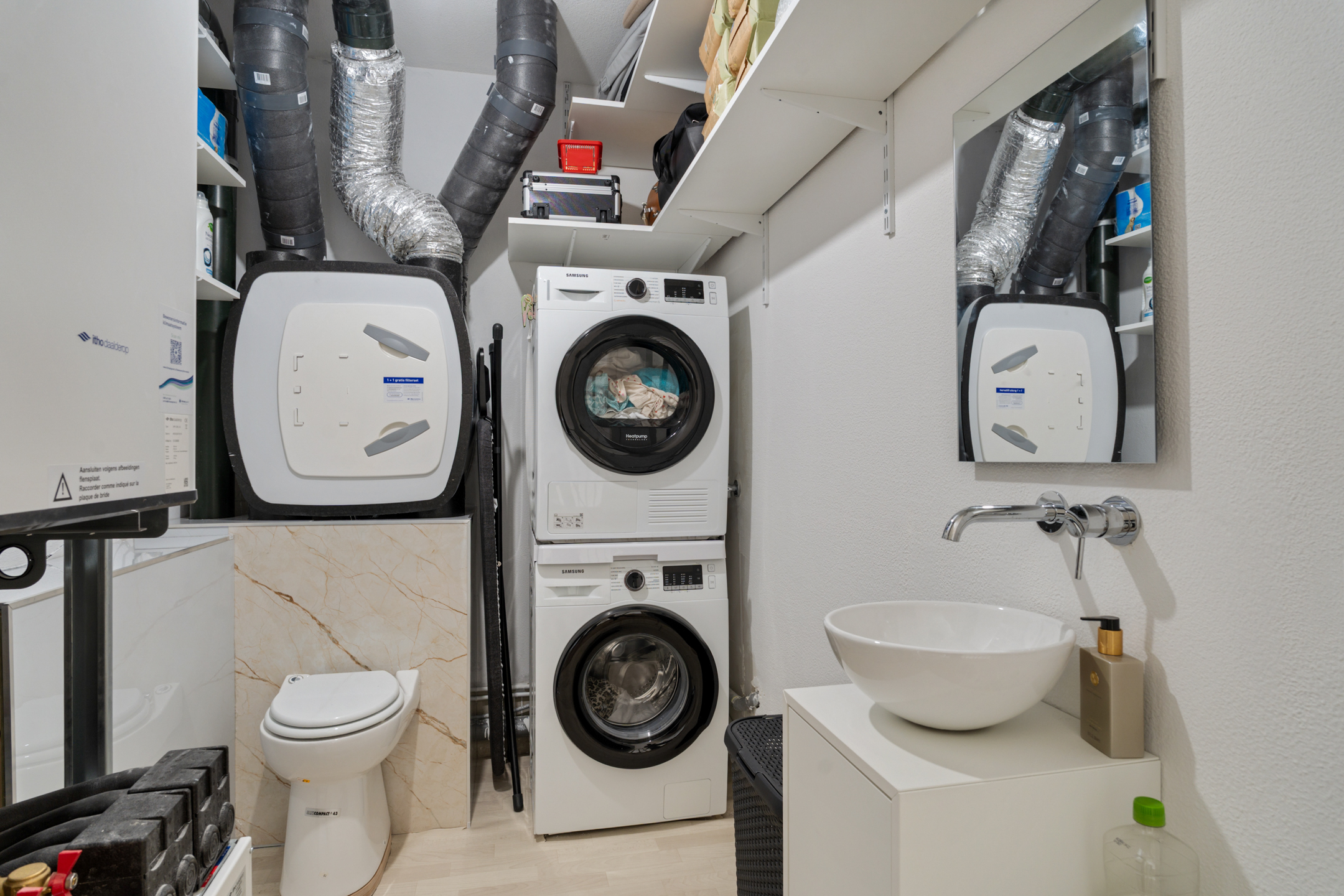 De technische ruimte bevindt zich centraal op de verdieping en is praktisch ingericht met een toilet en een wastafel. Daarnaast is er voldoende ruimte voor installaties en extra bergruimte, waardoor je de rest van de woning netjes en opgeruimd houdt.