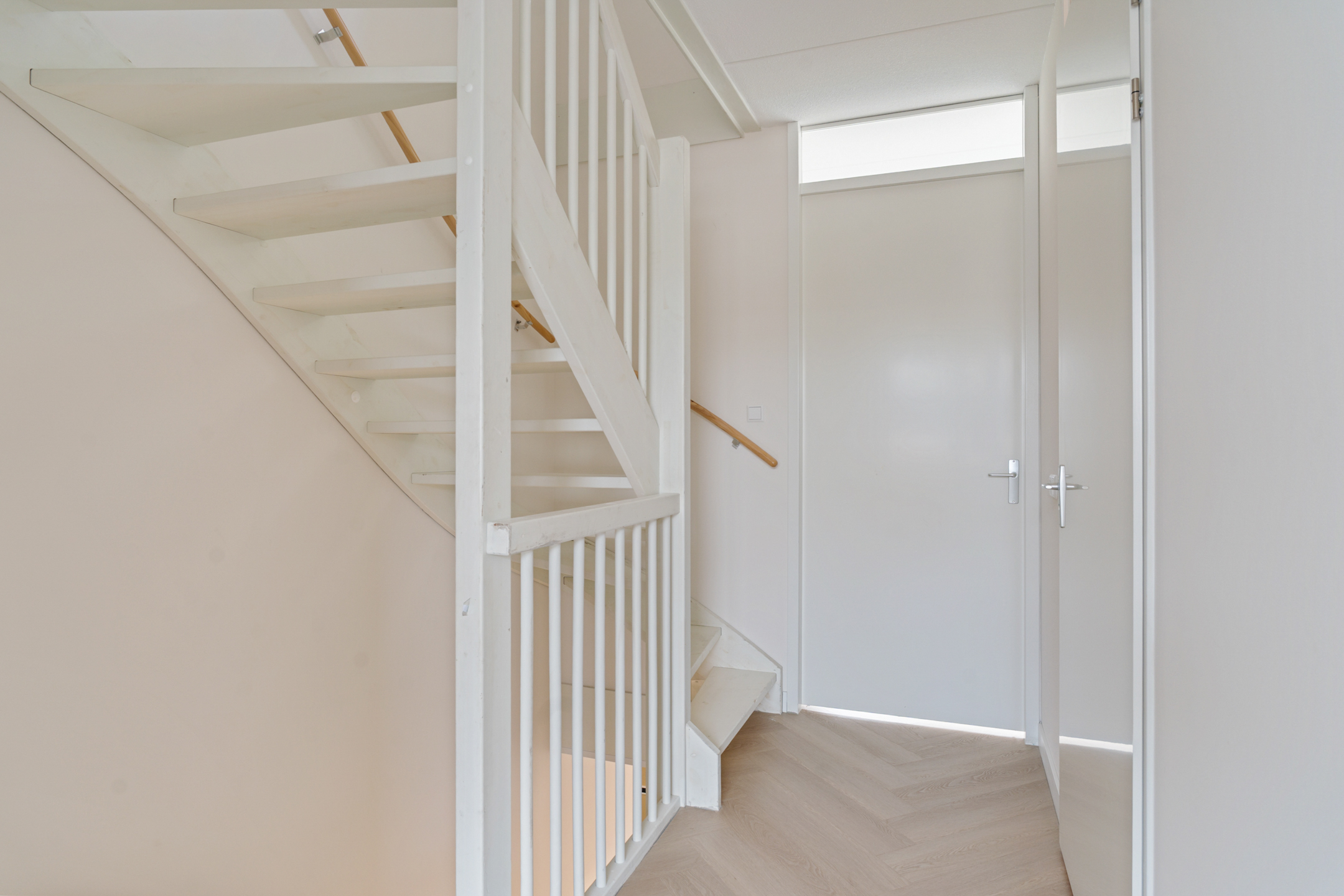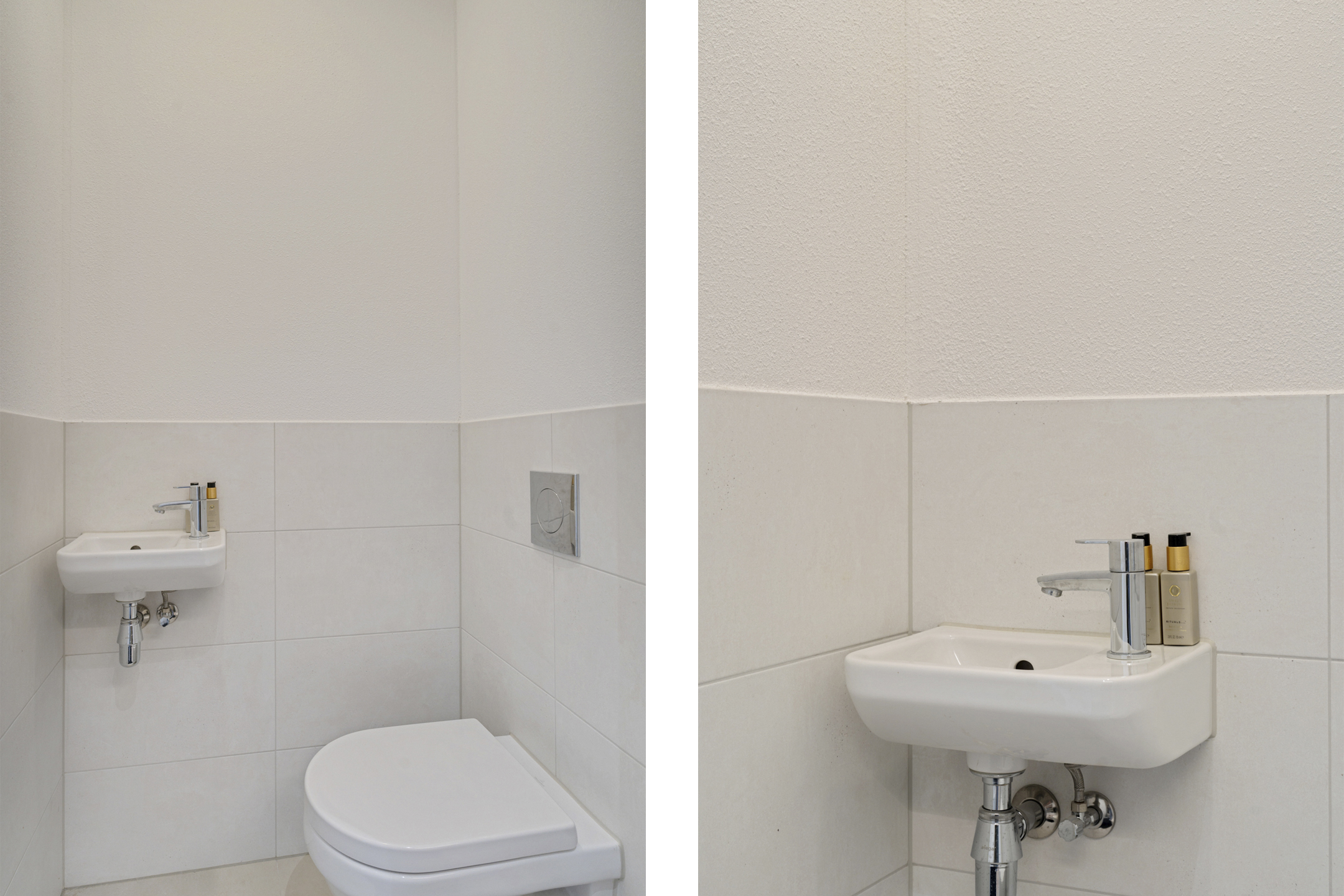 Via de nette voortuin bereik je de entree van de woning. In de hal vind je de meterkast, het toilet en de trap naar de eerste verdieping. De hal is strak afgewerkt en biedt voldoende ruimte voor een garderobe. Het toilet is modern uitgevoerd met een wandcloset en een fonteintje.
