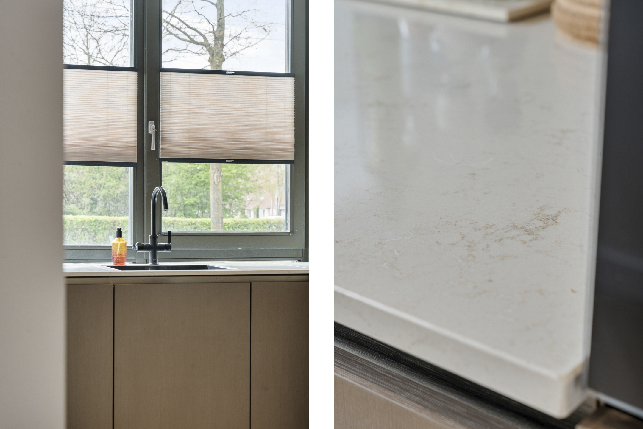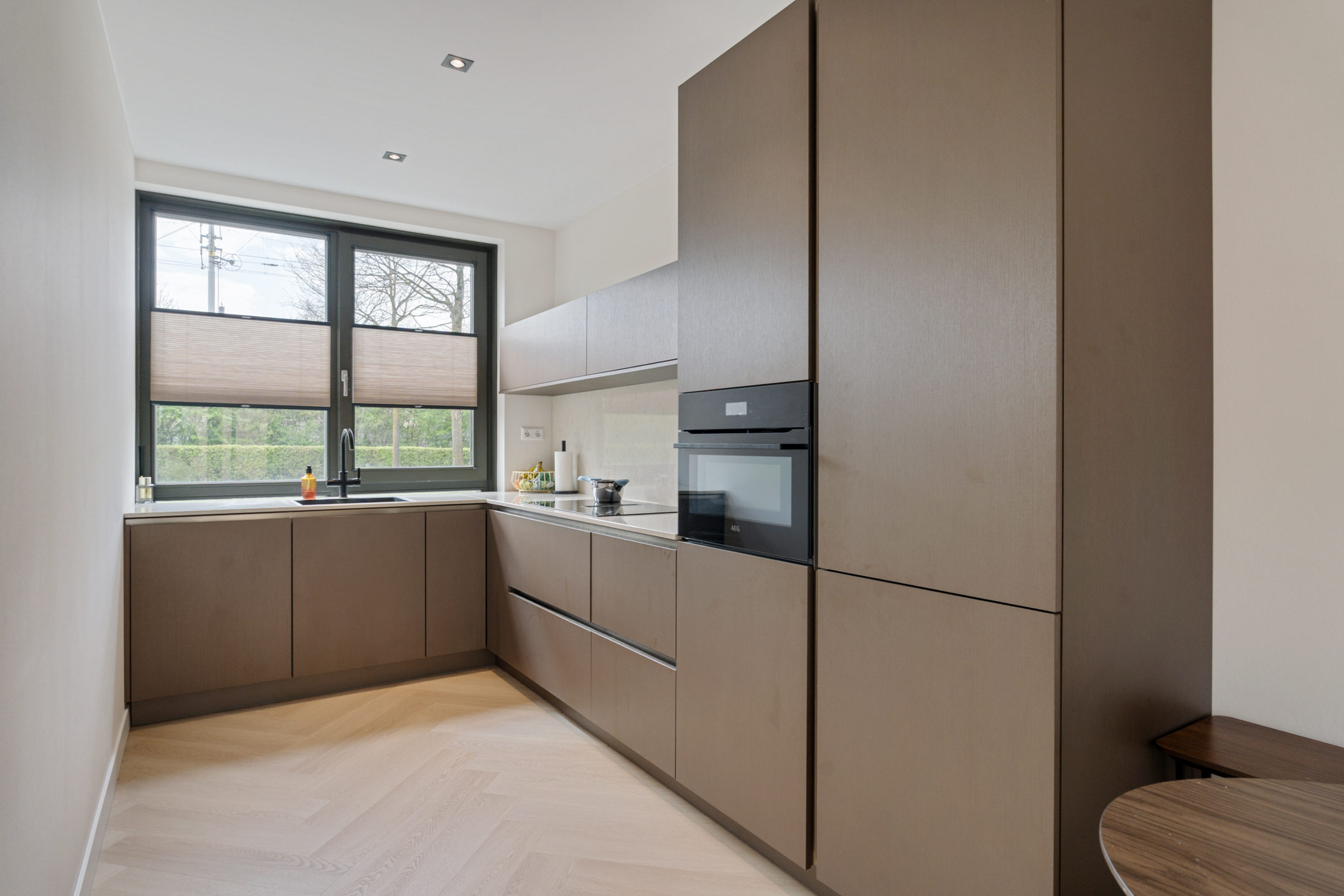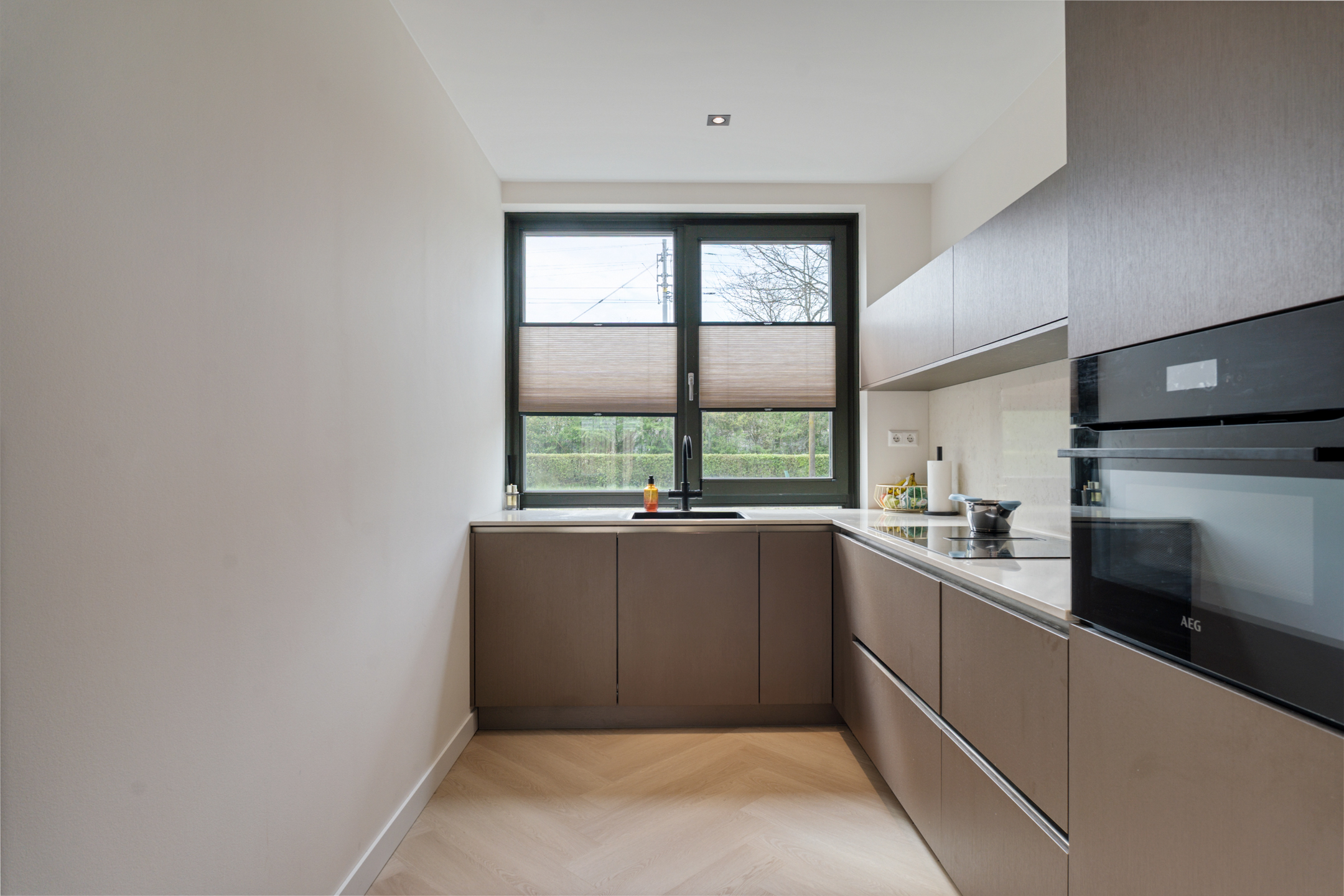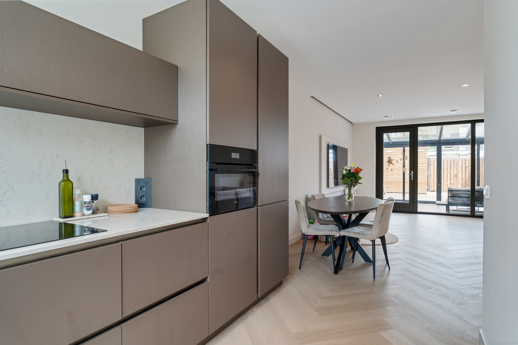Aan de voorzijde ligt de keuken, uitgevoerd in een stijlvol design met donkere kasten en een licht werkblad. Je beschikt hier over diverse inbouwapparatuur en voldoende werk- en opbergruimte. Dankzij het raam komt er prettig daglicht binnen en heb je leuk uitzicht op de straat. De open verbinding met de woonkamer maakt dit een ideale plek om te koken en tegelijkertijd contact te houden met je gezin of gasten.