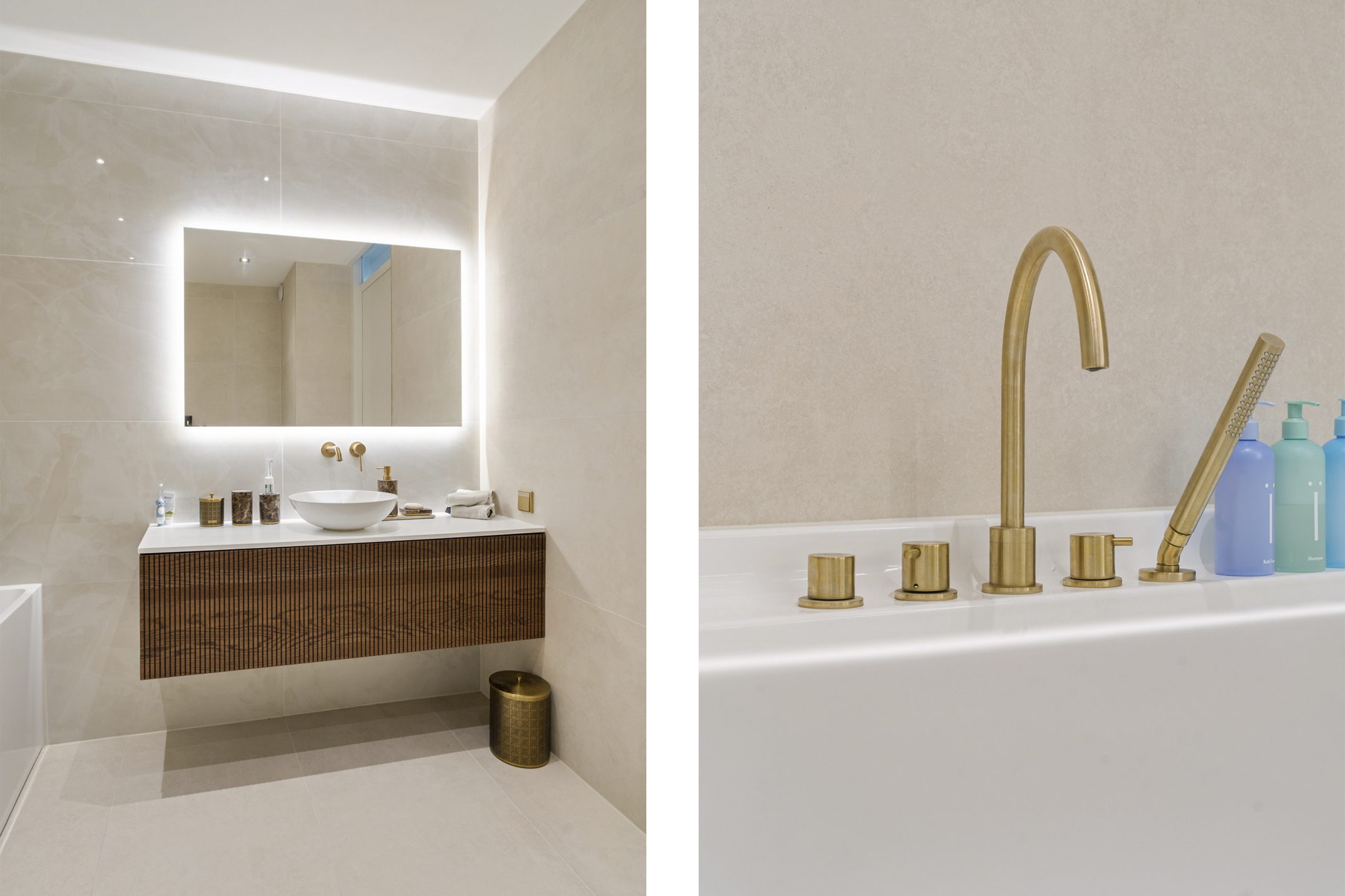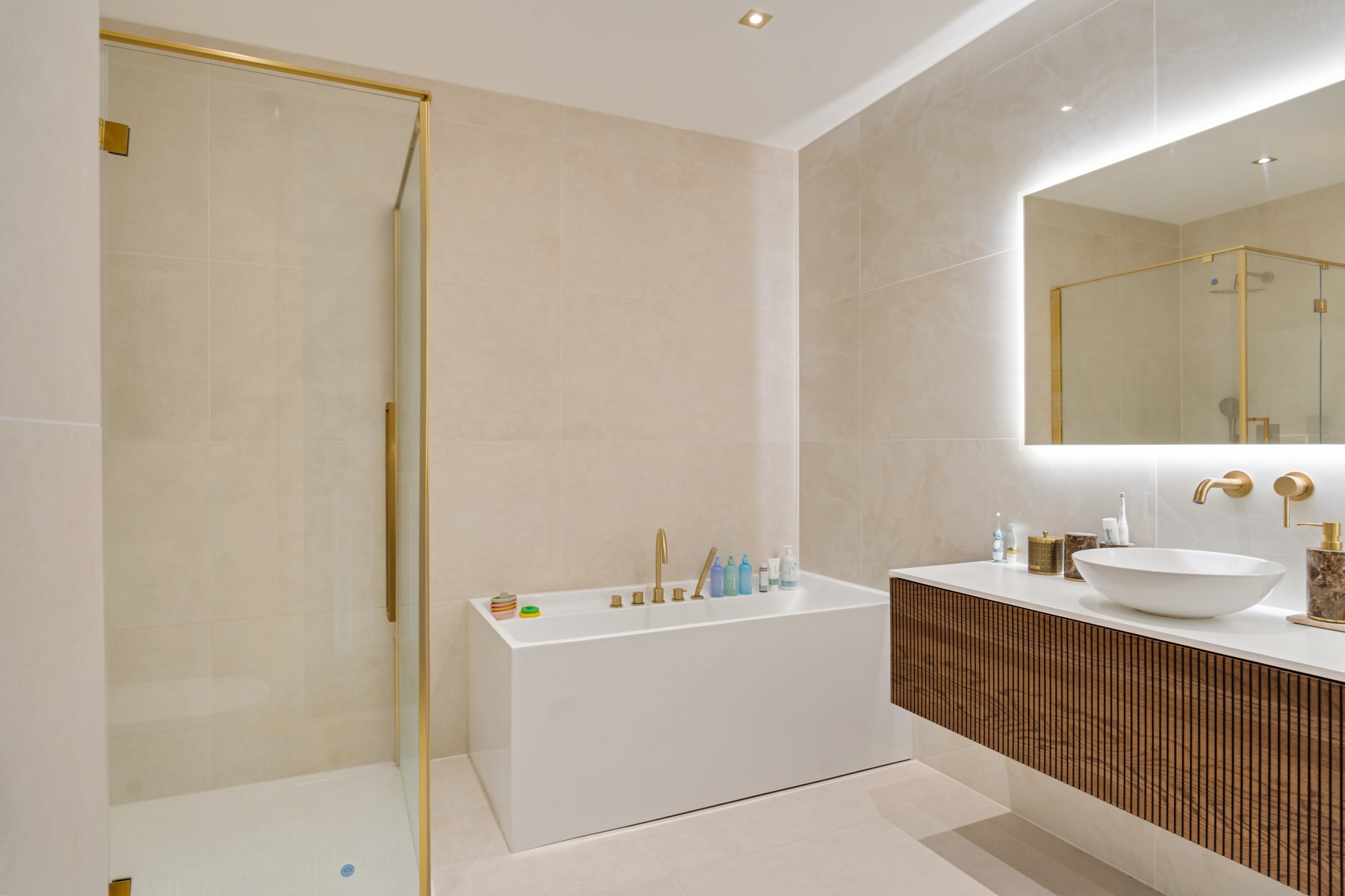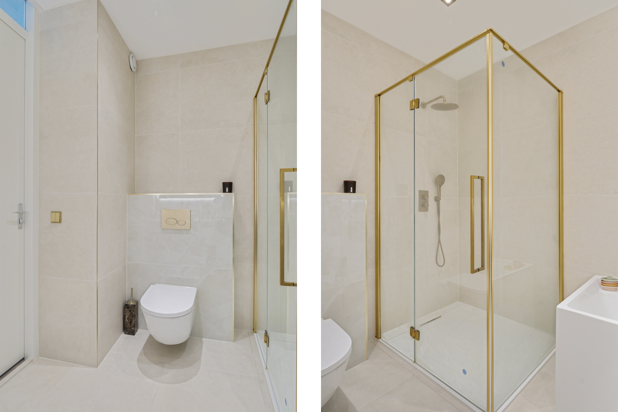 De badkamer is modern en luxe uitgevoerd en voelt als een echte eyecatcher. Je beschikt hier over een inloopdouche met glazen wand, een ligbad, wc, en een stijlvol wastafelmeubel. De warme tinten in combinatie met het fraaie sanitair en de gouden accenten geven de ruimte een chique uitstraling. Daarnaast is er een toilet aanwezig, wat het comfort compleet maakt.