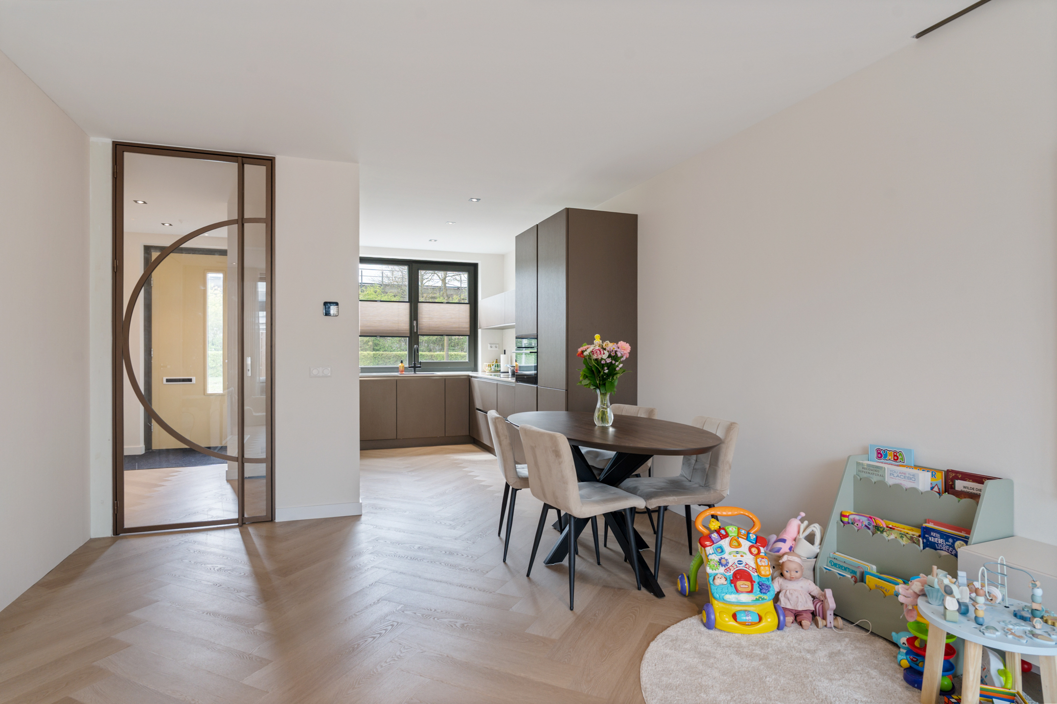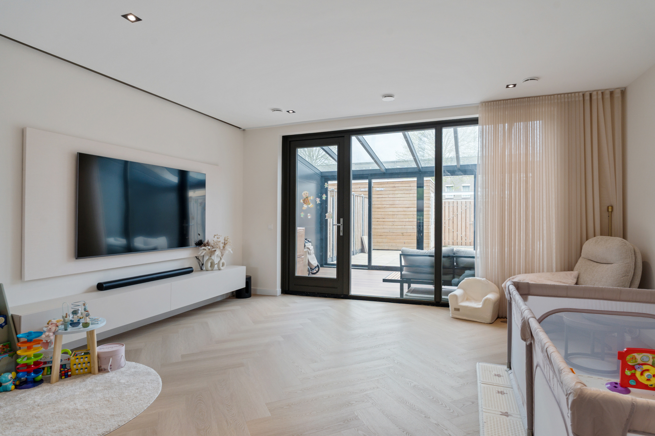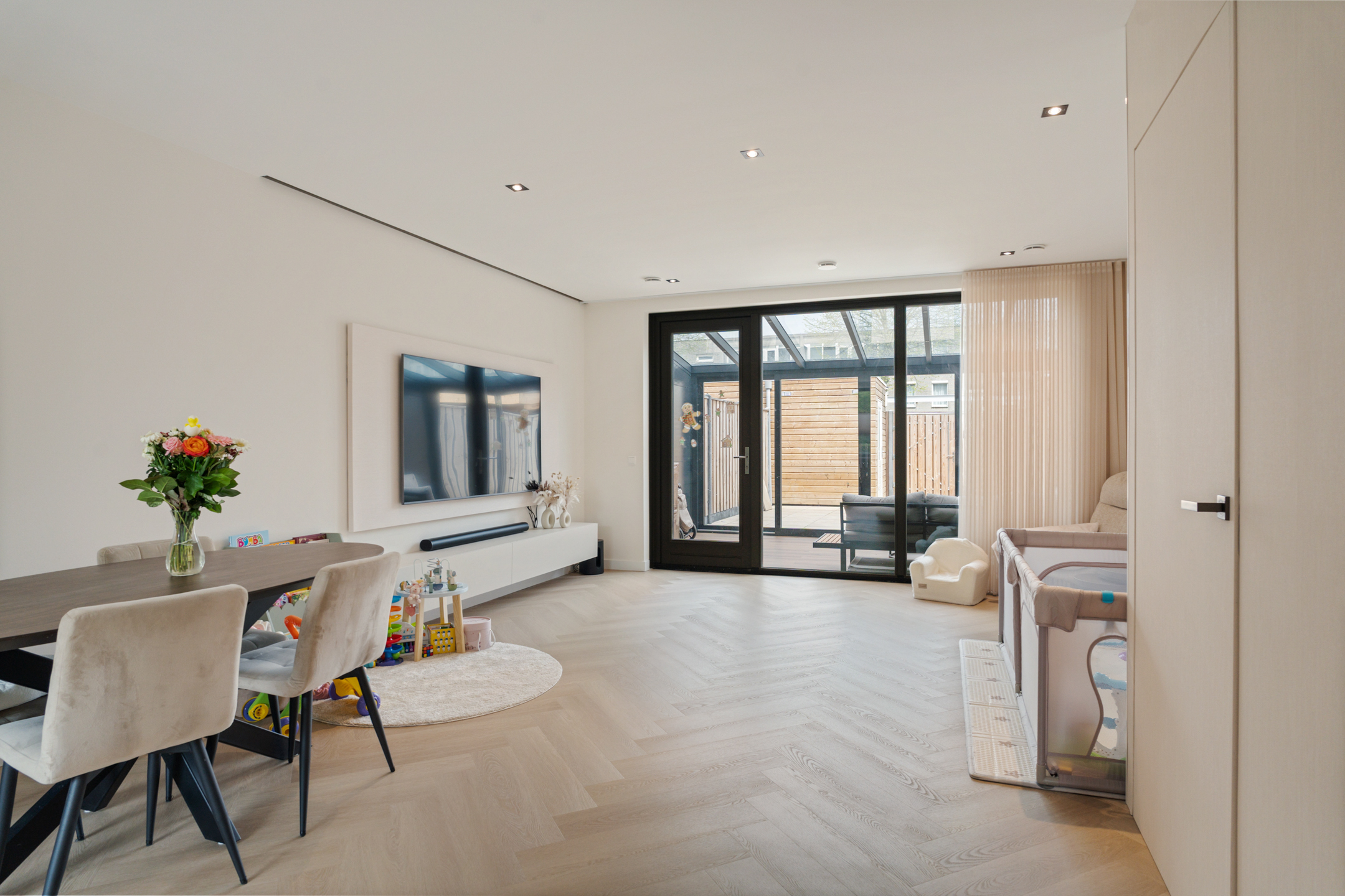 De woonkamer en keuken vormen samen een prachtige open leefruimte waar licht en comfort centraal staan. Aan de achterzijde bevindt zich de zithoek met grote raampartijen en openslaande deuren naar de serre. De visgraatvloer en strakke afwerking zorgen voor een moderne en warme uitstraling.