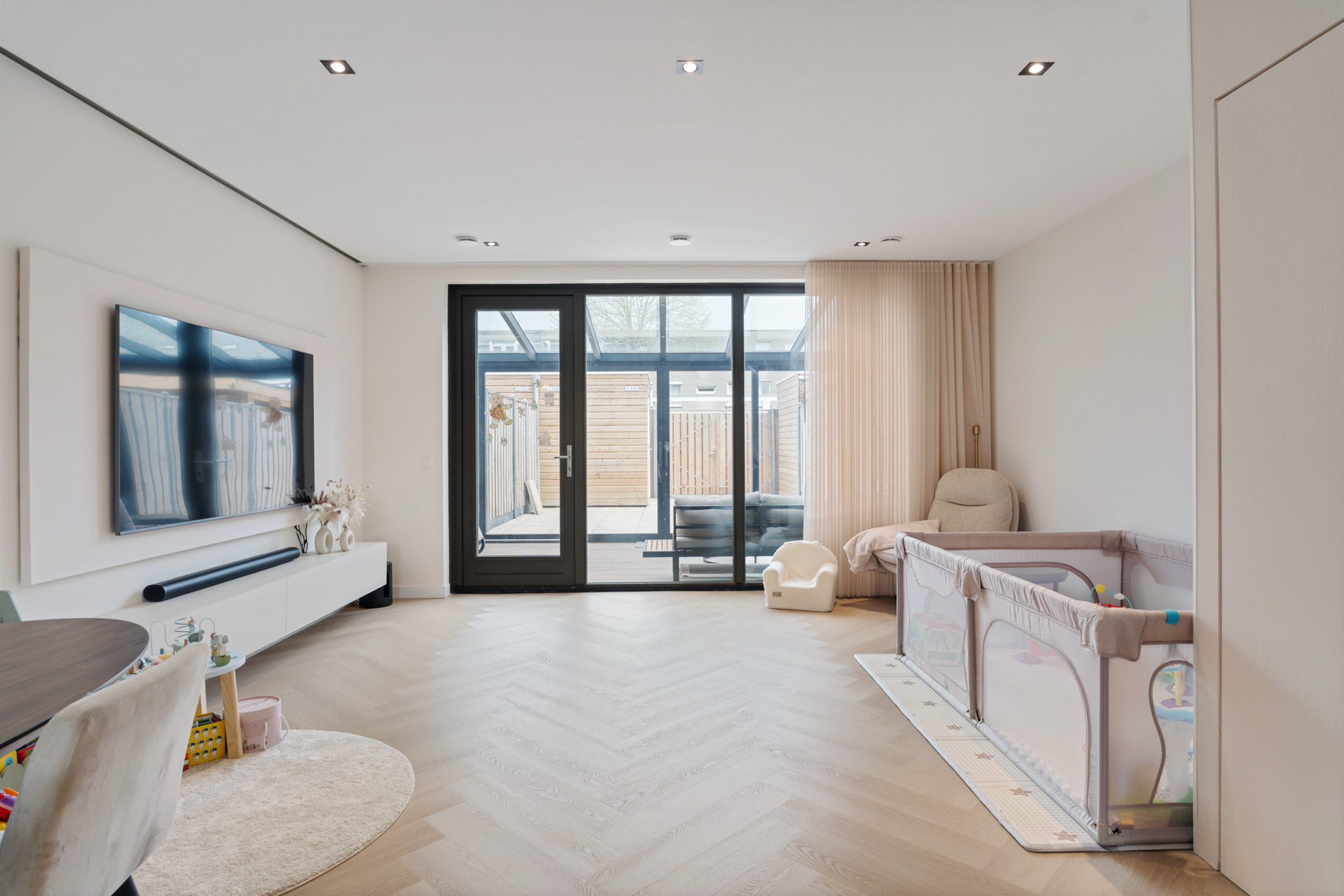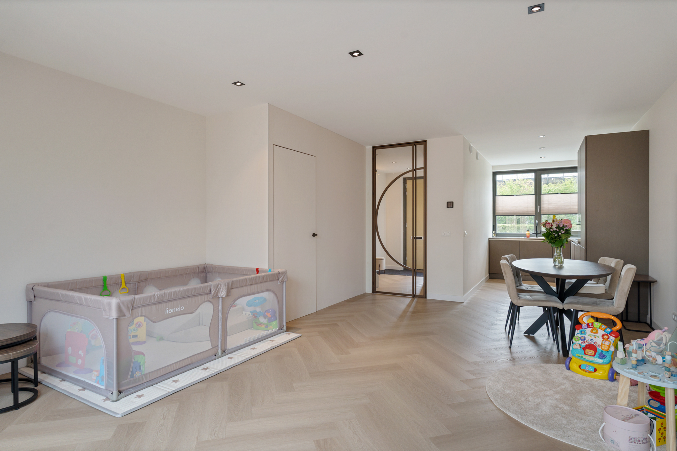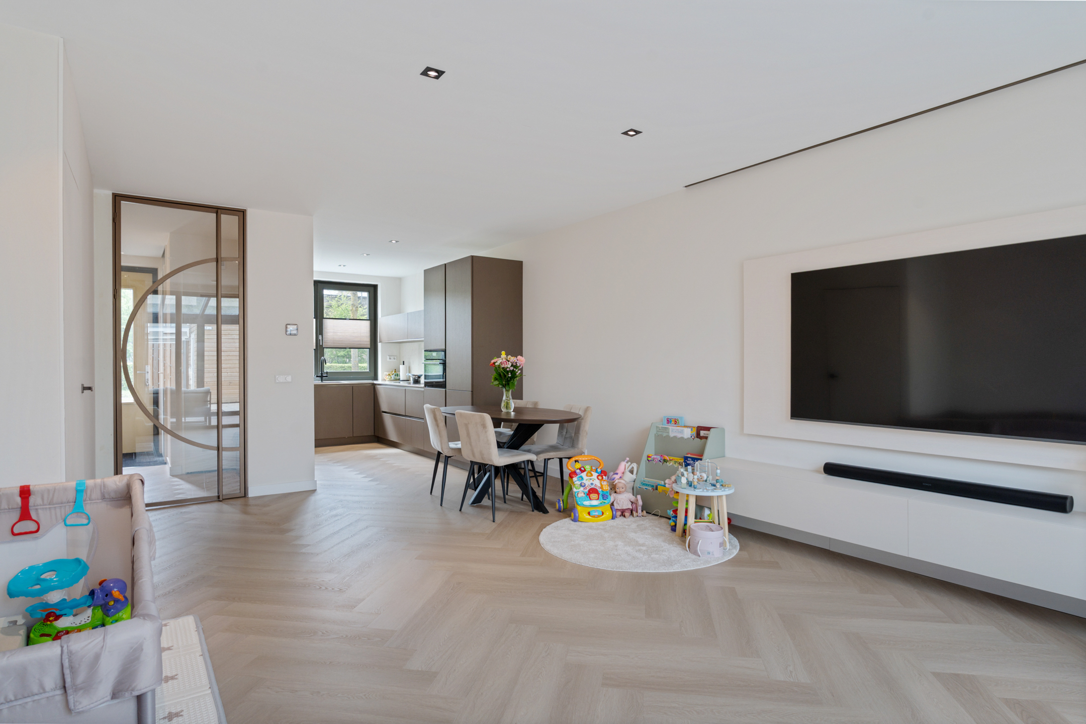De woonkamer en keuken vormen samen een prachtige open leefruimte waar licht en comfort centraal staan. Aan de achterzijde bevindt zich de zithoek met grote raampartijen en openslaande deuren naar de serre. De visgraatvloer en strakke afwerking zorgen voor een moderne en warme uitstraling.